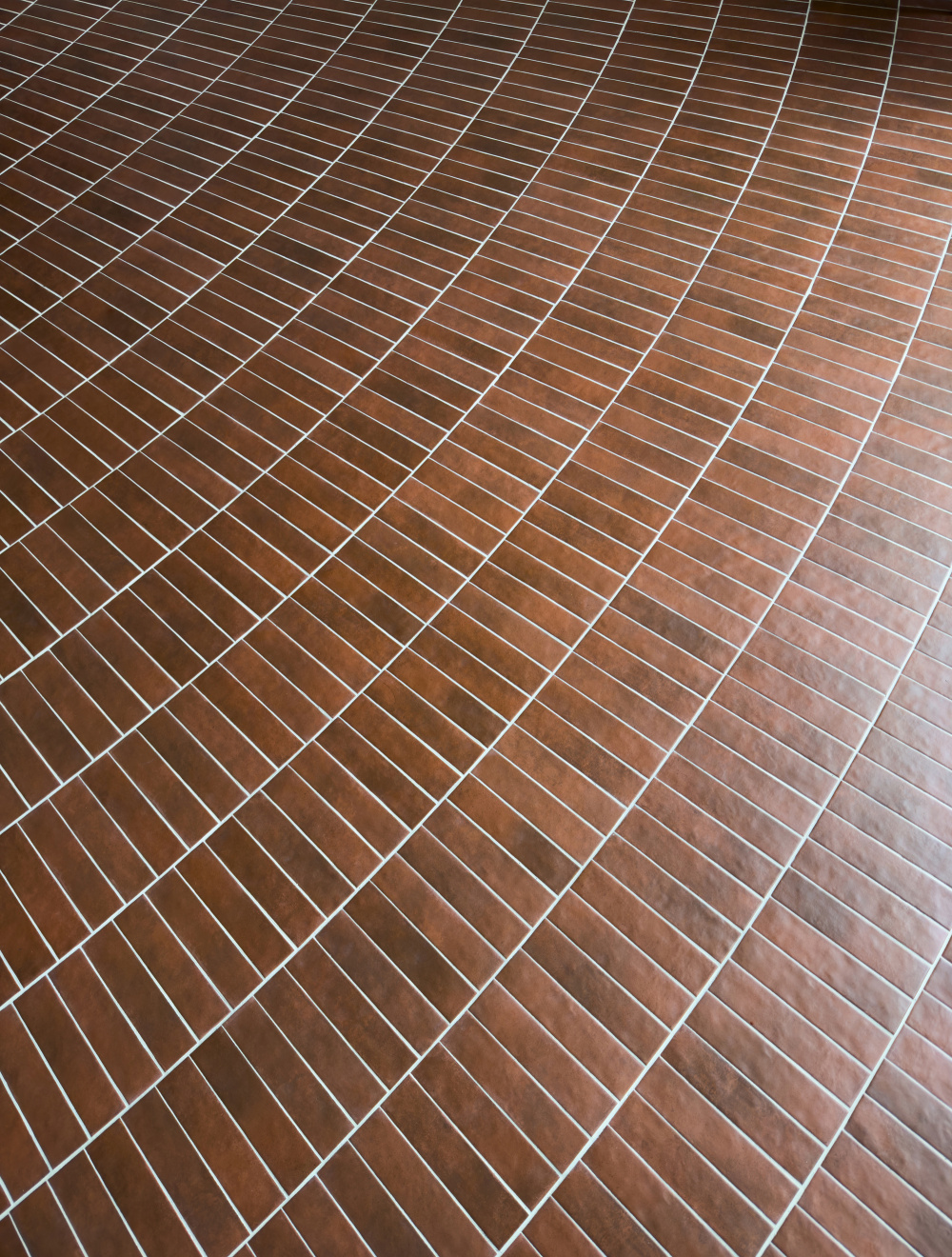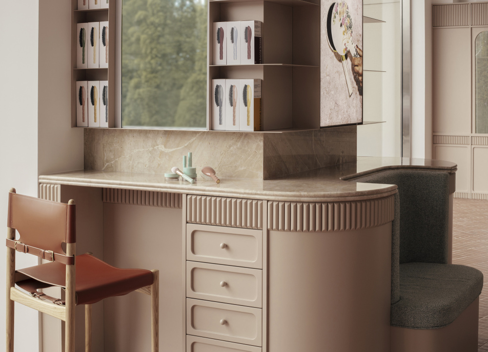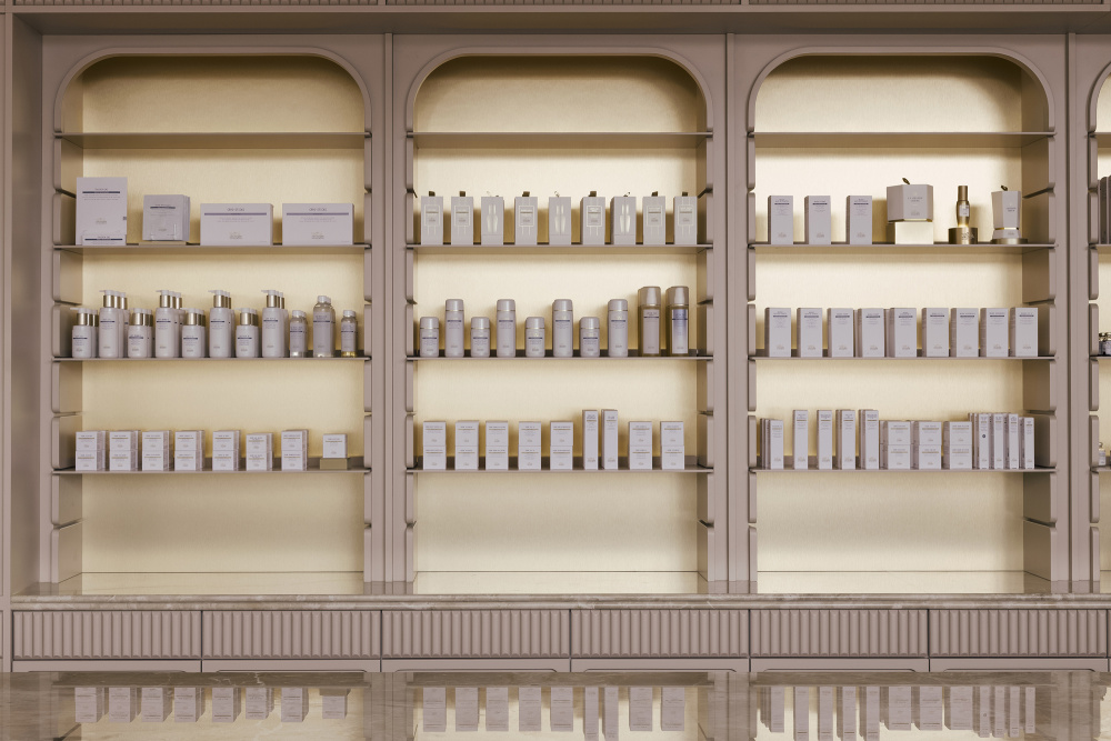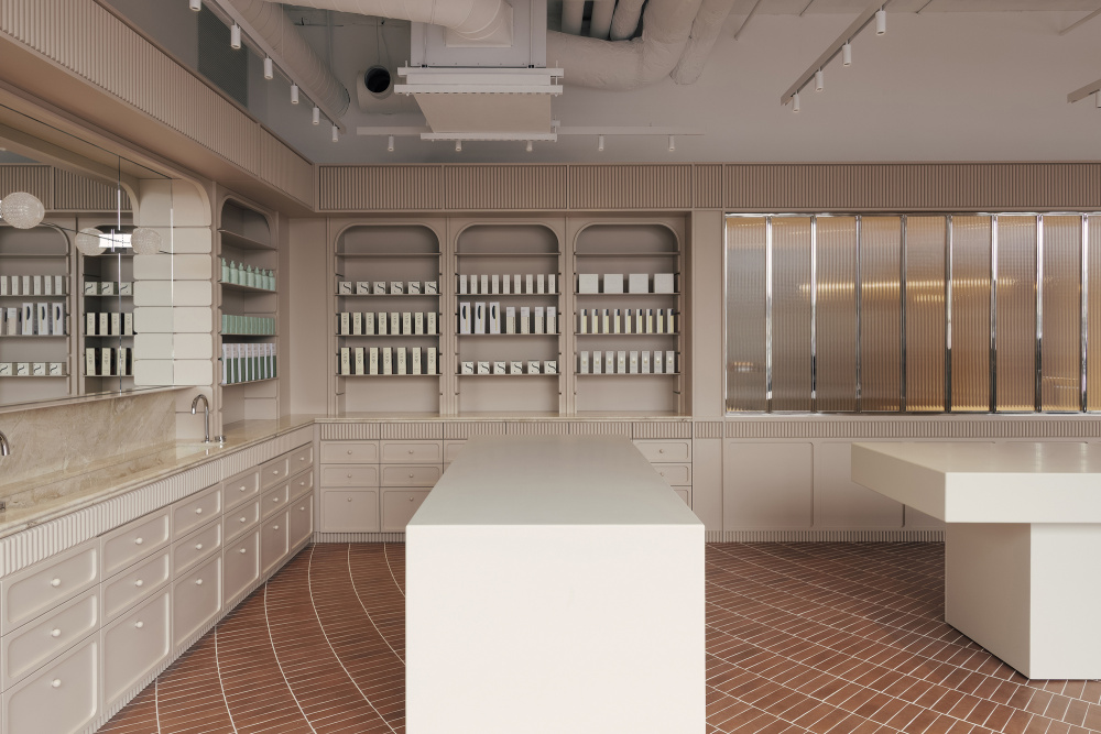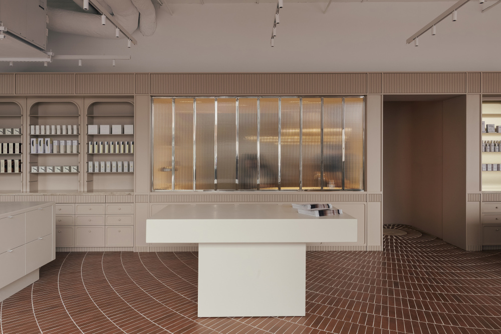 店内地面采用陶土色调瓷砖铺设出同心圆图案,形成一条醒目的视觉引导路径,将顾客的视线引向店铺与护理区的过渡区域。水疗区透过槽纹玻璃窗,巧妙呼应零售店的设计语言,同时为顾客提供休憩与放松的环境。为划分出独立的护理室,设计了一组高光质感的薄荷绿色立方体结构,与空间整体的暖色调形成对比,与镜面木作、复古壁灯及嵌入式照明相互呼应,为走廊营造出明亮通透的氛围。