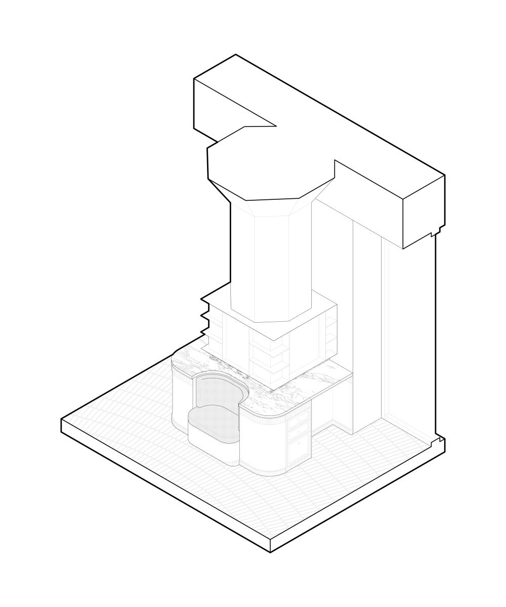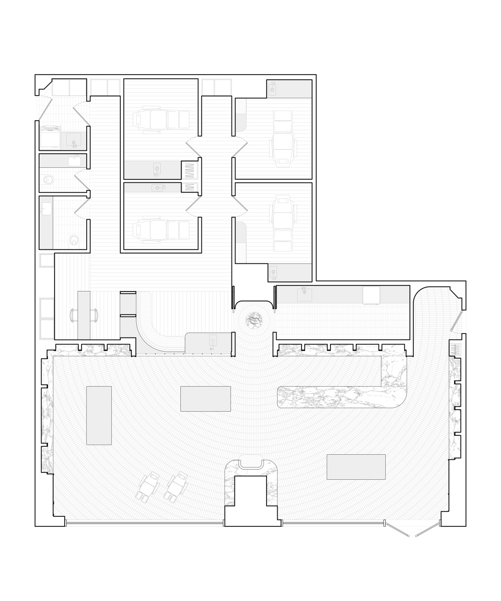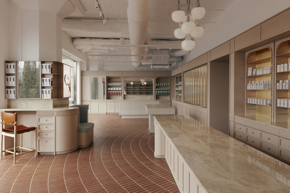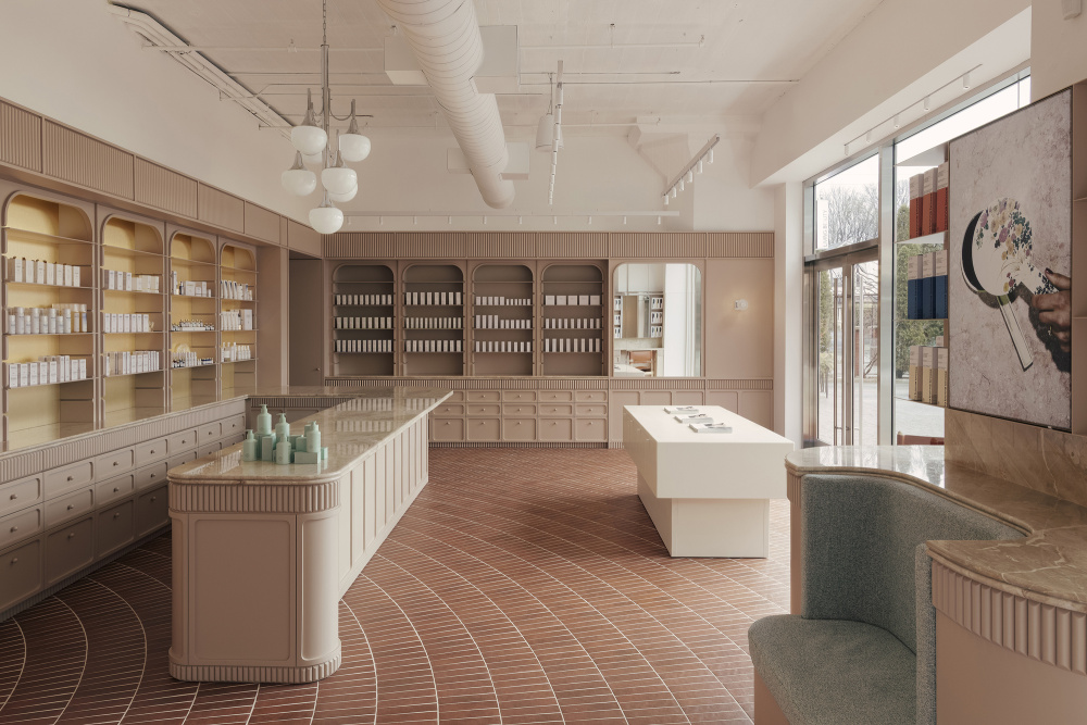 沿着空间边缘,设有带有轻微弧度的产品陈列区,这些区域配备了充足的抽屉式储物空间,形成兼具功能性与视觉吸引力的复合式布局。陈列区采用陶土色调的木作工艺,不同于传统药房的深色木材,为各类产品与品牌标识营造出明亮、统一的背景。布雷西亚奥尼恰塔大理石(Breccia Oniciata)的运用则将每个陈列区打造成了独立的服务柜台。两端带有斜切处理的圆形卷帘镶板,构建出富有韵律感的几何图案,为顾客带来丰富的质感与视觉趣味。