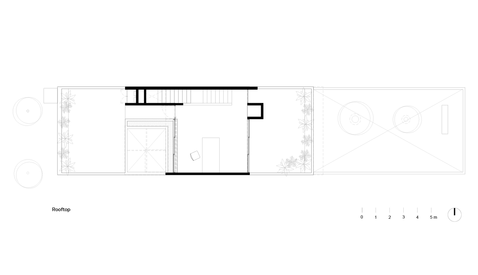 与许多只关注建筑本身的设计不同,胡安・卡诺一号住宅将“尊重场地原有生态”作为布局的起点。地块中原有的树木被完整保留,成为贯穿空间的核心元素——住宅主体刻意避开植被区域,建于地块前部无植被的临街地带;地块后方则依托树木开辟出庭院,形成“街道-住宅-庭院”的东西向功能轴线,这条轴线成为串联所有空间的“隐形骨架”。轴线的价值不仅在于空间划分,更在于统筹了景观、动线与功能:面向街道的住宅前部承担着与城市的互动功能,入口区域便捷开放;中部的垂直交通系统串联各层,实现高效流转;后部的庭院则是家庭生活的核心,为住户提供了全天候可用的户外空间,无论是晨间晨练、午后休憩还是晚间聚会,都能在此找到适宜的场景。这种布局让狭窄的地块被充分激活,形成“前接城市、后拥自然”的空间格局。