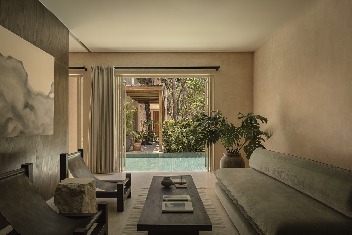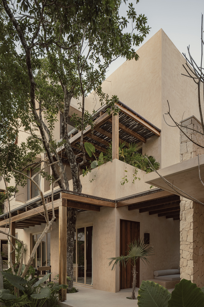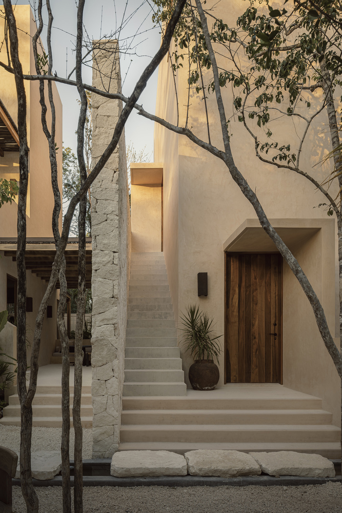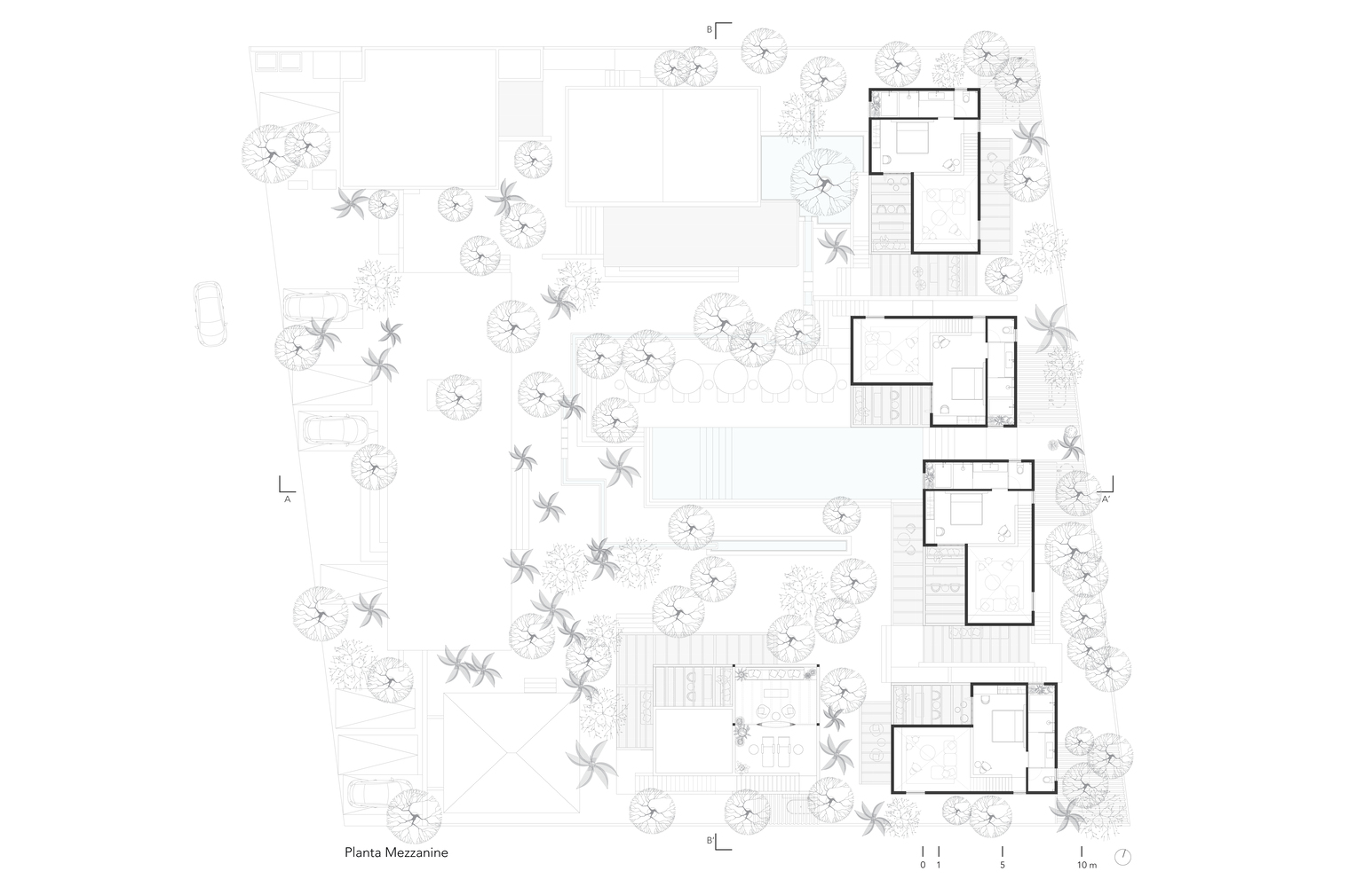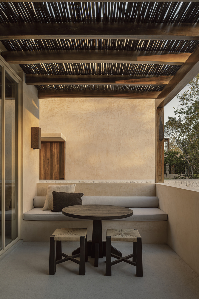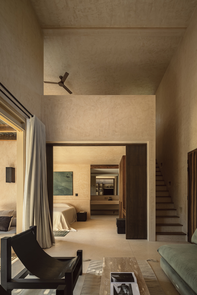 酒店共有 10 间客房,分为两种不同类型。底层客房采用水平向的空间布局,通过露台和露天浴室与周边环境形成直接连接。上层客房则呈现垂直向的空间体验,包含一个双层挑高的社交空间和两间带完整卫浴的套房(通过夹层设计实现)。这种设计使得空间开阔通透、通风良好,非常适合图卢姆炎热的气候。