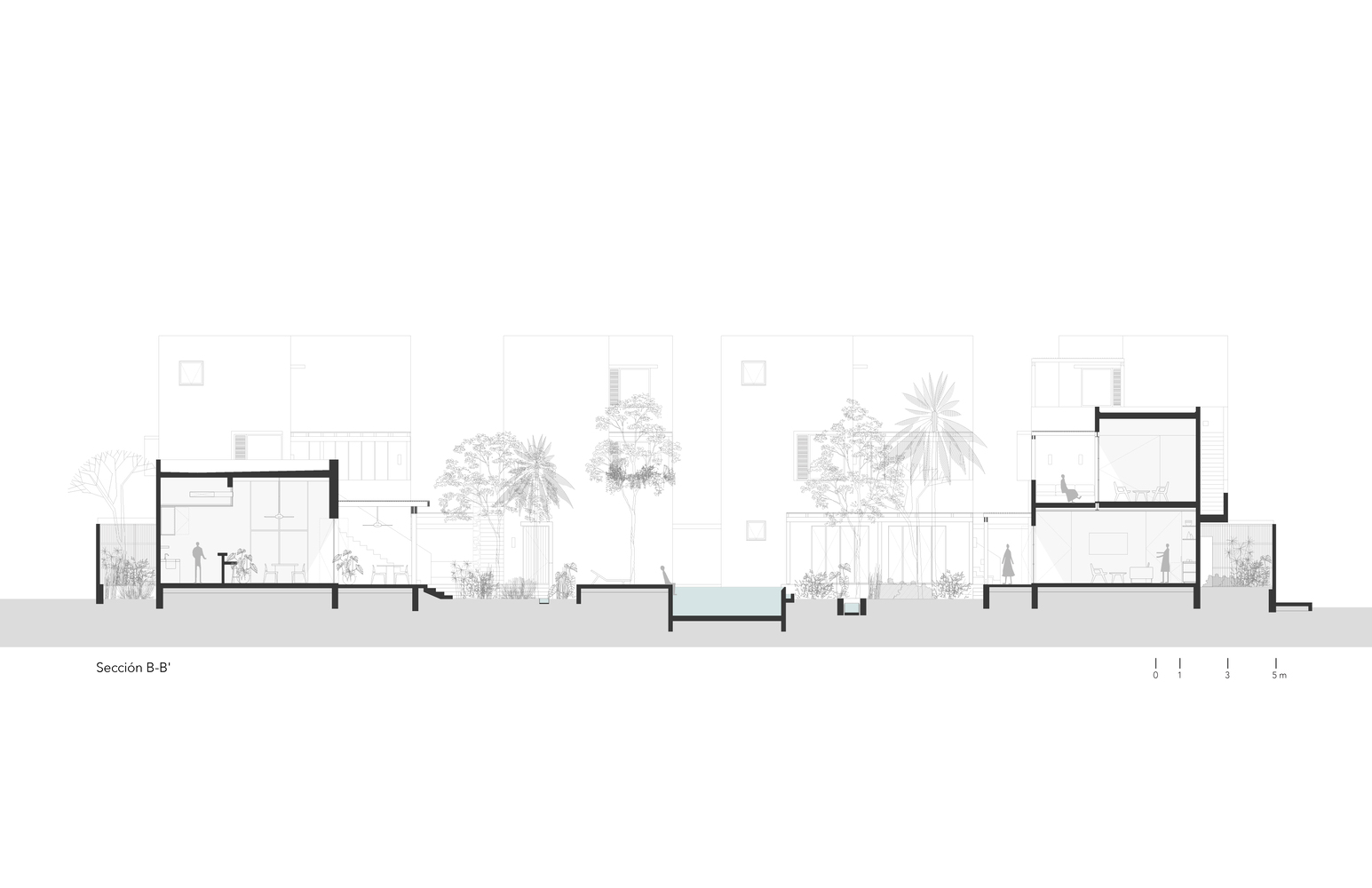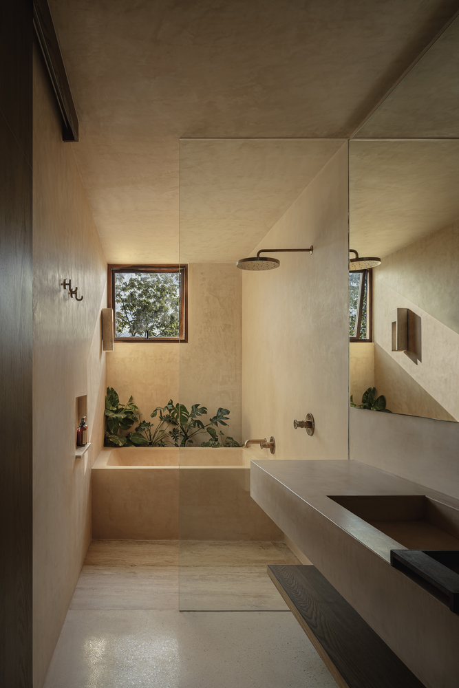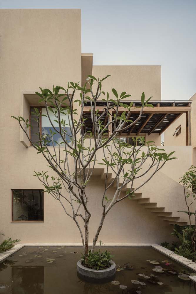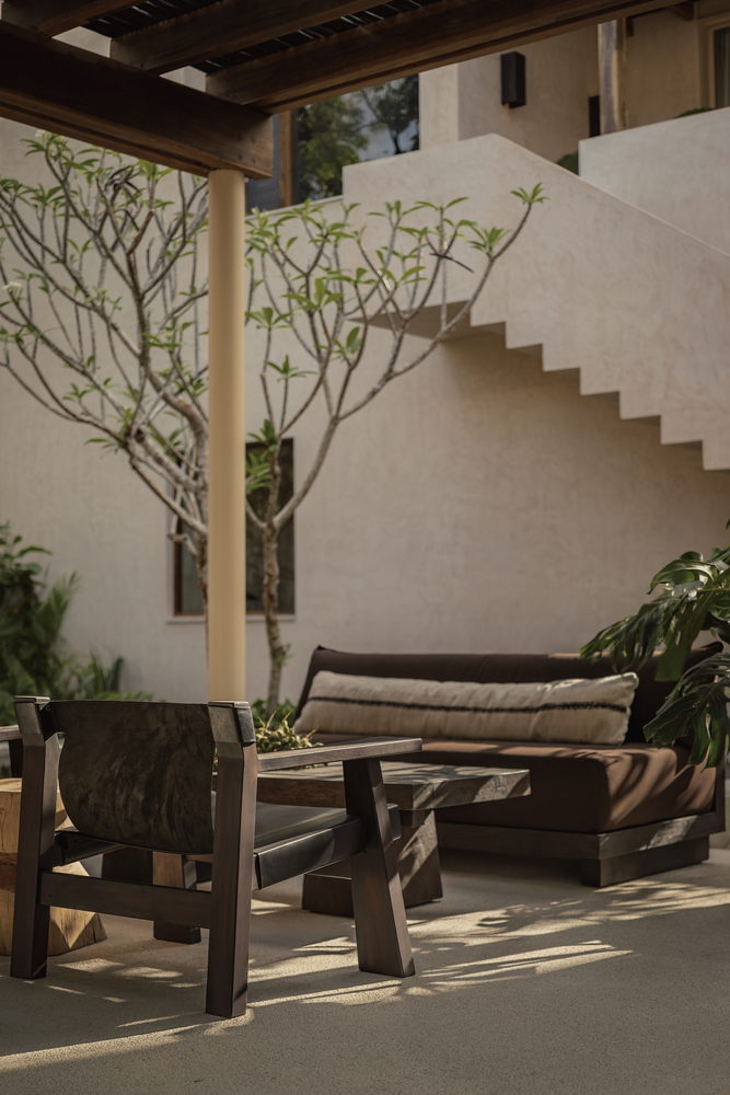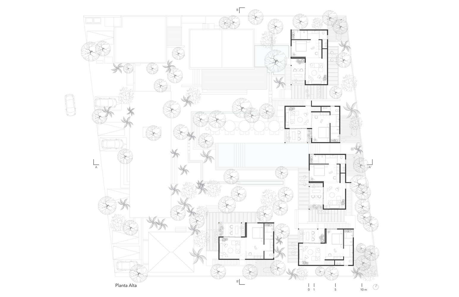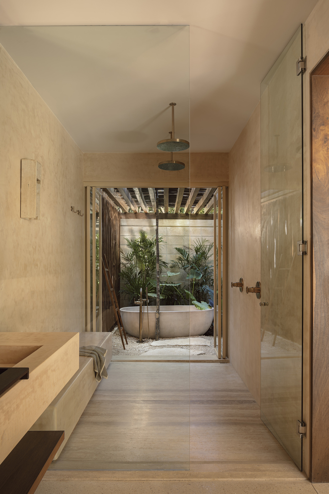 酒店共有 10 间客房,分为两种不同类型。底层客房采用水平向的空间布局,通过露台和露天浴室与周边环境形成直接连接。上层客房则呈现垂直向的空间体验,包含一个双层挑高的社交空间和两间带完整卫浴的套房(通过夹层设计实现)。这种设计使得空间开阔通透、通风良好,非常适合图卢姆炎热的气候。
