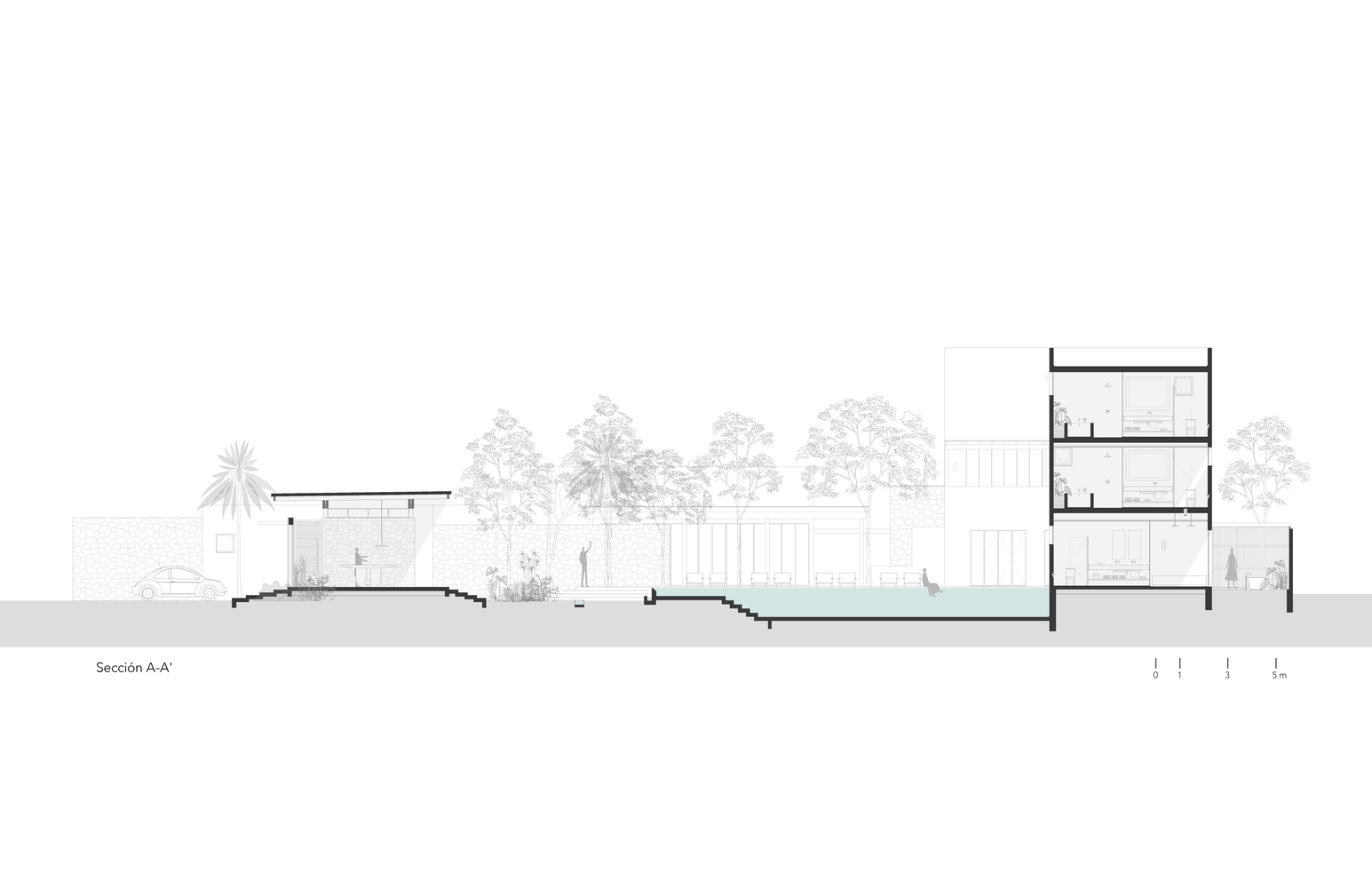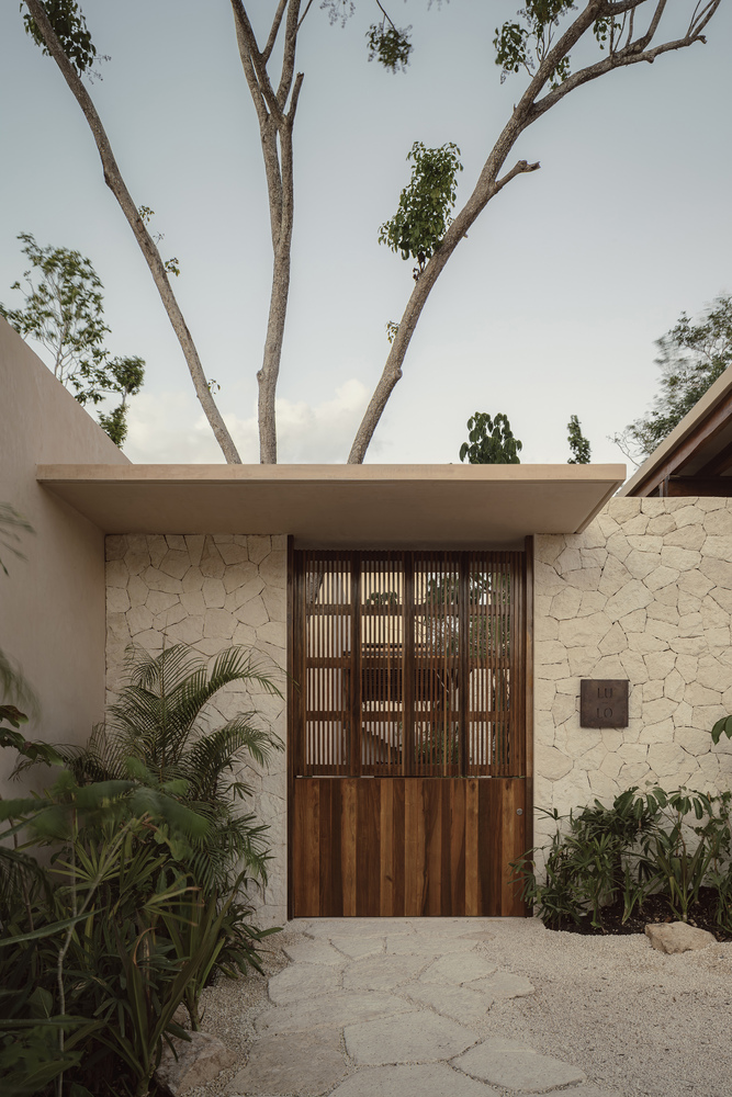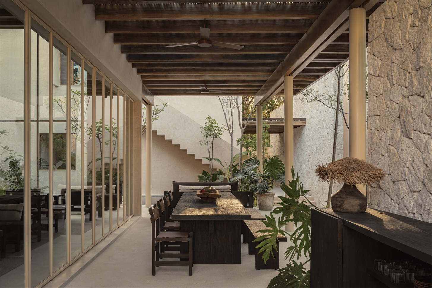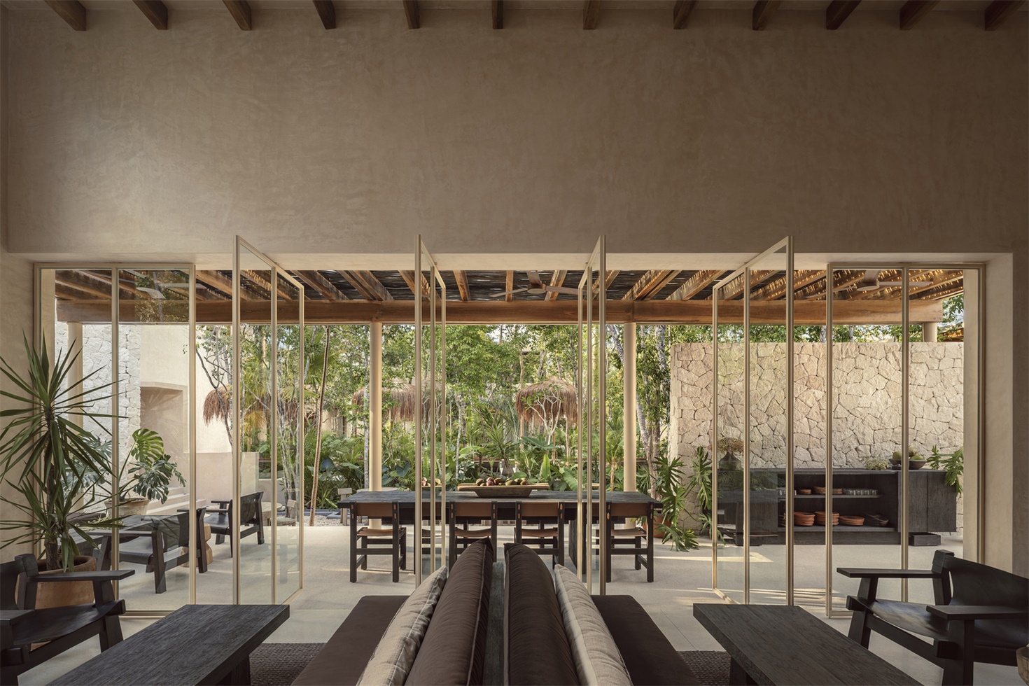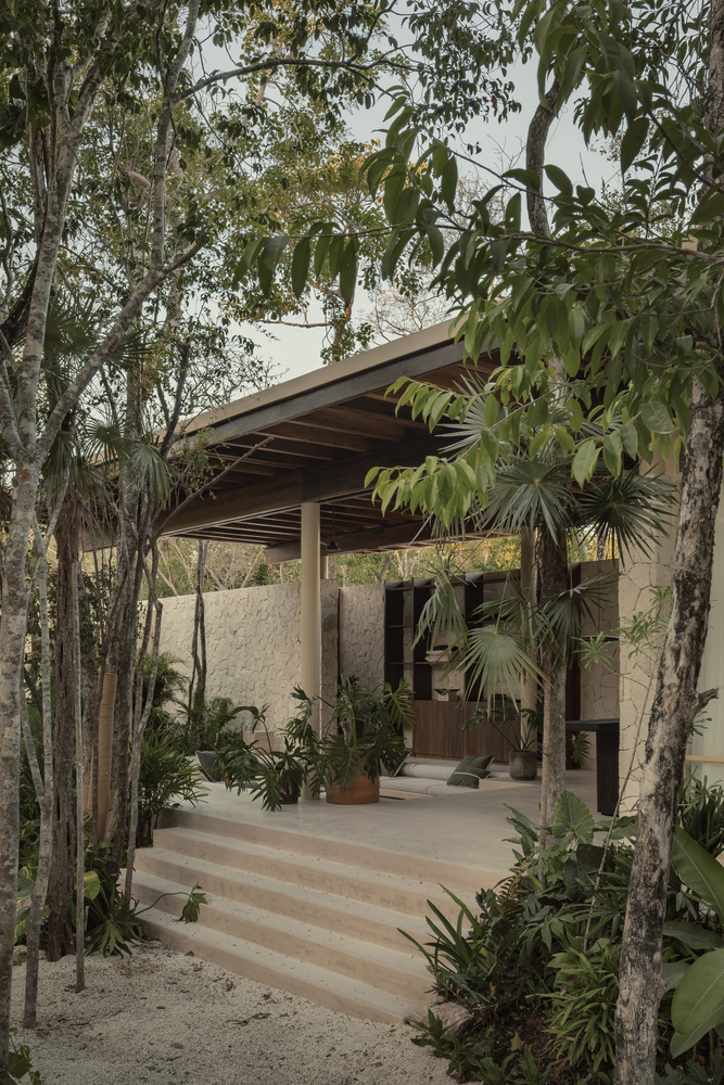 建筑在需要营造私密与内敛氛围时,呈现出封闭厚重的形态;而在需要与景观及泳池区域形成视觉连接的社交空间中,则以通透开放的姿态呈现。接待区被设计为线性亭阁,底部采用混凝土与楚克姆(chukum)材料,顶部覆盖轻盈的木质结构,仿佛漂浮在植被之间 —— 这得益于纤细的支柱与周围树木融为一体的设计。餐厅为双层挑高空间,设有开放式厨房,朝向高出自然地面 1 米的宽敞露台。最后,石灰岩墙体作为空间秩序的塑造元素,划分出不同区域的边界与过渡。