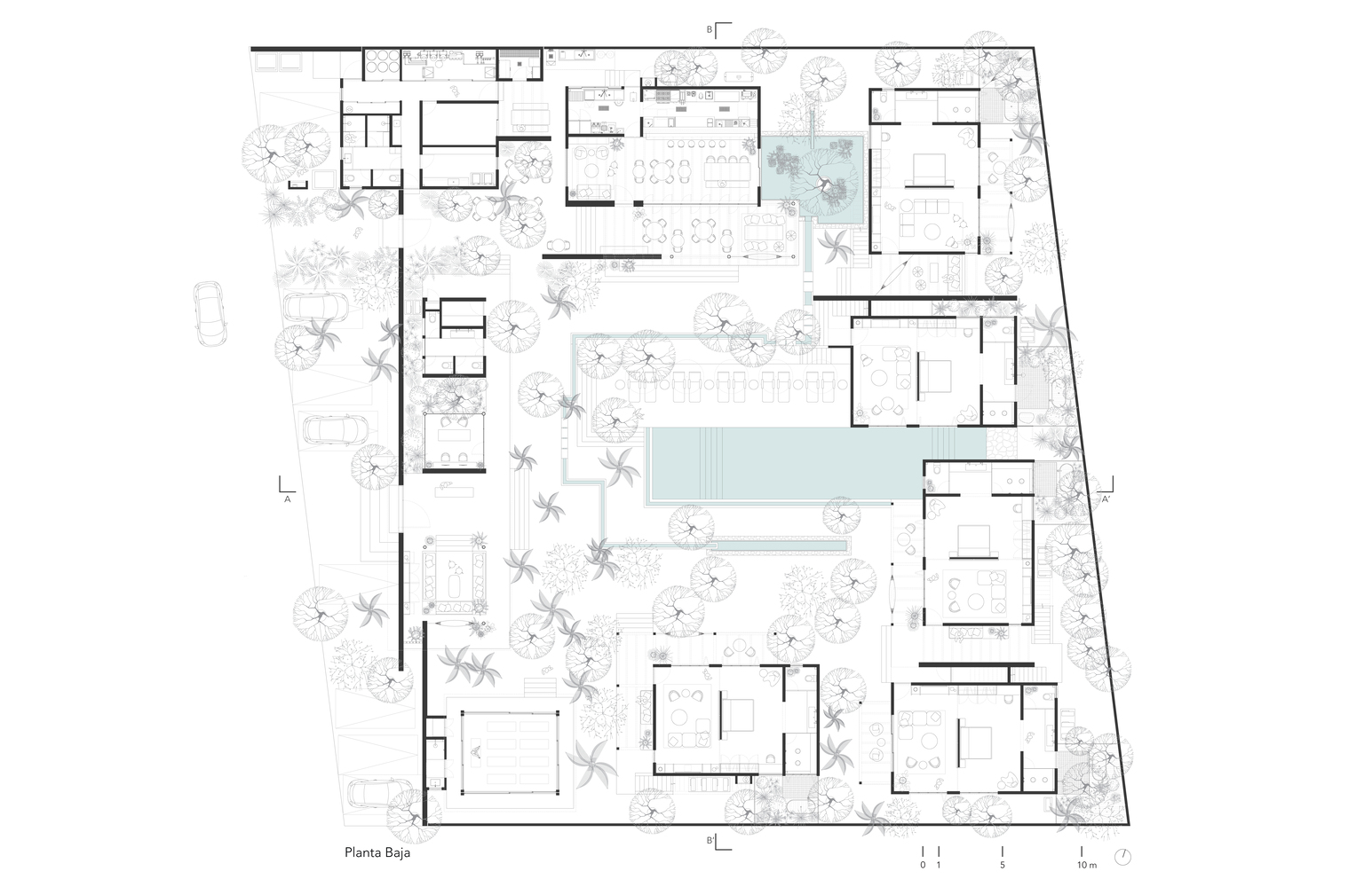 纳博亚民宿设计(Naboa)位于图卢姆(Tulum),坐落在一块 2500 平方米的方形地块上。该项目的设计初衷是打造一座建筑与景观交融的空间,营造出放松舒适的氛围。这一理念通过纯粹有序的几何形态得以体现,与场地中原有的自然植被形成无序与随机的对比。建筑体块围绕泳池和热带花园布局,而泳池与花园则成为整个项目的核心轴线。这种布局赋予了整体空间一种内敛的特质,不仅营造出独特的微气候,保障了私密性,更为项目塑造自身特色创造了理想条件。