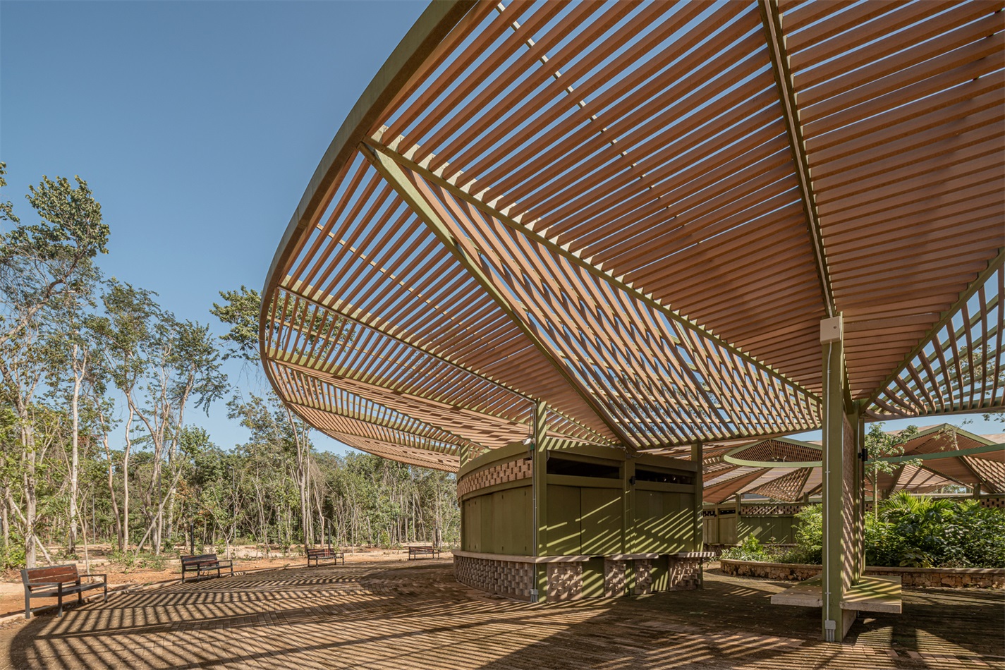 建筑群的低密度旨在最大限度地保护自然绿地,鉴于该地区的极端高温和高湿度,这一点至关重要。因此,广场和建筑物使用的所有材料均为浅米色,与该地区的天然石灰石相协调。建筑物的轻质金属框架引入了一种玩味的元素,为整个项目增添了独特的流动感。细长的橄榄绿色柱子和起伏的木质装饰与周围的森林无缝融合,而瓦屋顶则提供了抵御暴雨的保护。径向建筑的墙壁采用砖块图案,以增强质感并创造促进空气流通和自然通风的开口。此外,所有建筑在设计时都考虑了模块化,以确保成本效益并促进施工过程。