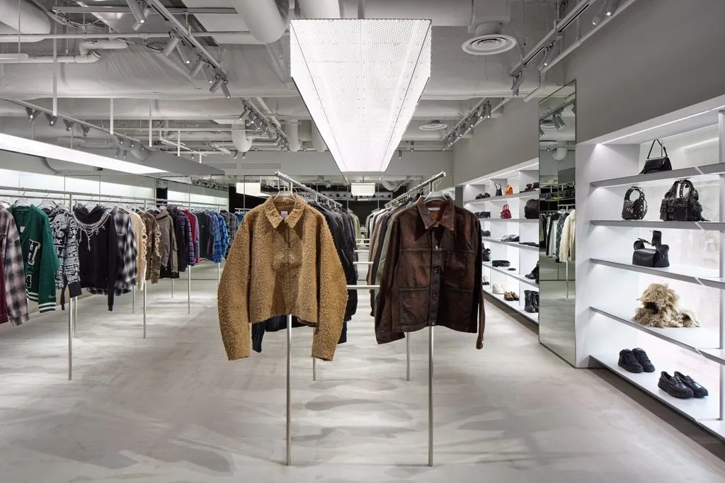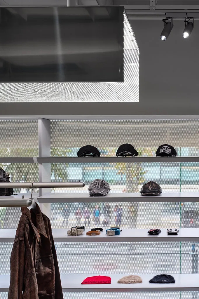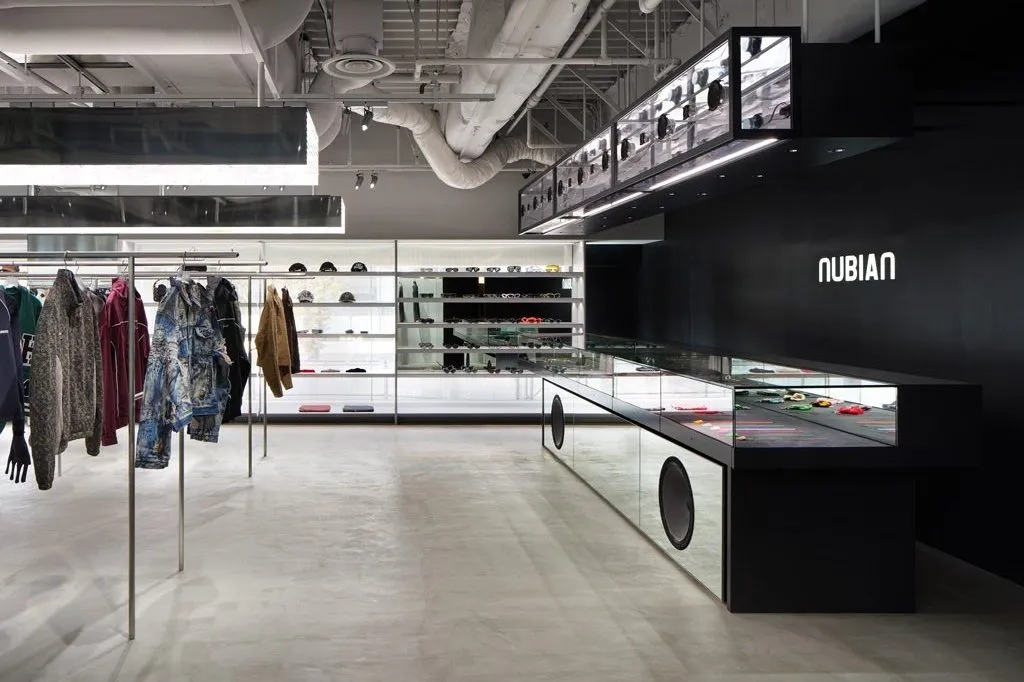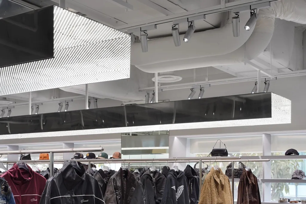 设计在材质选择上极具巧思:裸露的结构构件与水泥地面延续街头文化的原始质感;镜面与亚克力材质的大量运用,则为空间注入现代精致感。镜面通过反射扩大视觉边界,让有限空间显得更为开阔;亚克力的通透特性则在光线照射下呈现出轻盈质感,与厚重的工业结构形成 “轻与重” 的对比。这种材质碰撞不仅丰富了空间层次,更暗合了 NUBIAN “融合多元潮流” 的品牌理念。光线设计兼顾功能性与氛围营造。面向外立面的窗户后方,设计师安装了穿孔金属架,既保护了隐私,又让自然光透过孔洞柔和地洒满店铺,避免了直射光的刺眼感,营造出开阔明亮的空间氛围。人工照明方面,店铺中央标志性的两排长衣架上方,点状灯箱有序排布,精准聚焦商品,让服装的细节与质感得到充分展现;间接照明的运用则弱化了空间棱角,让粗犷的工业结构显得更为柔和,实现了 “突出商品、渲染氛围” 的双重目标。