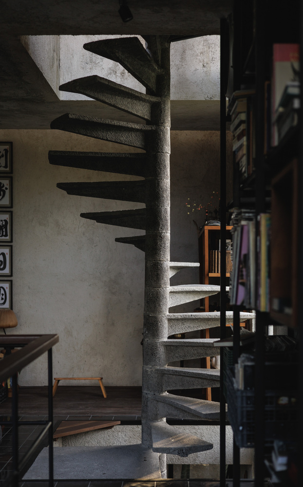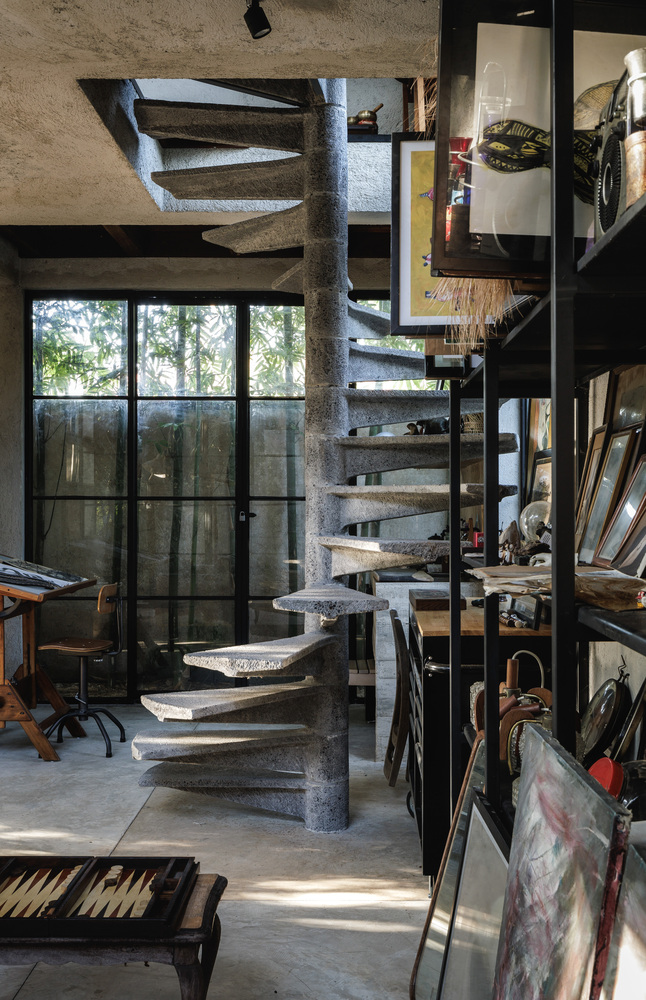 该工作室专为创意与实验而设计,内部配备了本地锻造的家具,黑色整体地面呈现出现代感,与天然材料形成微妙对比。点状暖光照明营造出轻松惬意的氛围。造型独特的悬浮楼梯需要人们专注留意,引领使用者进入一个近乎梦幻且充满敬畏感的空间,是内省沉思的理想之选。