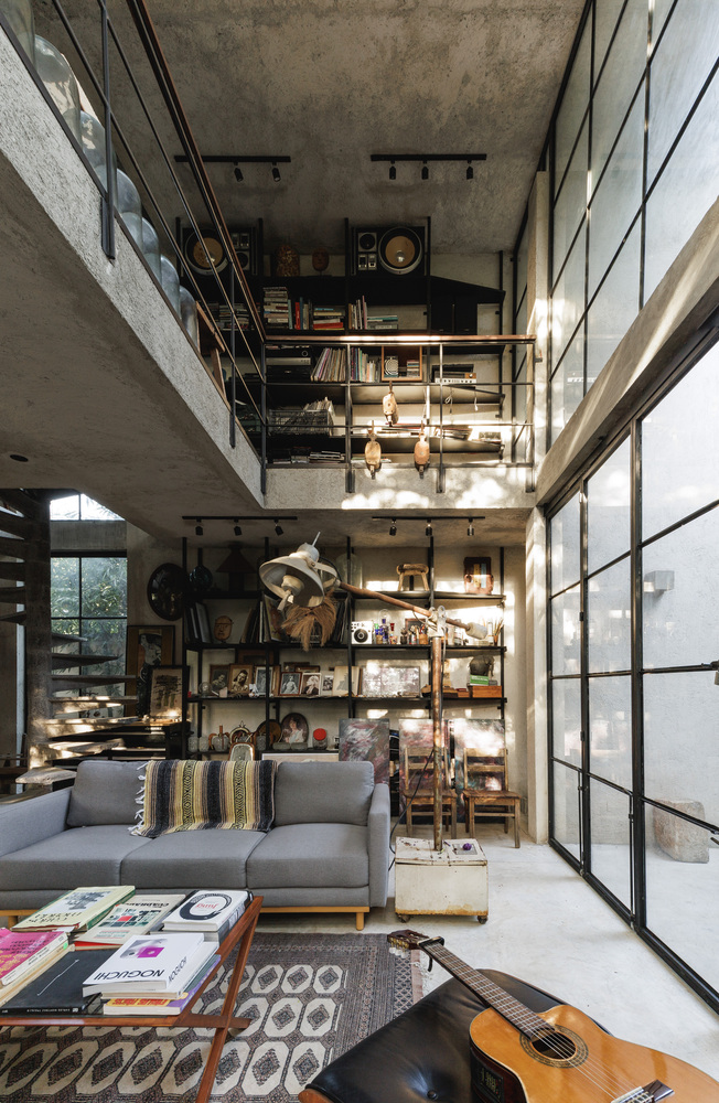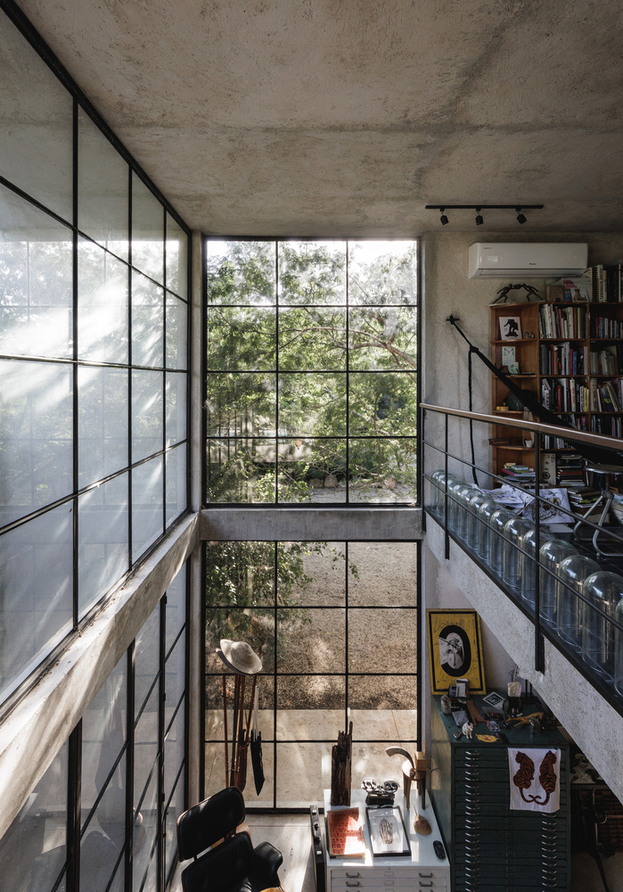 这座工作室隐匿于树林之间,其厚重坚实的体量设计灵感源自粗野主义建筑的精髓。它采用未经修饰的天然材料建造而成,是一处集自然、艺术与休憩于一体的创意与沉思之所。在宏伟的建筑体量之外,双层挑高的空间搭配大型钢铁框架透明玻璃窗,使室内与周边的树林景观形成了持续的视觉融合。