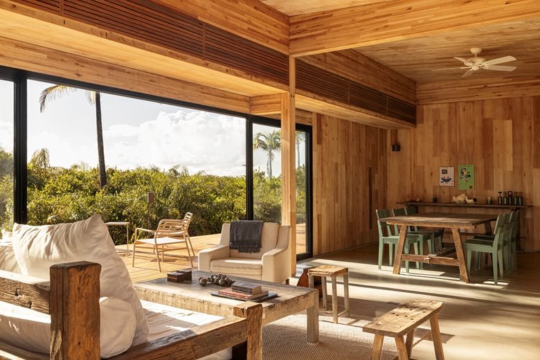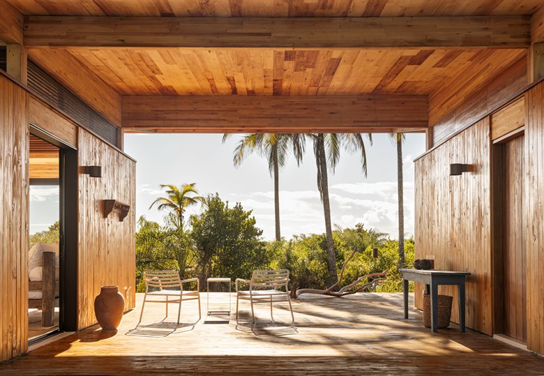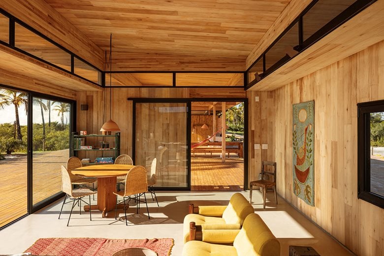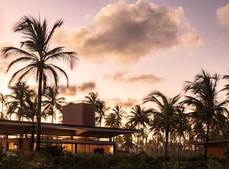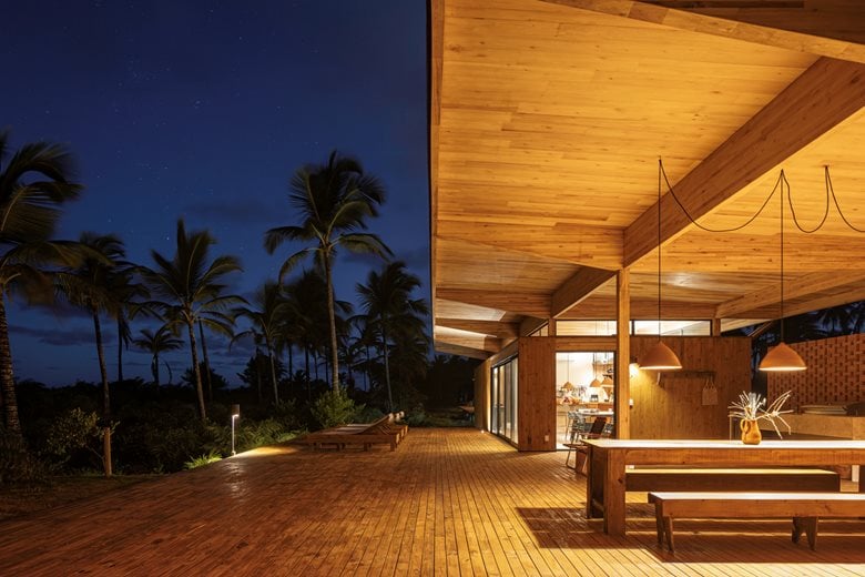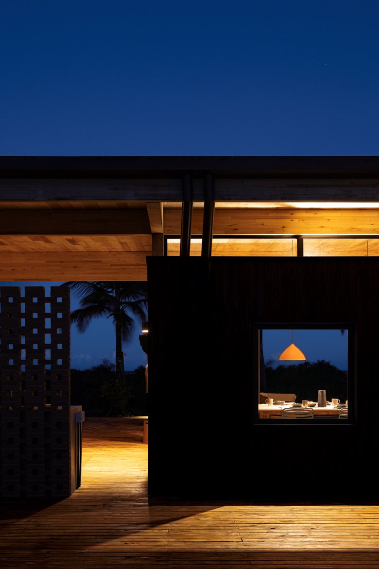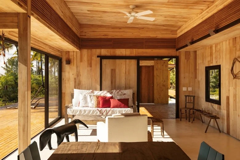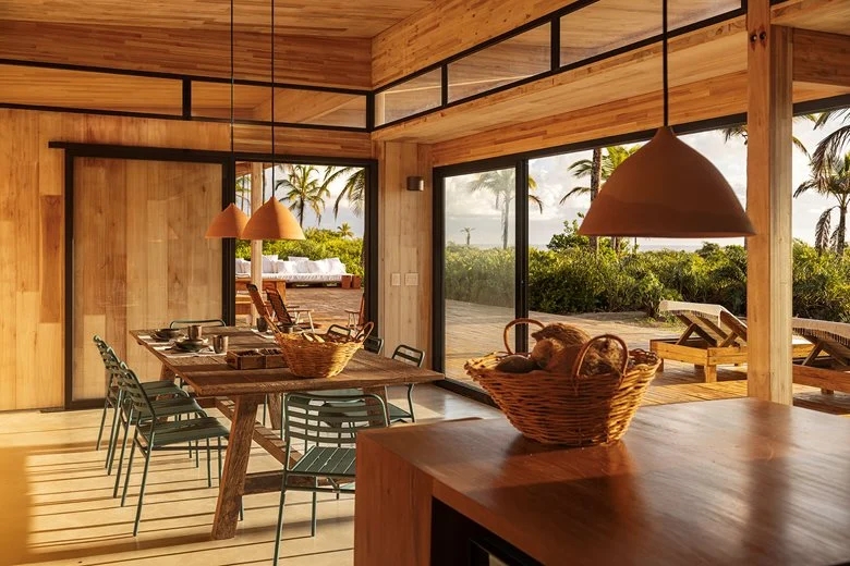 在巴伊亚州北海岸的河流与海洋之间,“模块化巴伊亚海边民宿设计”(Modular Bahia)项目打造了一处当代热带休憩之所,它对当地地域与气候特点有着敏锐的呼应。该项目由 UNA barbara e valentim 建筑事务所设计,将工业化解决方案与生物气候策略相结合 —— 精准回应了环境条件,也实现了与景观更深度融合的空间占用愿景。
