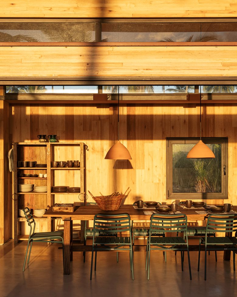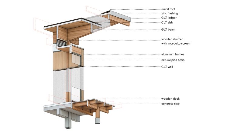 因此,模块化巴伊亚项目采用了基于独立木结构和交叉层压木材(CLT)面板围护结构的工业化系统。工程木材的使用不仅实现了快速组装,还让施工现场更整洁、可控,大幅减少了废弃物并降低了环境影响。可持续发展策略从一开始就贯穿项目始终:以再造林木材为主要原材料、建筑构件的模块化设计、宽大屋檐用于遮阳和保护立面、对立面设置窗户以保证高效的自然通风、水资源再利用系统以及被动式能源生成等。倾斜的屋顶设计有助于排出热空气,即便不使用空调也能保证室内热舒适度。
