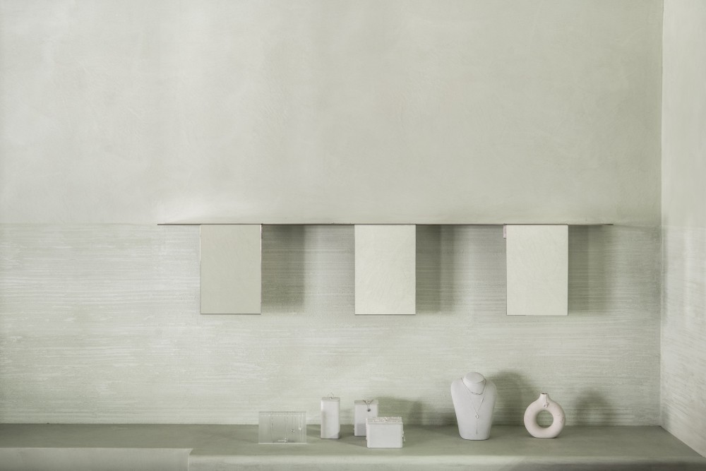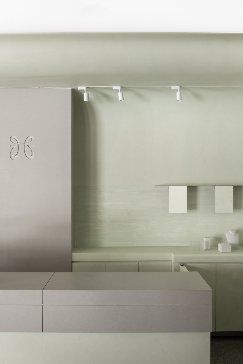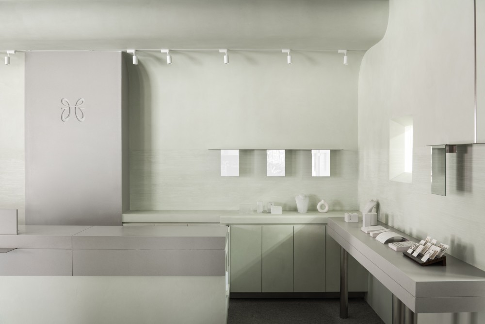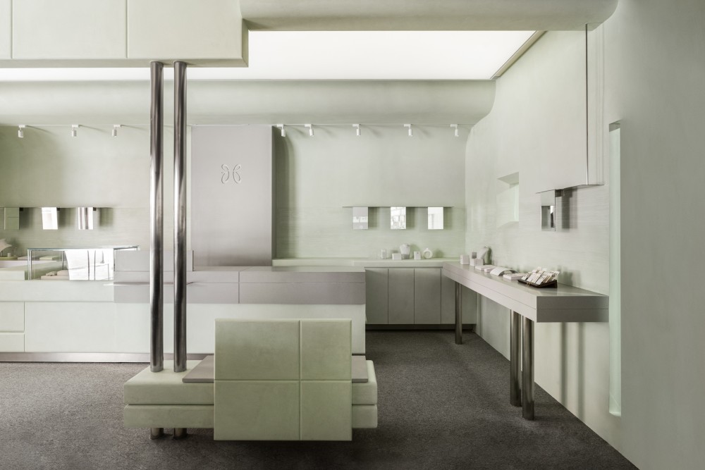 用淡绿的柔和与不锈钢的冷冽营造一场与质感对话安静体验的珠宝店设计