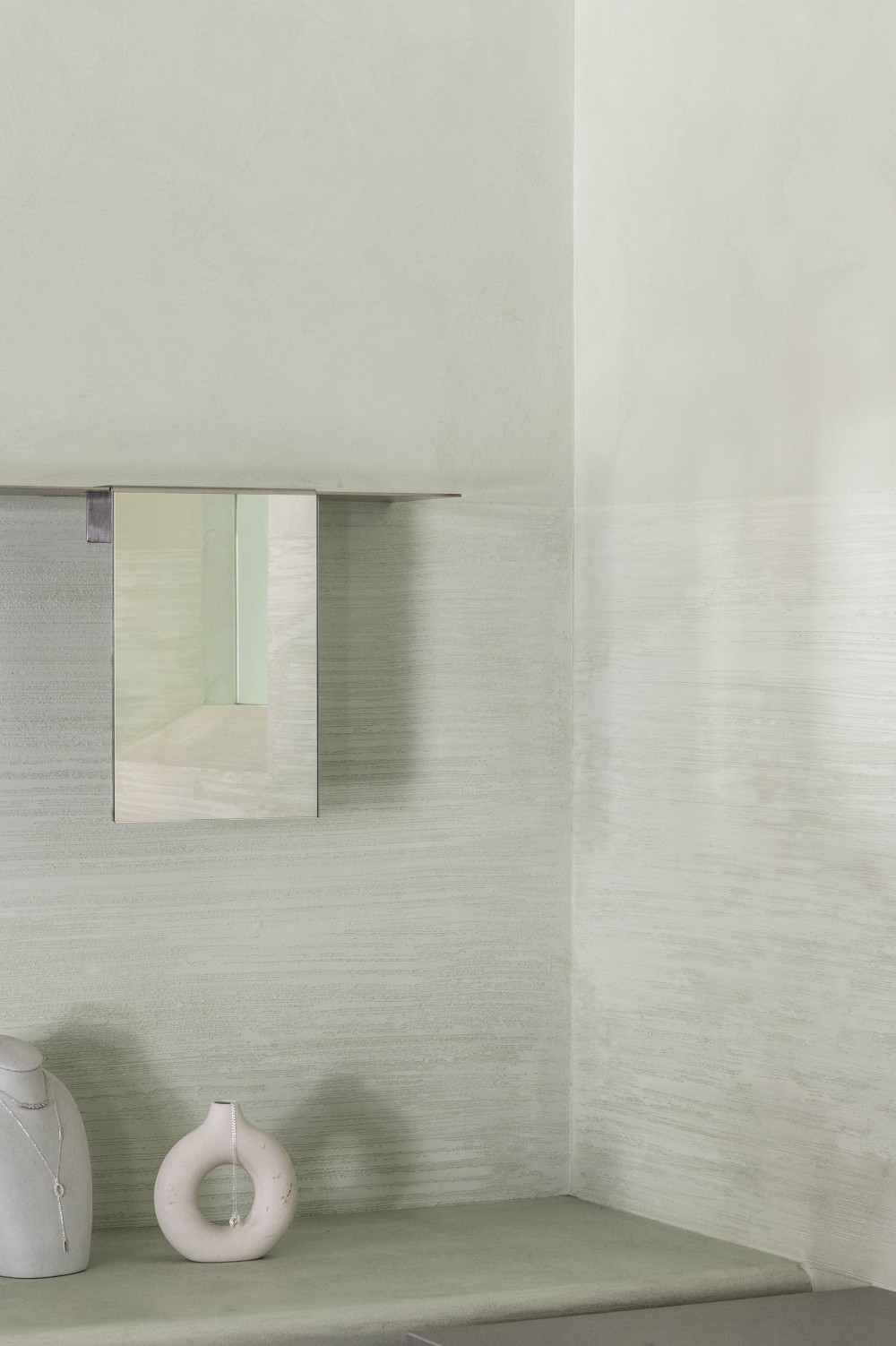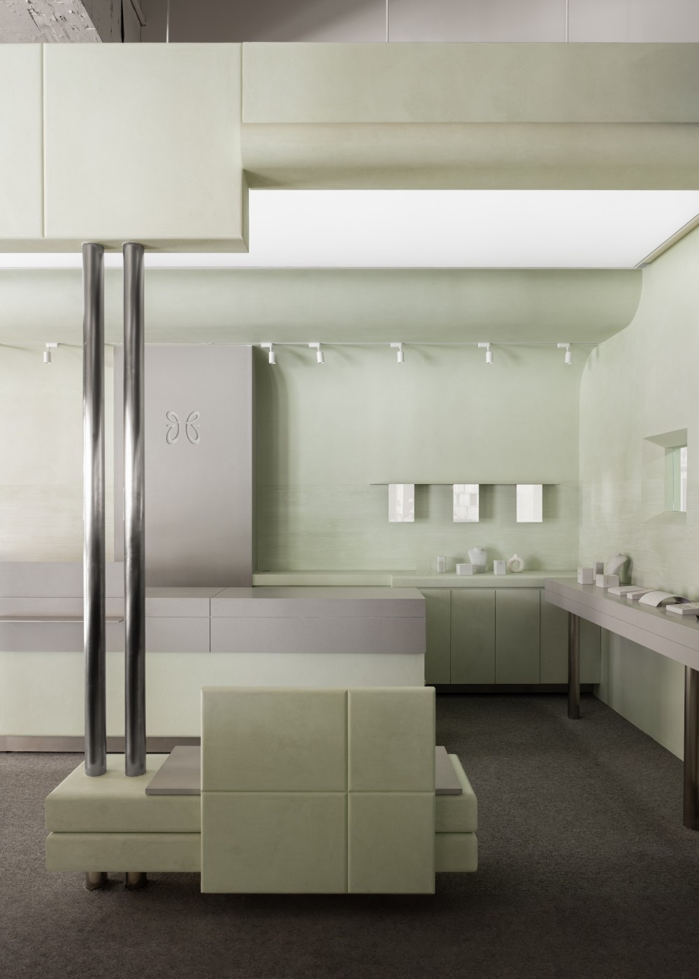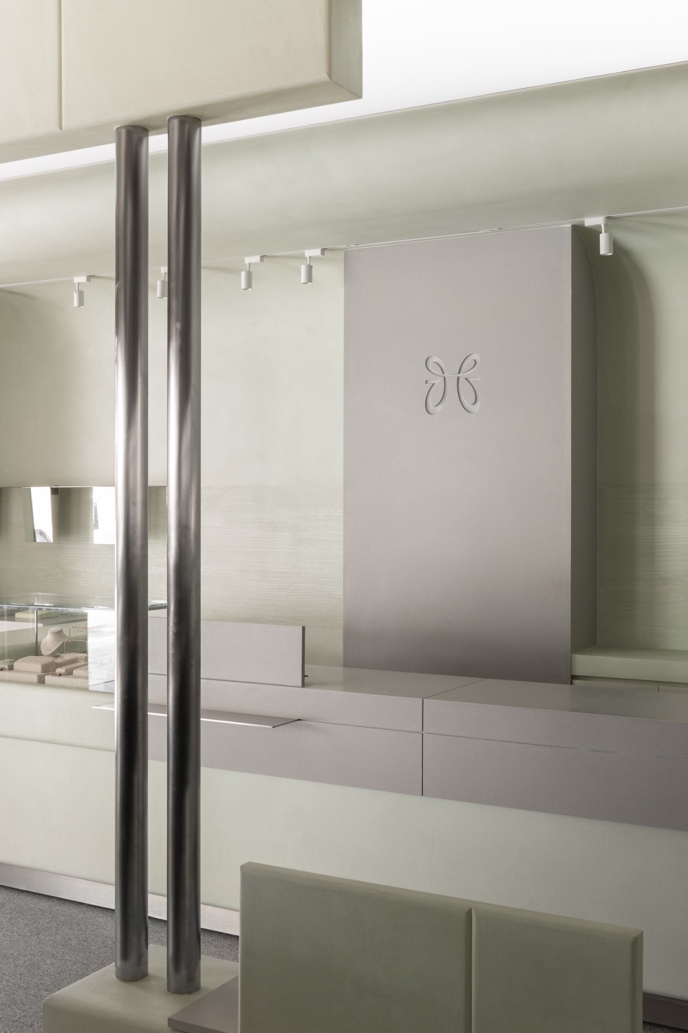 用淡绿的柔和与不锈钢的冷冽营造一场与质感对话安静体验的珠宝店设计
