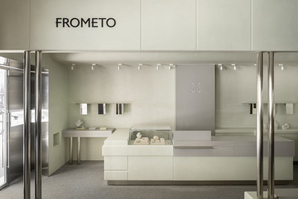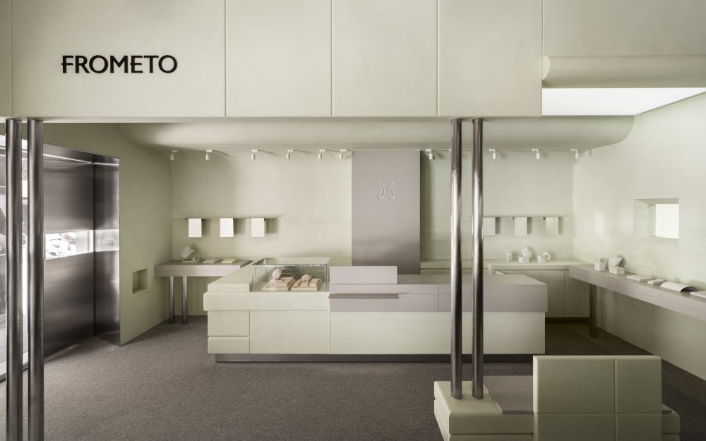 这个店最特别的地方,是把 “消费” 变成了 “独处的松弛”:没有热情的推销,没有炫目的灯光,淡绿的墙面与冷钢的线条围成一个 “安静的盒子”,你可以坐在软包座椅上,慢慢拿起一件项链,在嵌入式镜子前轻轻戴上 —— 这一刻,不是 “挑选商品”,是 “与自己的审美对话”。就像店铺名 “FROMETO” 的隐喻:珠宝不是 “从商家到买家” 的交易品,而是 “从自己到自己” 的礼物 —— 在这个淡绿与冷钢的空间里,你买下的不止是一件珠宝,更是一段 “与温柔质感共处” 的时光。