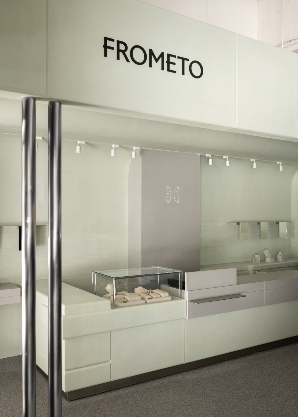 当珠宝的璀璨遇上 “去装饰化” 的店面设计,这间名为 FROMETO 的珠宝店,用淡绿的柔和与不锈钢的冷冽,把买珠宝变成了一场与质感对话的安静体验。整个店铺是极简主义的温柔版本:主色调是低饱和度的 “淡薄荷绿”,墙面用肌理漆做出细腻的纹理,像被揉软的云 —— 没有花哨的装饰,却用色彩的柔和,消解了珠宝店常见的 “距离感”。