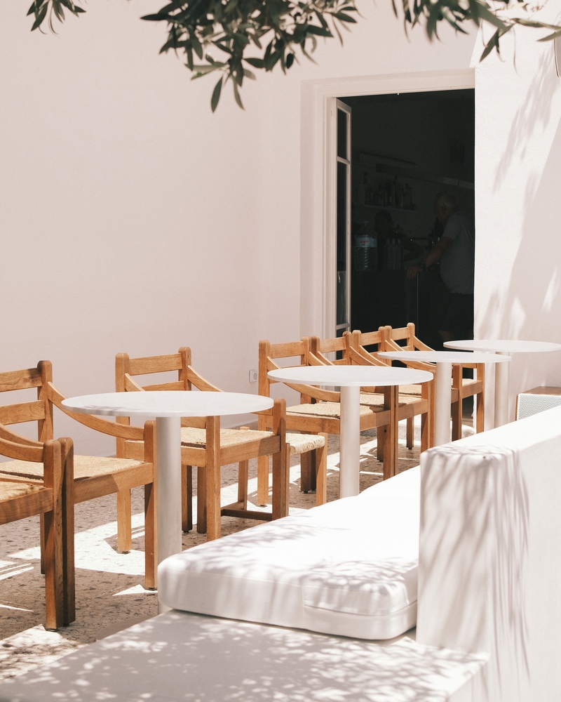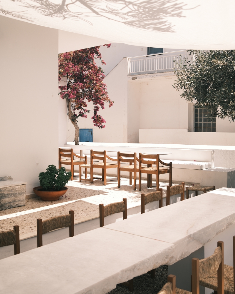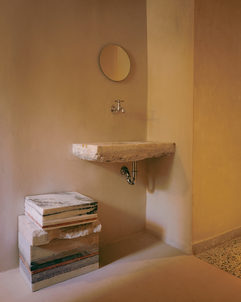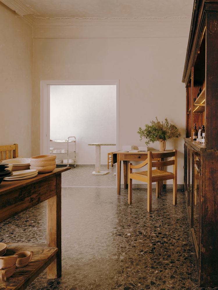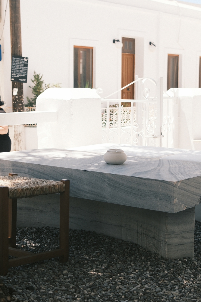设计通过西奥多・普西霍约斯(Theodor Psychoyos)定制大理石家具、柔和照明与中性色调,模糊了室内外的界限。从手工甄选的材料到空间布局,每一处细节都旨在营造强烈的 “场所归属感”,同时促进人际互动。从清晨到午夜,空间始终吸引着访客沉浸于日常节奏之中,清晨的仪式感由此开启:灵感源自小镇晨间简约氛围的 “极简灵魂早餐”。所有餐食均为手工制作、新鲜且应季:后院花园采摘的香草、Red Jane 咖啡、1OAM Apotheke 品牌茶饮(马络提拉草茶、牛至茶与鼠尾草茶)以及在树下供应的鲜榨果汁。