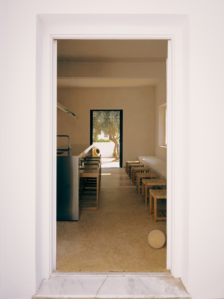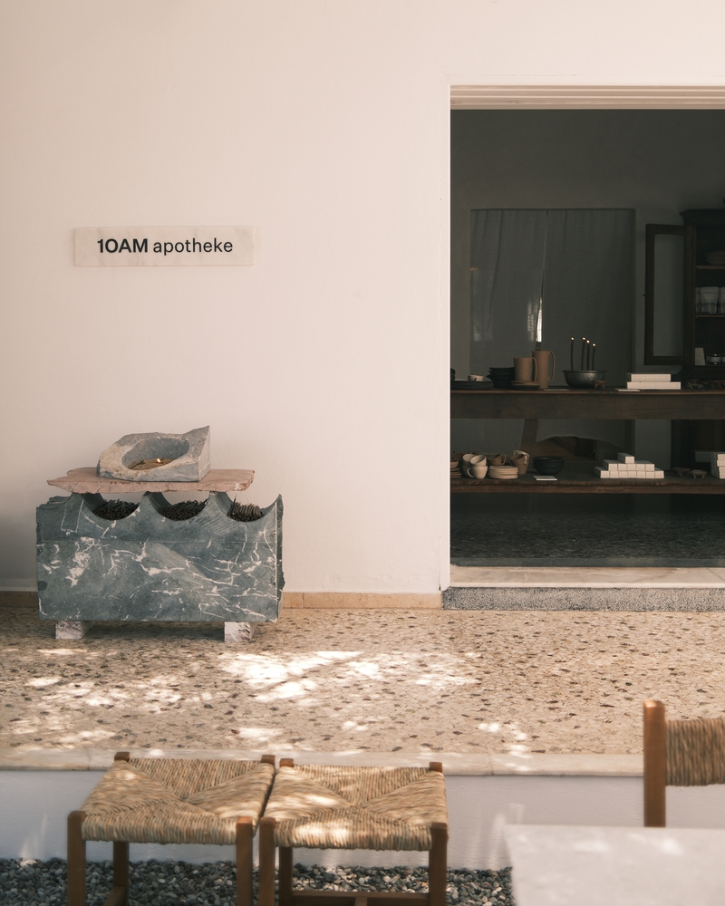 该空间距离爱琴海仅数步之遥,完美诠释了安提帕罗斯岛的精神内核:低调奢华、自然质感与随性魅力。空间设计兼顾日间阳光氛围与夜间活力场景,将概念店(展示 1OAM Apotheke 品牌产品及精选器物)与酒吧(提供精致饮品与本地风味)无缝融合。“我们的目标是打造流畅的体验感,让人们能够在此探索、放松并建立联结…… 室内设计灵感源自基克拉泽斯群岛(Cícladas)的触觉本质:石灰涂层表面、手工陶瓷与温暖木材,同时兼具当代感与惊喜感。”