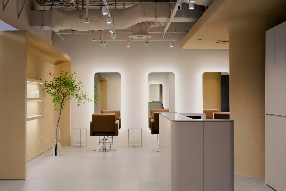 The Space 沙龙的 “吸睛密码”,藏在商场入口处的两道 “柔软雕塑墙” 里。O Design Office 没有用常规的玻璃门或招牌来定义边界,而是设计了两个自由站立的弧形雕塑装置 —— 它们像被风吹起的织物,线条柔和且富有流动感,半遮半掩地挡住室内景象,既不会完全隔绝视线,又留下了 “让人想一探究竟” 的神秘感。这种设计彻底打破了 “商场店铺的直白感”:路过的人会被雕塑的独特形态吸引,目光不自觉地往 “两面墙之间的缝隙” 里探寻 —— 能隐约看见室内的暖光、浅桃色的肌理,以及发型师忙碌的身影,却又看不完全,好奇心被轻轻勾起,仿佛在商场里发现了一处 “隐藏的艺术角落”。当客户主动走进 “两面墙之间”,便完成了从 “商场的热闹” 到 “沙龙的宁静” 的自然过渡,理发的 “仪式感” 从踏入入口的那一刻就已开启。