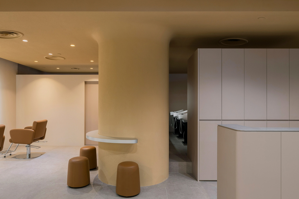 在 The Space 沙龙的核心区域,O Design Office 藏了一个 “反常规的洗发空间”—— 它不是简单的 “洗头椅 + 镜子” 组合,而是一个带着独立天花板的 “自由立体积块”,被巧妙地隐藏在接待墙后方,像一个专属的 “疗愈小舱”。这个洗发区的设计,把 “功能性” 与 “私密性” 做到了极致:首先是 “氛围的包裹感”—— 独立的屋顶挡住了周围的视线,客户躺下时,不会被其他区域的动静干扰,只能看见头顶柔和的灯光与浅桃色的肌理墙面,瞬间卸下 “在公共空间的局促感”;其次是 “光线的温柔感”—— 屋顶与墙面的连接处留有细小开口,光线透过开口缓慢渗透进来,不会直射眼睛,反而像 “自然的晨雾” 般包裹空间,搭配轻柔的水流声,洗护过程变成了 “短暂的放松时刻”;最后是 “材质的亲近感”—— 整个立体积块用浅桃色纹理材质包裹,触感细腻且温暖,没有冰冷的金属或坚硬的石材,连洗头椅的靠垫都与墙面肌理呼应,身体接触到的每一处,都带着 “柔软的安抚感”。