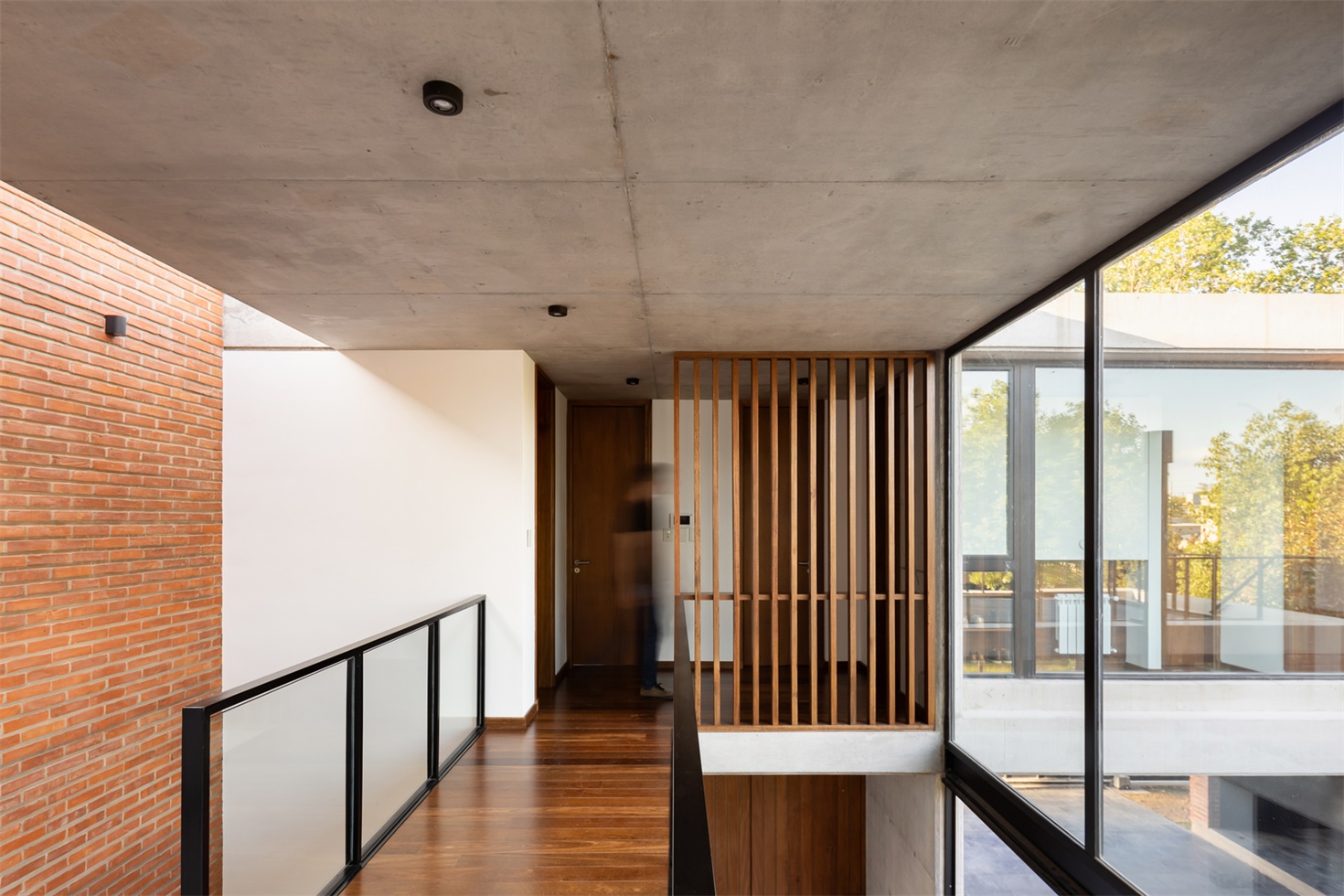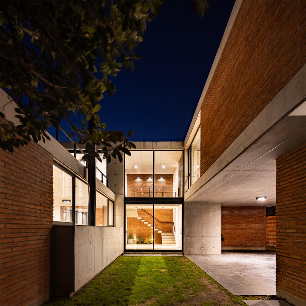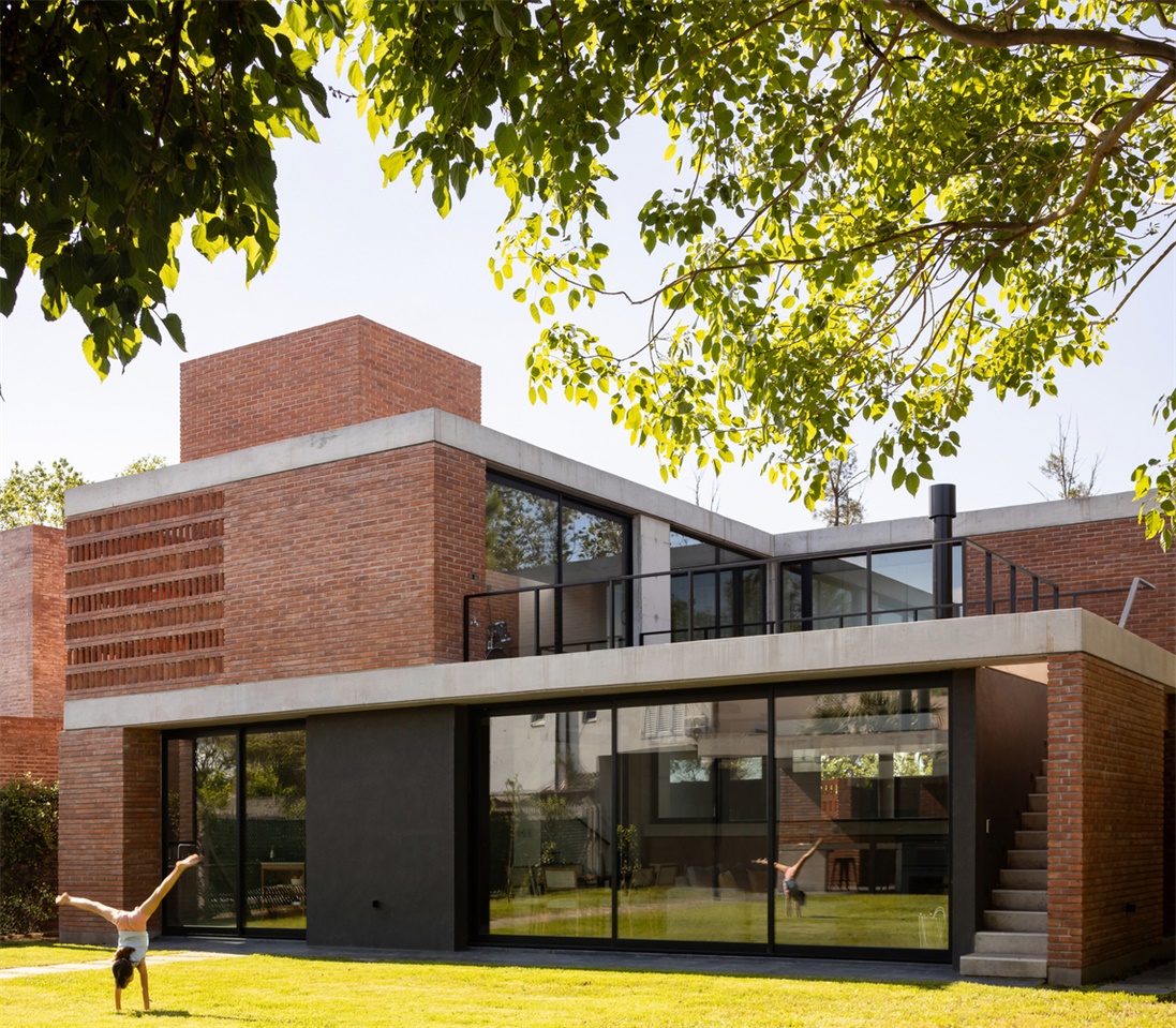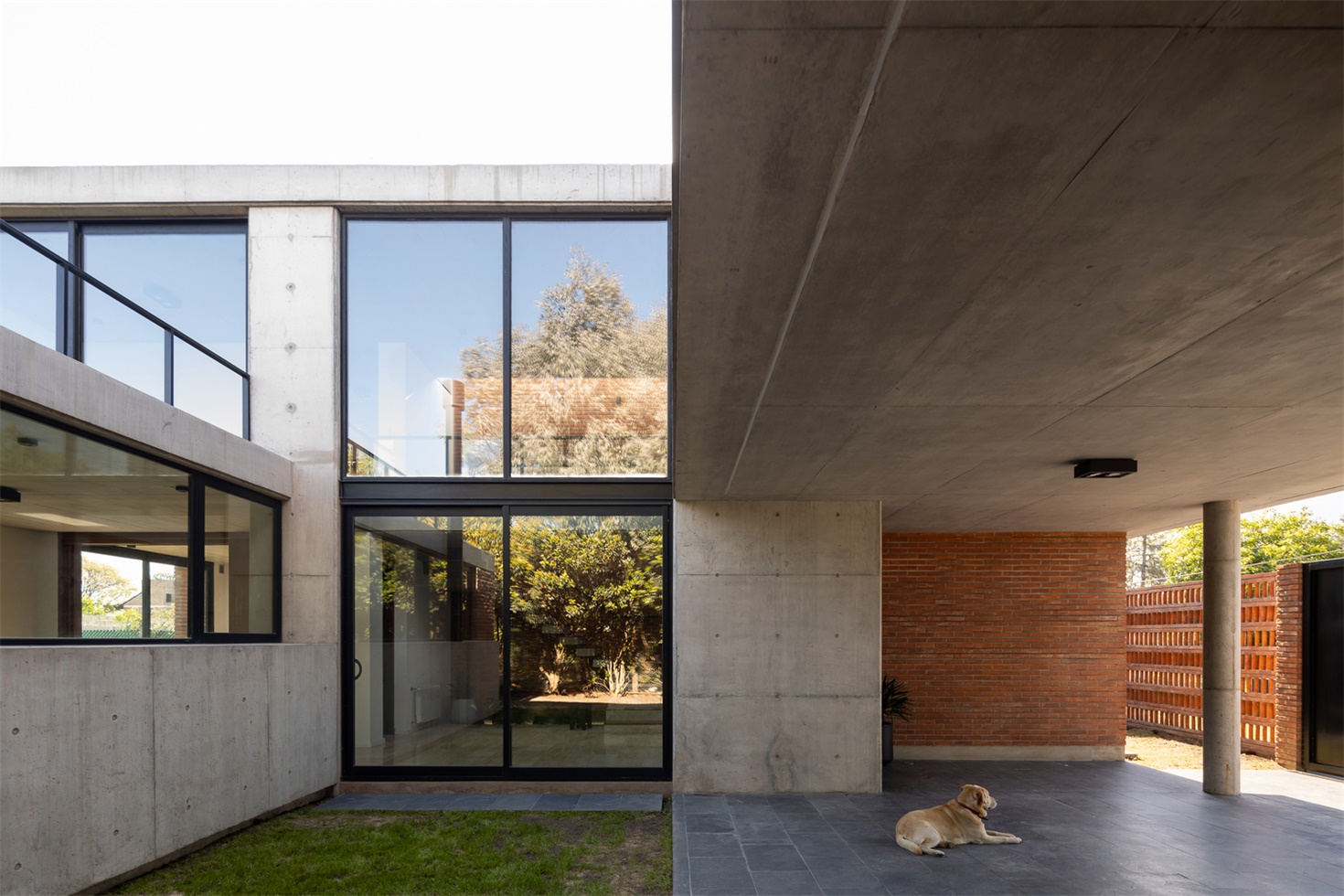 这座住宅位于阿根廷一个低密度住宅区,占地面积为 20 米 ×35 米,周边有大面积绿地。为了增强家庭私密性,设计方案呈现出明显的内向型特征,通过大面积的透明设计将视线引向内部的绿色空间。