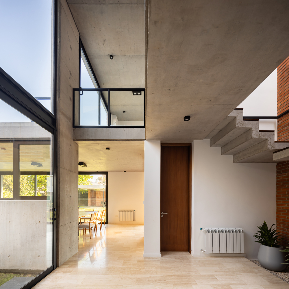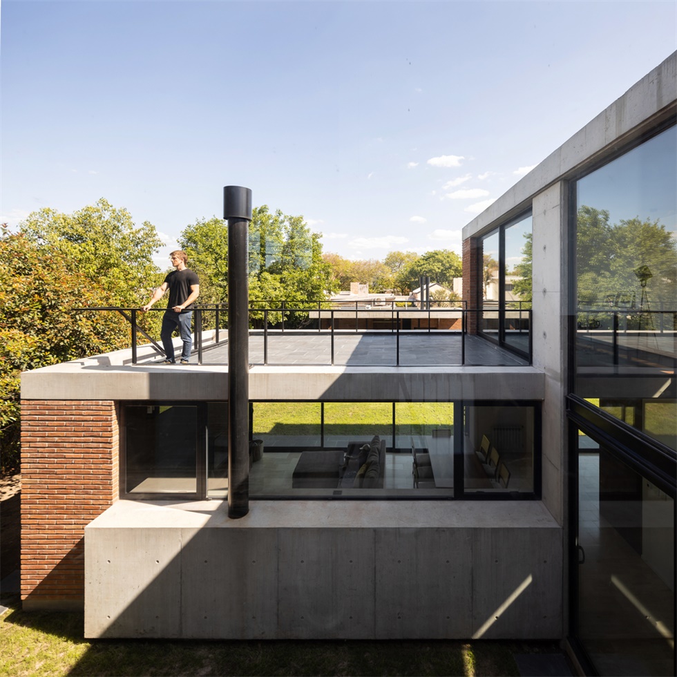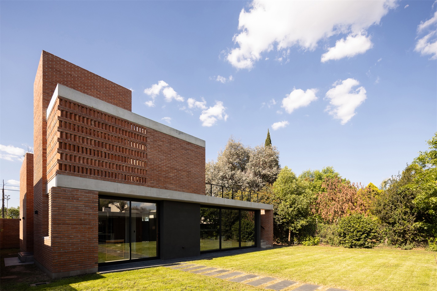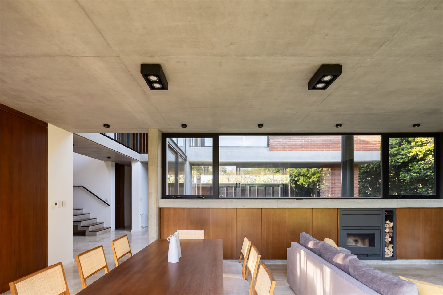 这座住宅位于阿根廷一个低密度住宅区,占地面积为 20 米 ×35 米,周边有大面积绿地。为了增强家庭私密性,设计方案呈现出明显的内向型特征,通过大面积的透明设计将视线引向内部的绿色空间。