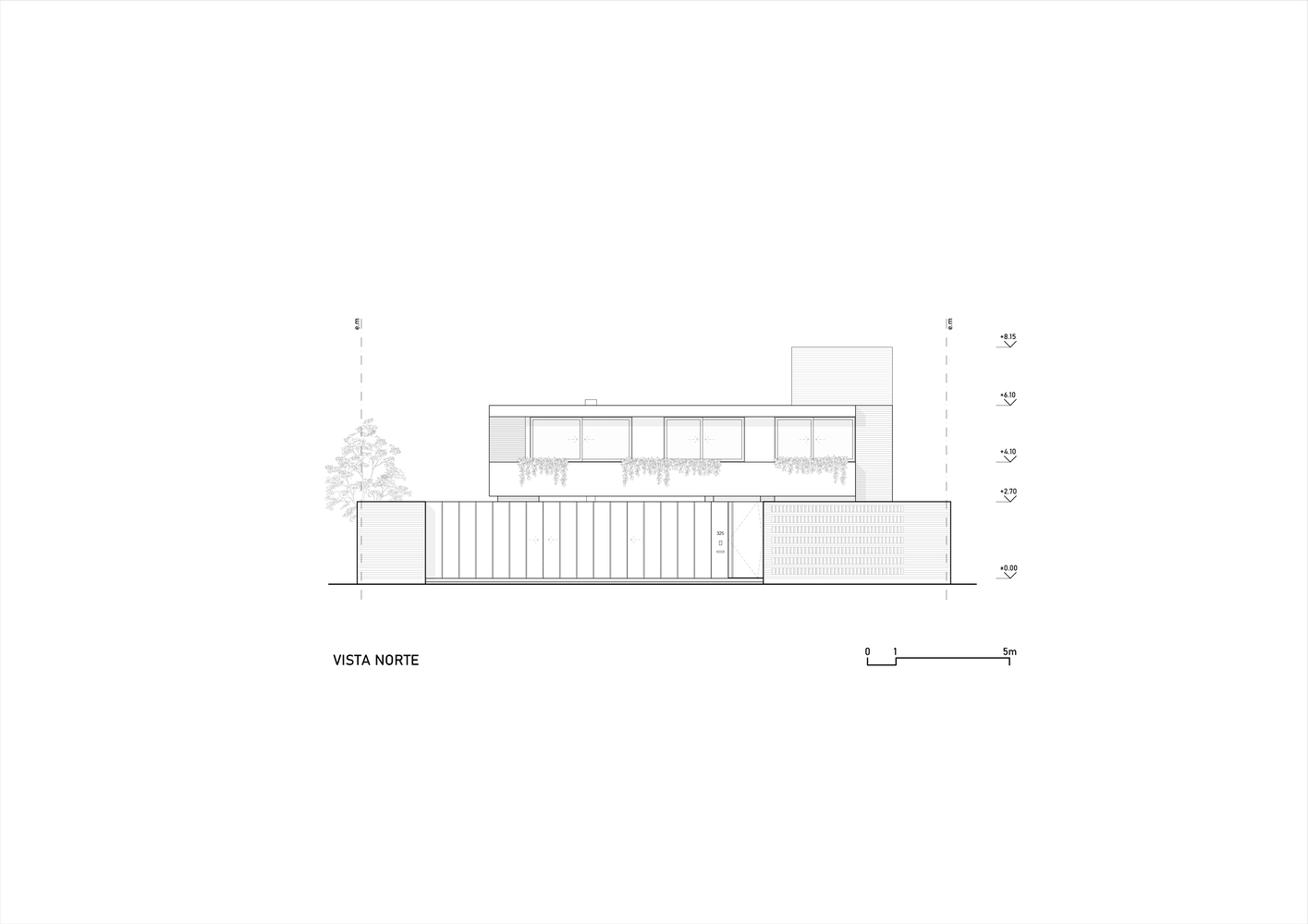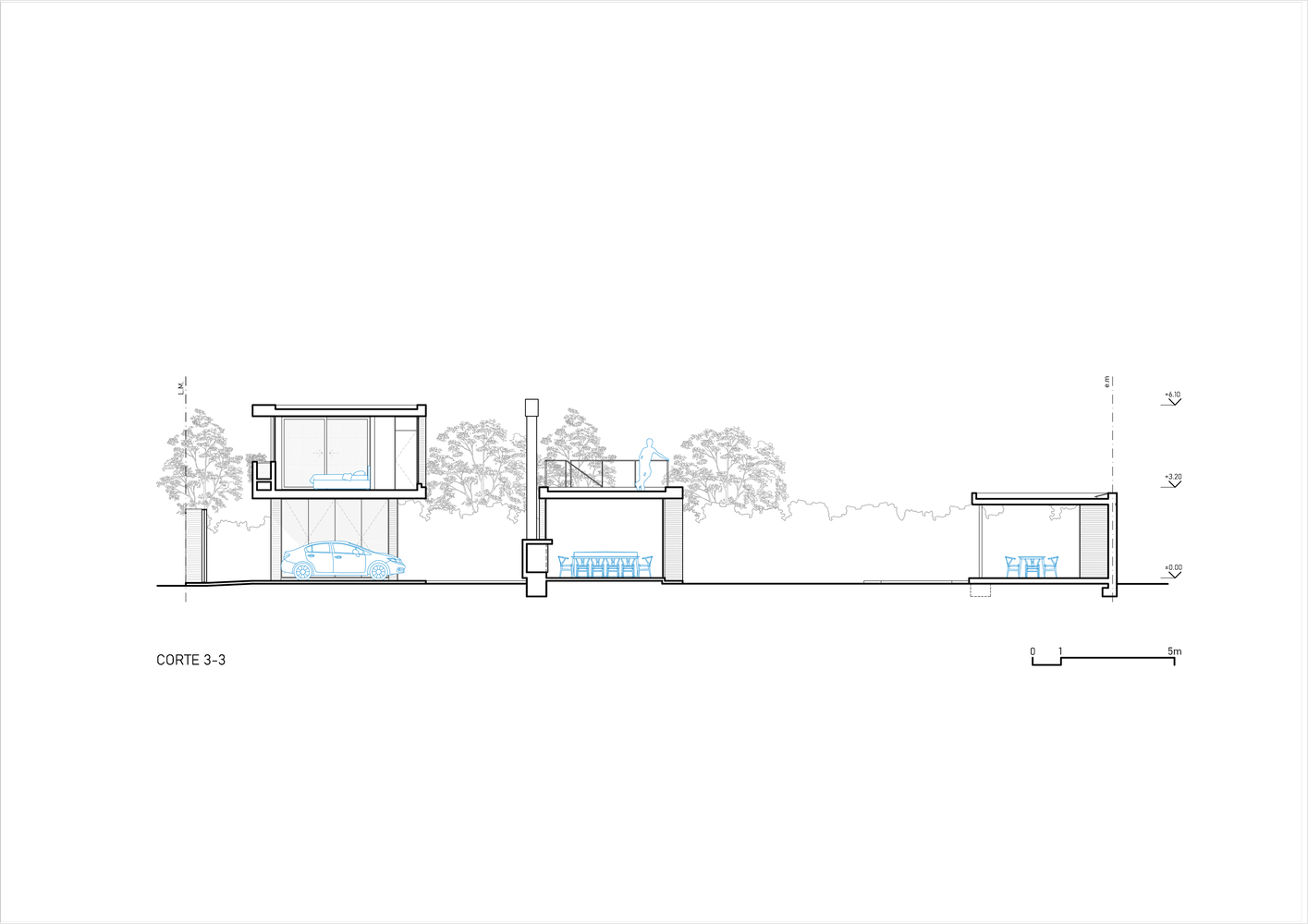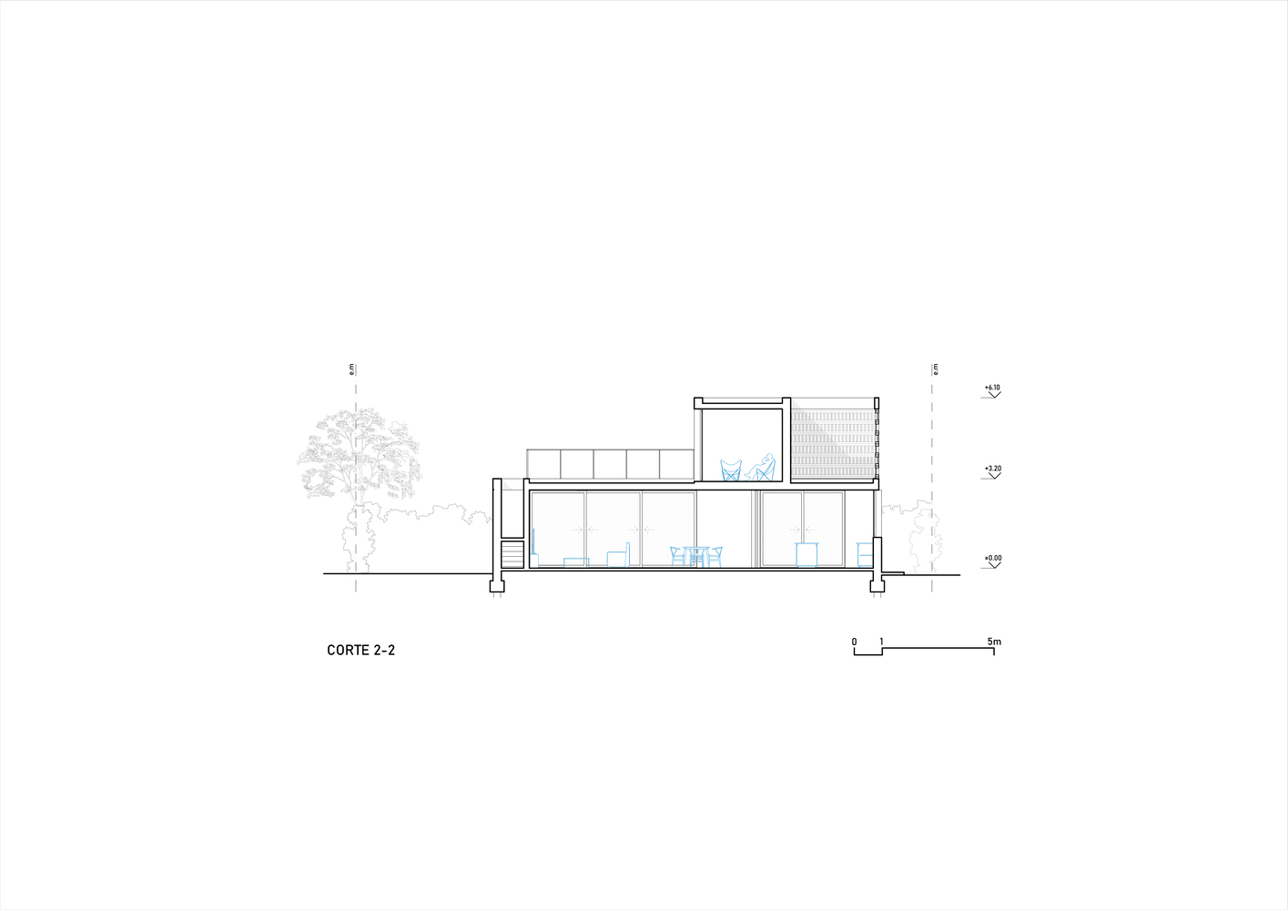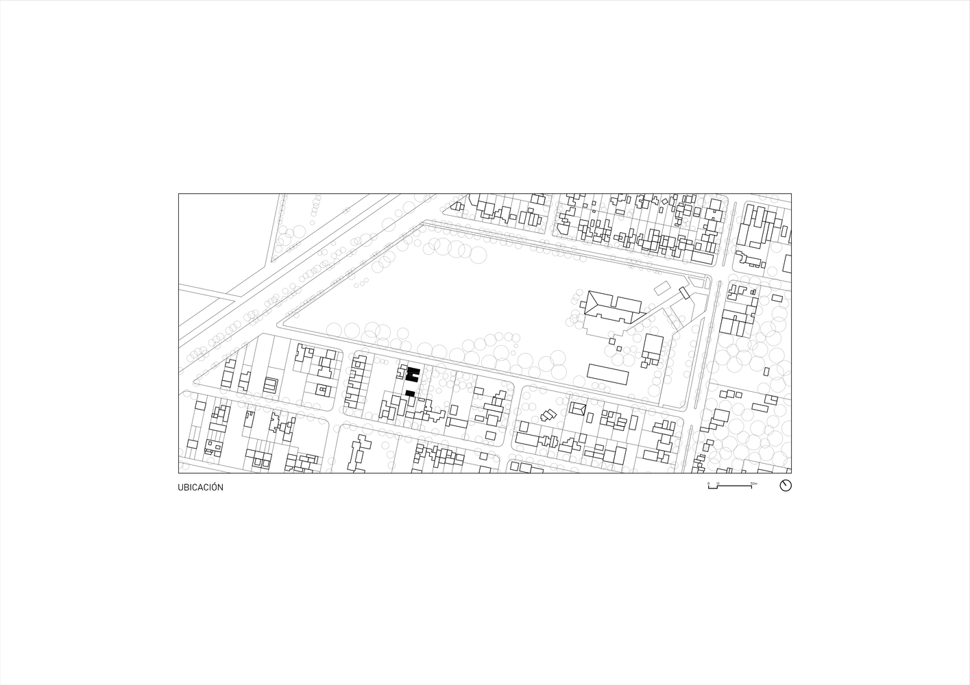 这座住宅位于阿根廷一个低密度住宅区,占地面积为 20 米 ×35 米,周边有大面积绿地。为了增强家庭私密性,设计方案呈现出明显的内向型特征,通过大面积的透明设计将视线引向内部的绿色空间。