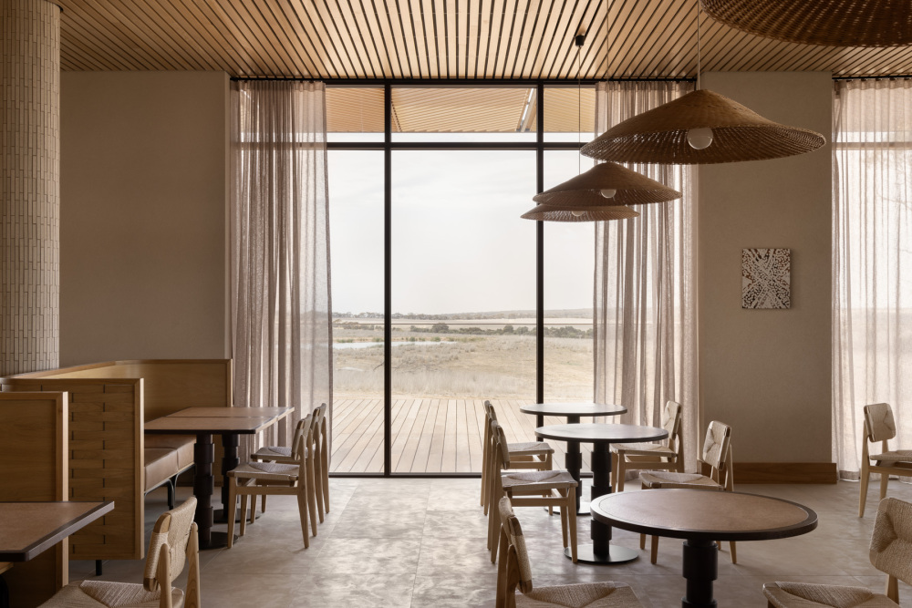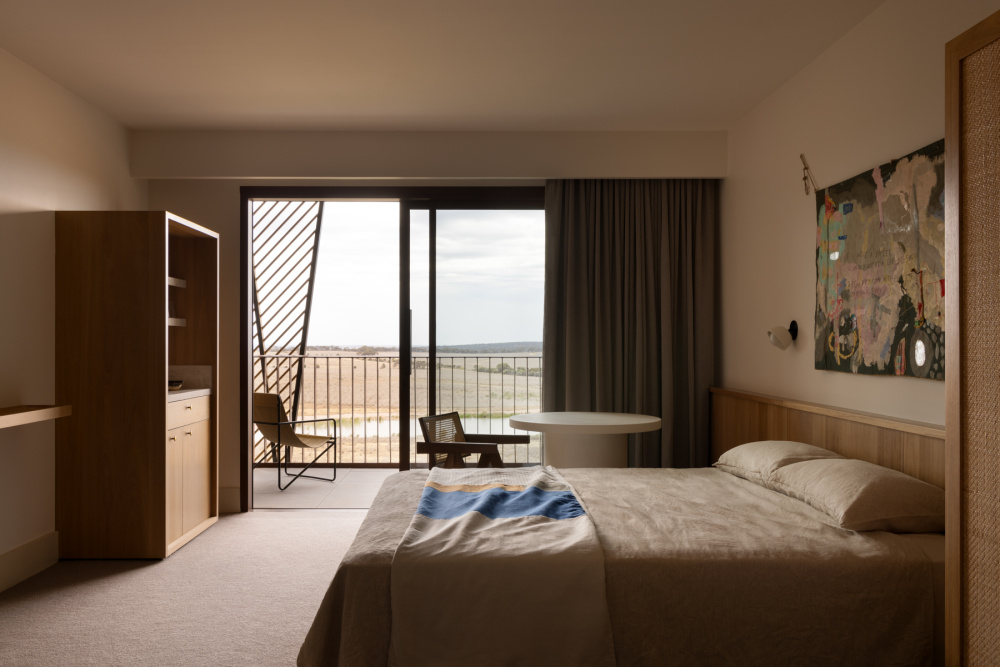 在南半球最大的平原野生动物园外围,一座高端奢华的度假酒店设计如自然馈赠般坐落于恩加林杰里族的传统领地之上。它以澳大利亚地貌为基底,注入浓郁热烈的非洲探险风情,78间客房与挑高大堂、水疗中心等空间共同构筑起“跨洲灵感的融合场域”。室内设计工作室格拉姆(Studio Gram)将其定义为“不拘一格的创意策展”,让远隔重洋的澳洲灌木与非洲稀树草原,在编织纹样的串联下,诉说着关于迁徙、聚居与欢庆的动人故事。