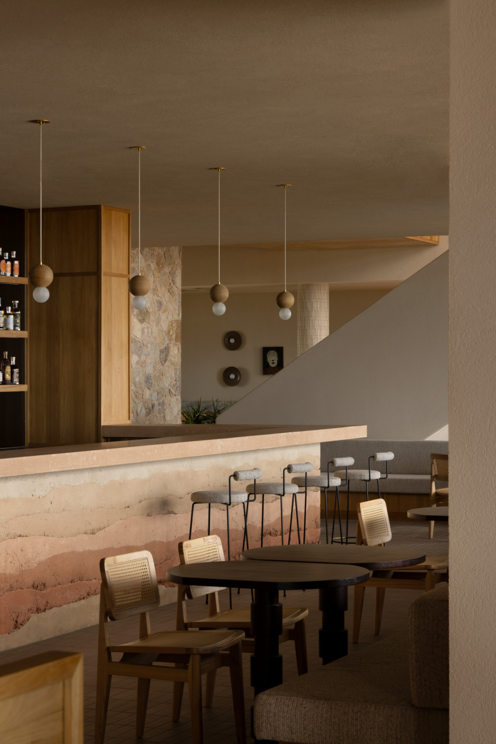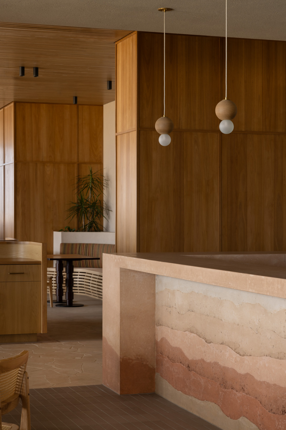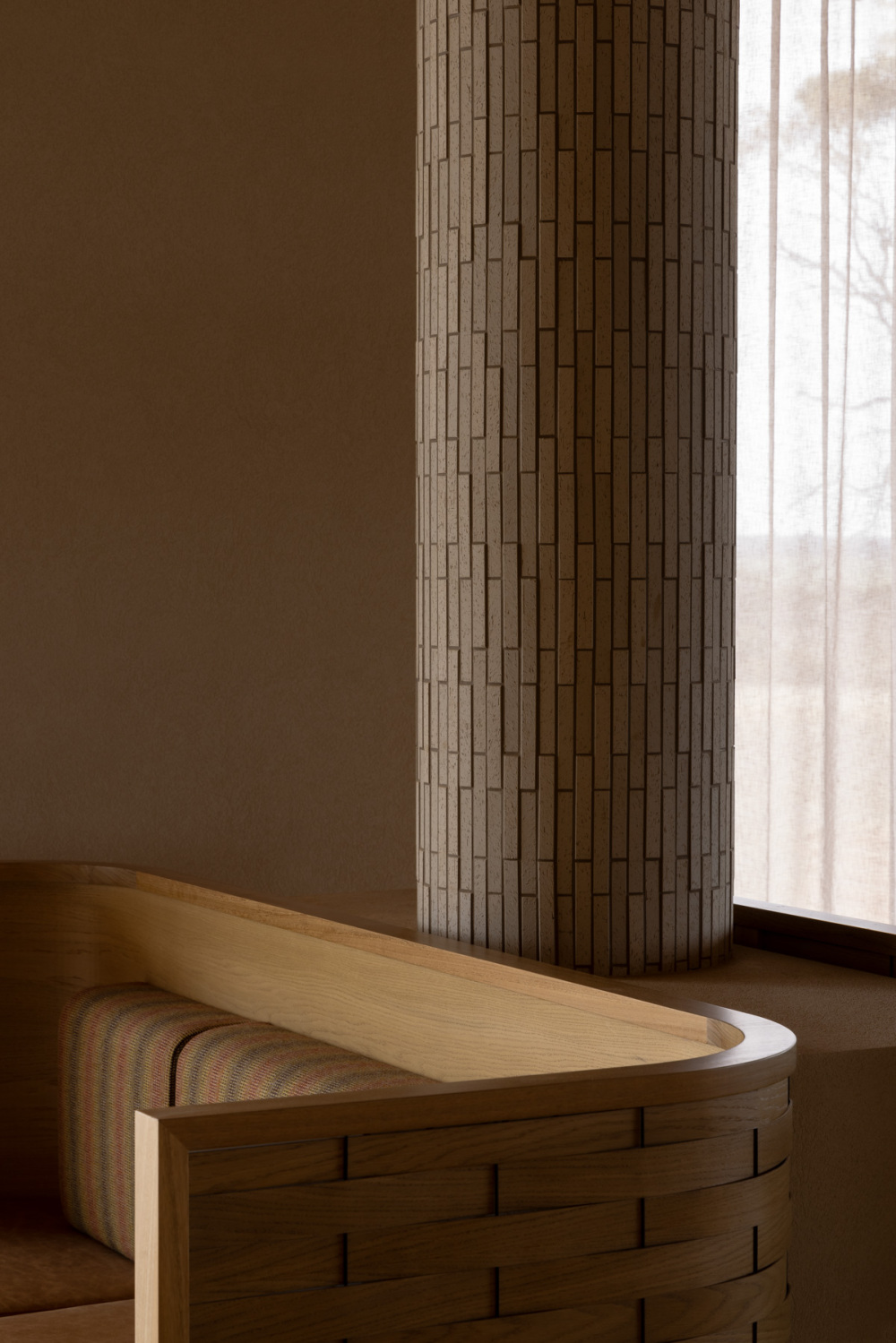 “编织”并非空间中的点缀符号,而是贯穿色彩、材质与形态的核心设计语言,从具象的装饰到抽象的结构,渗透在酒店的每一处细节之中,成为串联两大洲灵感的隐形纽带。在餐厅区域,锥形编织吊灯悬挂于上空,光影透过编织缝隙洒下,在桌面形成斑驳的自然纹路,既是对非洲编织工艺的致敬,又暗合恩加林杰里族的手工智慧;定制软包长椅以欧洲橡木饰面条打造出细腻的编织纹理,触感温润的木材与立体纹路结合,让“编织”从视觉延伸至触觉;弧形松木座椅则以交错缠绕的形态呈现,线条起伏间模拟出编织的韵律感,为用餐空间注入灵动气息。编织元素的表达更延伸至空间结构层面。挑高开阔的大堂内,天花板采用澳洲本土黑皮桉树板材,以长条拼接形式铺设,粗糙纹理与天然节疤清晰可见,板材从天花板延伸至墙面竖向饰面板,再衔接至户外木质露台,形成“两层楼板间具象化的编织表达”。建筑主体分为两个翼楼,设计师借助长条板材的延展性,在区域衔接处构建出极具视觉冲击力的编织形态,让空间边界在材质的交织中自然消融。
