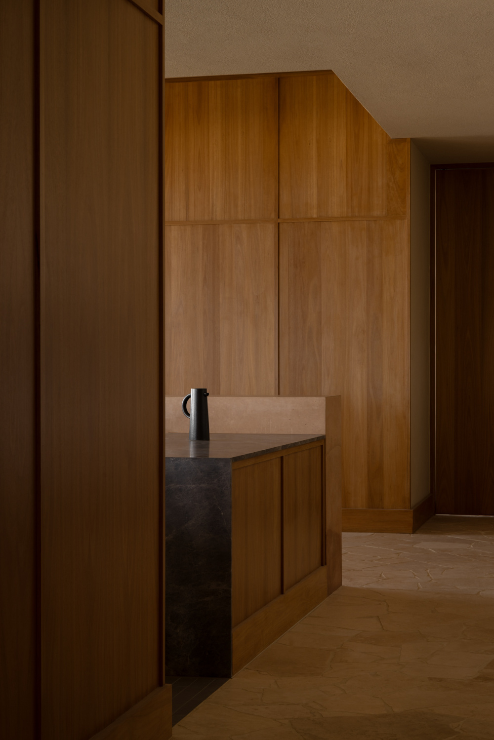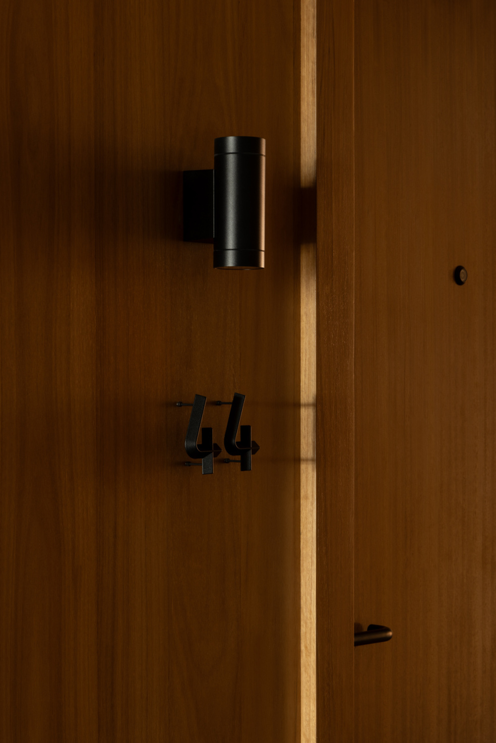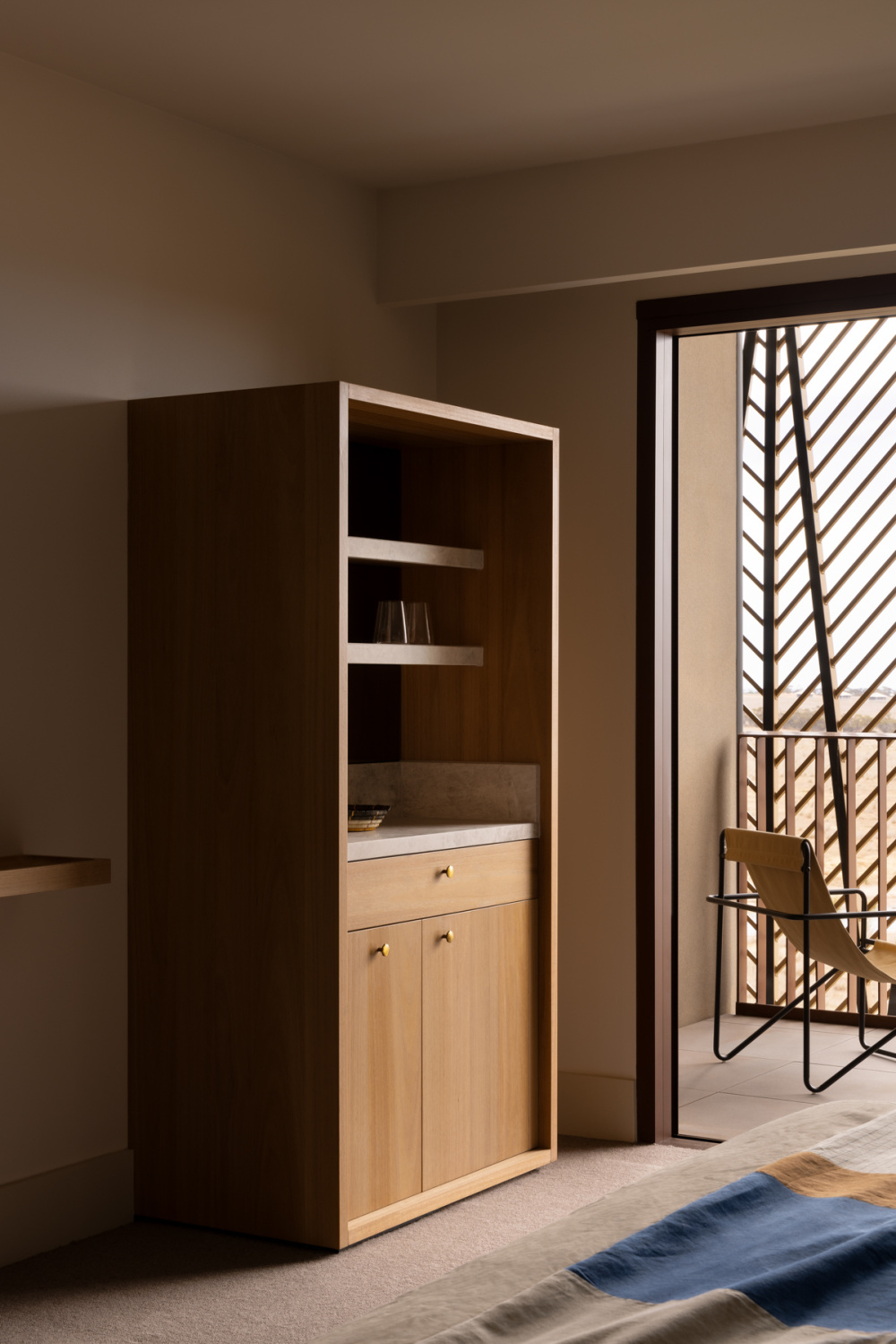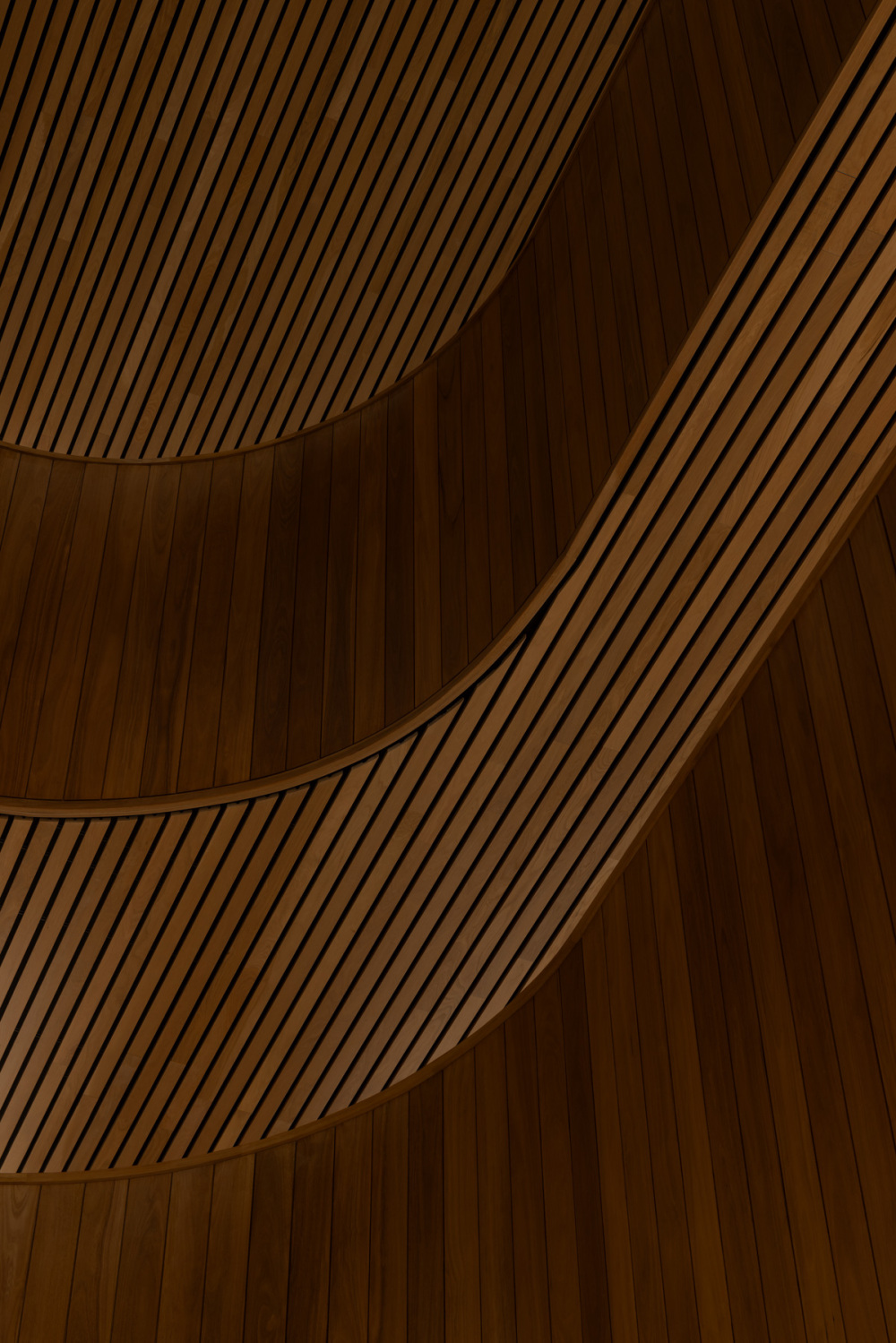 “编织”并非空间中的点缀符号,而是贯穿色彩、材质与形态的核心设计语言,从具象的装饰到抽象的结构,渗透在酒店的每一处细节之中,成为串联两大洲灵感的隐形纽带。在餐厅区域,锥形编织吊灯悬挂于上空,光影透过编织缝隙洒下,在桌面形成斑驳的自然纹路,既是对非洲编织工艺的致敬,又暗合恩加林杰里族的手工智慧;定制软包长椅以欧洲橡木饰面条打造出细腻的编织纹理,触感温润的木材与立体纹路结合,让“编织”从视觉延伸至触觉;弧形松木座椅则以交错缠绕的形态呈现,线条起伏间模拟出编织的韵律感,为用餐空间注入灵动气息。编织元素的表达更延伸至空间结构层面。挑高开阔的大堂内,天花板采用澳洲本土黑皮桉树板材,以长条拼接形式铺设,粗糙纹理与天然节疤清晰可见,板材从天花板延伸至墙面竖向饰面板,再衔接至户外木质露台,形成“两层楼板间具象化的编织表达”。建筑主体分为两个翼楼,设计师借助长条板材的延展性,在区域衔接处构建出极具视觉冲击力的编织形态,让空间边界在材质的交织中自然消融。