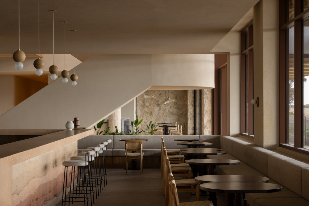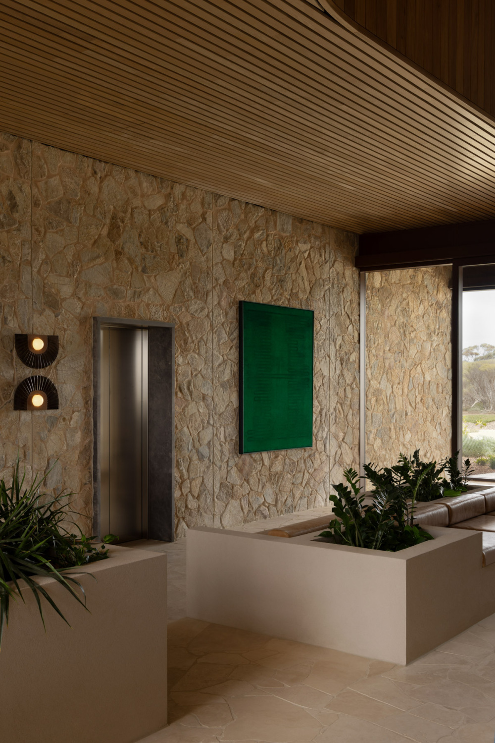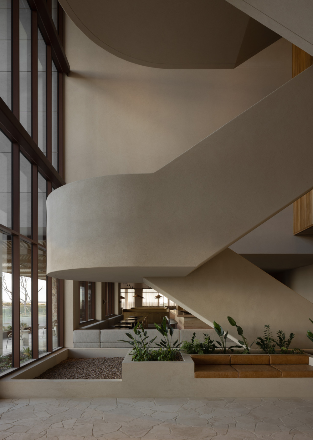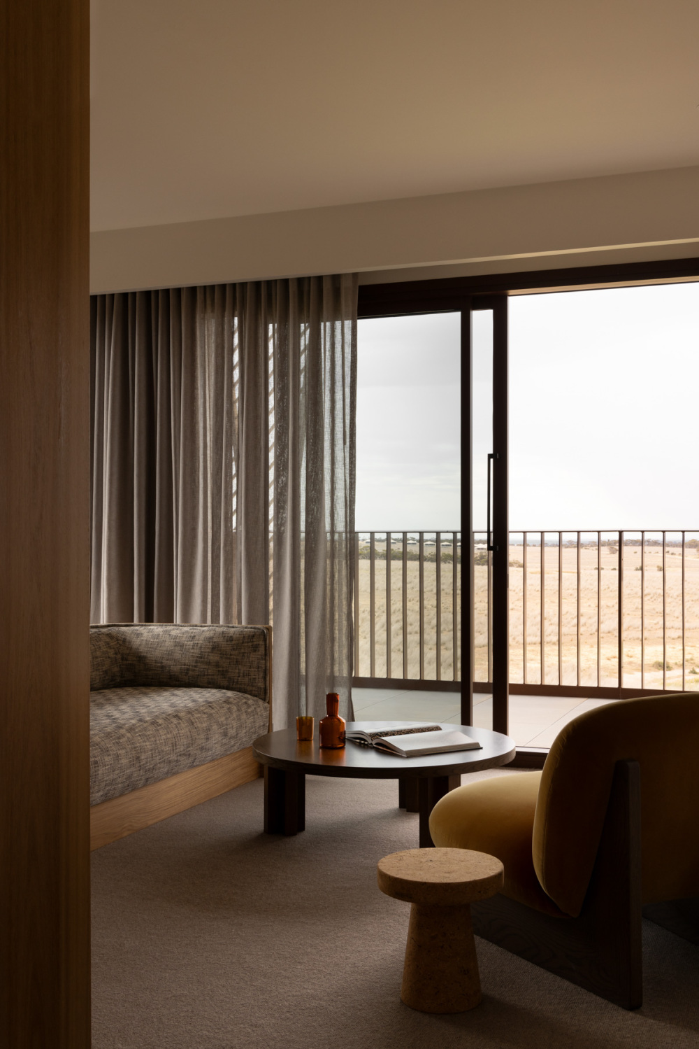 酒店的空间设计,完美诠释了“野性自然”与“高端奢华”的平衡——以粗犷的自然材质为底,用精致的工艺与舒适的配置营造奢华体验,让住客在与野生动物相伴的同时,尽享静谧与惬意。大堂作为空间核心,以黑皮桉树板材构建的“编织感”天花板奠定自然基调,地面采用质感温润的奶白色洞石,粗犷的石砌墙面与细腻的木质细节形成对比,既呼应了澳洲干旱地区的原始地貌,又避免了自然元素的生硬堆砌。成为视觉焦点的渐变混凝土吧台,由格拉姆工作室联合福姆思公司(Form-s)共同打造,现场浇筑、手工夯筑的工艺让表层呈现出层次丰富的桃色渐变,与当地马里林区的地貌色调相映成趣,粗犷的混凝土材质与精细的渐变效果,成为“野性与奢华”平衡的最佳注脚。客房区域则将“沉浸式体验”做到极致。弧形楼梯盘旋而上通向二层,两个翼楼中的客房静谧雅致,亚麻窗帘垂落间营造出私密氛围。客房布局暗藏巧思:一半面朝酒店人工水坑,住客可在房间内静候长颈鹿、印度黑羚等野生动物到访;另一半朝向野生动物园,推窗便是广袤的岩石平原与跳跃的袋鼠,让“与自然共生”的体验无需刻意追寻。房间内摆放的怀特夫妇家居品牌(Mr and Mrs White)美洲橡木沙发,温润质感与亚麻窗帘、木质家具形成统一,为野性的自然景观增添了家的温暖。由南澳吉尼森设计工作室(Genesin Studio)操刀的水疗中心,是“静谧奢华”的代表。空间延续了编织元素与自然材质的运用,柔和的灯光、温润的木质理疗床与石质SPA池,共同构筑起远离喧嚣的疗愈场域,让住客在舒缓身心的同时,仍能通过通透的界面感知户外的自然气息,实现“疗愈与自然的无缝衔接”。