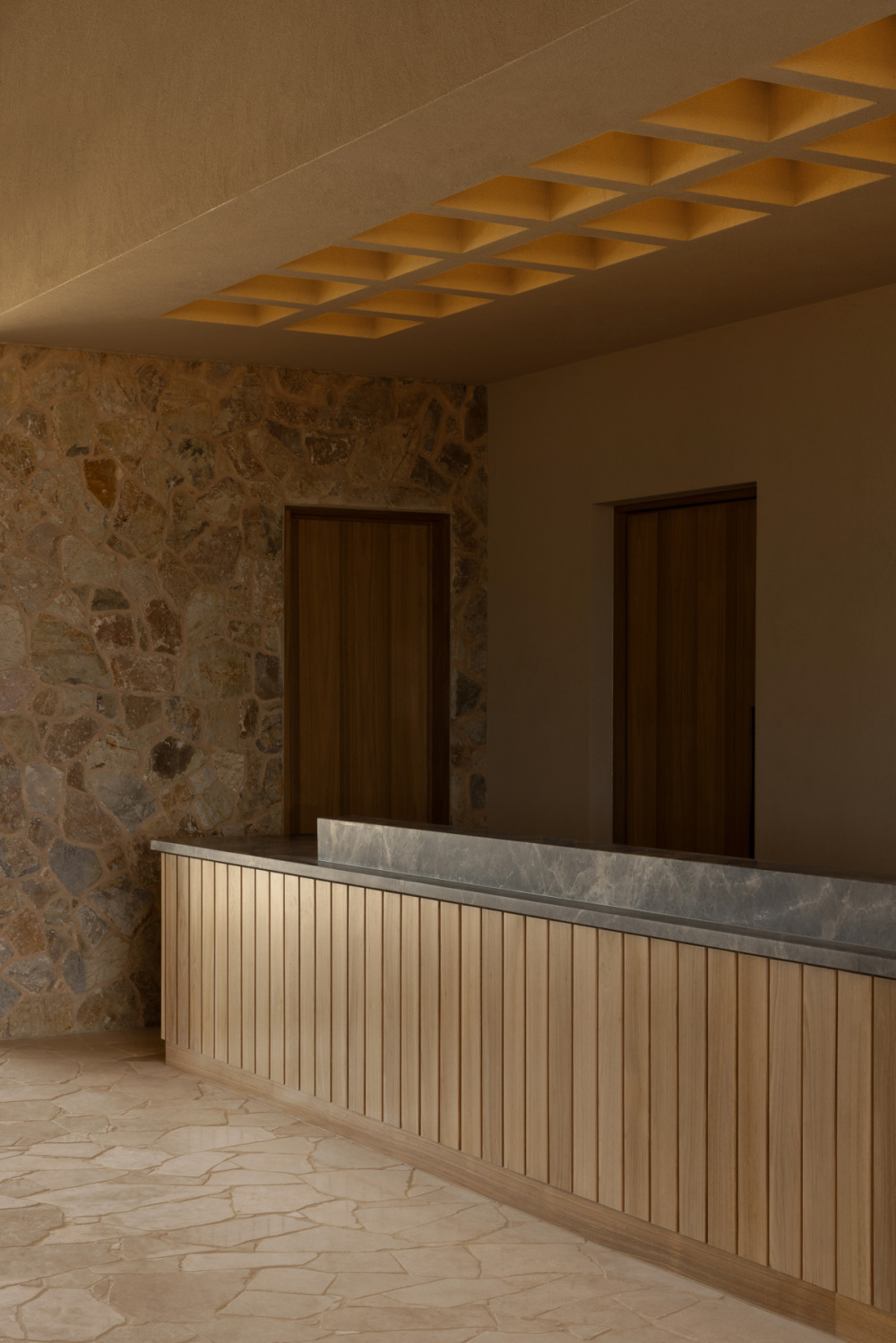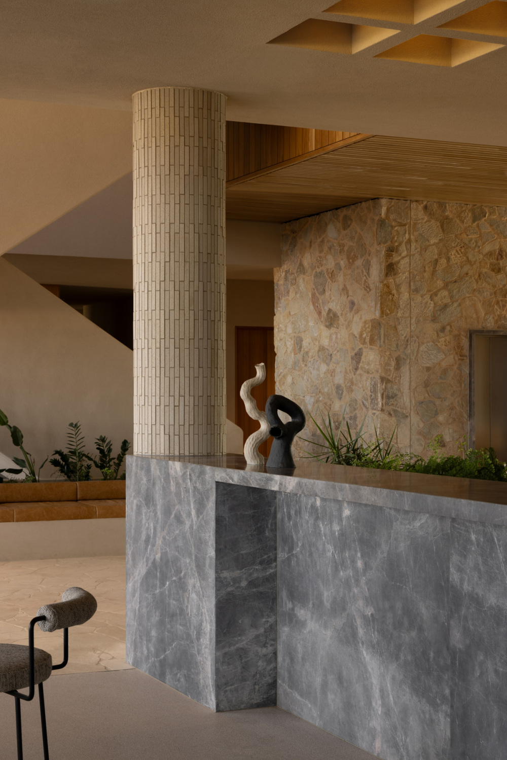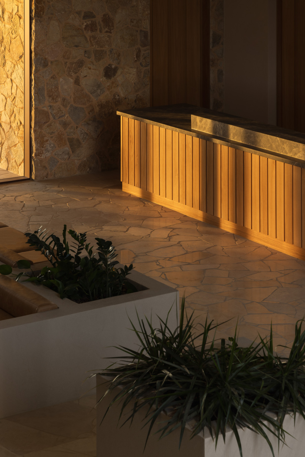 酒店的空间设计,完美诠释了“野性自然”与“高端奢华”的平衡——以粗犷的自然材质为底,用精致的工艺与舒适的配置营造奢华体验,让住客在与野生动物相伴的同时,尽享静谧与惬意。大堂作为空间核心,以黑皮桉树板材构建的“编织感”天花板奠定自然基调,地面采用质感温润的奶白色洞石,粗犷的石砌墙面与细腻的木质细节形成对比,既呼应了澳洲干旱地区的原始地貌,又避免了自然元素的生硬堆砌。成为视觉焦点的渐变混凝土吧台,由格拉姆工作室联合福姆思公司(Form-s)共同打造,现场浇筑、手工夯筑的工艺让表层呈现出层次丰富的桃色渐变,与当地马里林区的地貌色调相映成趣,粗犷的混凝土材质与精细的渐变效果,成为“野性与奢华”平衡的最佳注脚。客房区域则将“沉浸式体验”做到极致。弧形楼梯盘旋而上通向二层,两个翼楼中的客房静谧雅致,亚麻窗帘垂落间营造出私密氛围。客房布局暗藏巧思:一半面朝酒店人工水坑,住客可在房间内静候长颈鹿、印度黑羚等野生动物到访;另一半朝向野生动物园,推窗便是广袤的岩石平原与跳跃的袋鼠,让“与自然共生”的体验无需刻意追寻。房间内摆放的怀特夫妇家居品牌(Mr and Mrs White)美洲橡木沙发,温润质感与亚麻窗帘、木质家具形成统一,为野性的自然景观增添了家的温暖。由南澳吉尼森设计工作室(Genesin Studio)操刀的水疗中心,是“静谧奢华”的代表。空间延续了编织元素与自然材质的运用,柔和的灯光、温润的木质理疗床与石质SPA池,共同构筑起远离喧嚣的疗愈场域,让住客在舒缓身心的同时,仍能通过通透的界面感知户外的自然气息,实现“疗愈与自然的无缝衔接”。