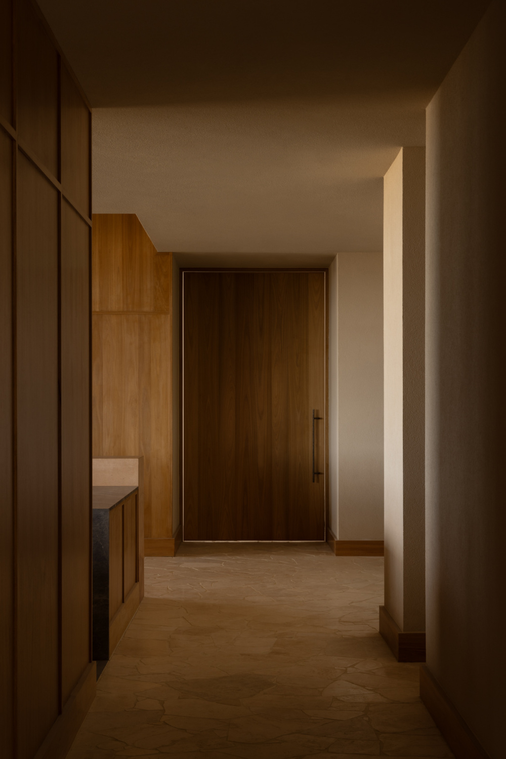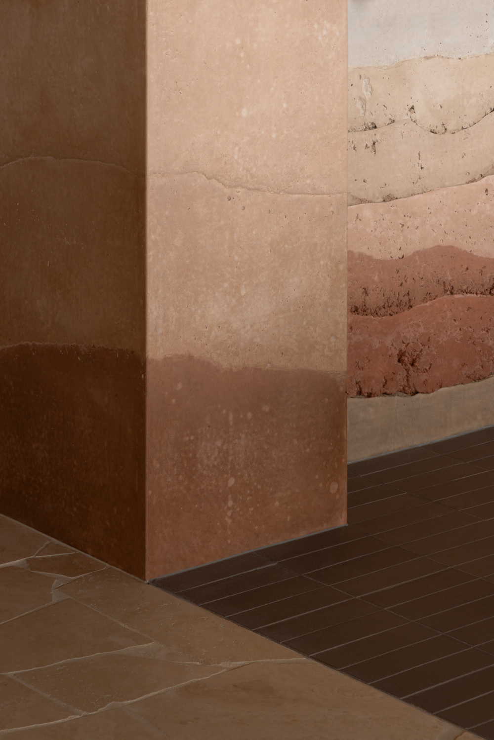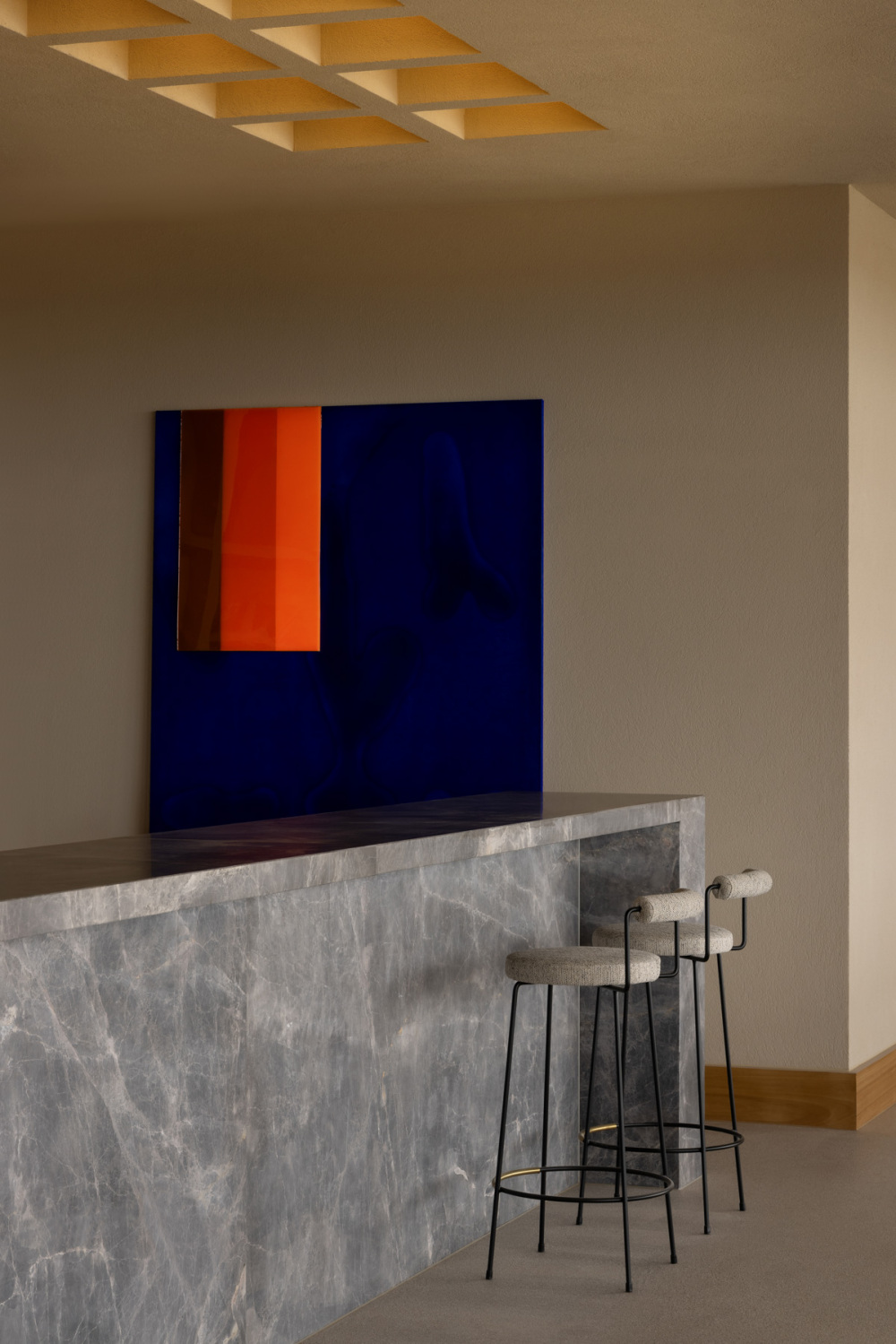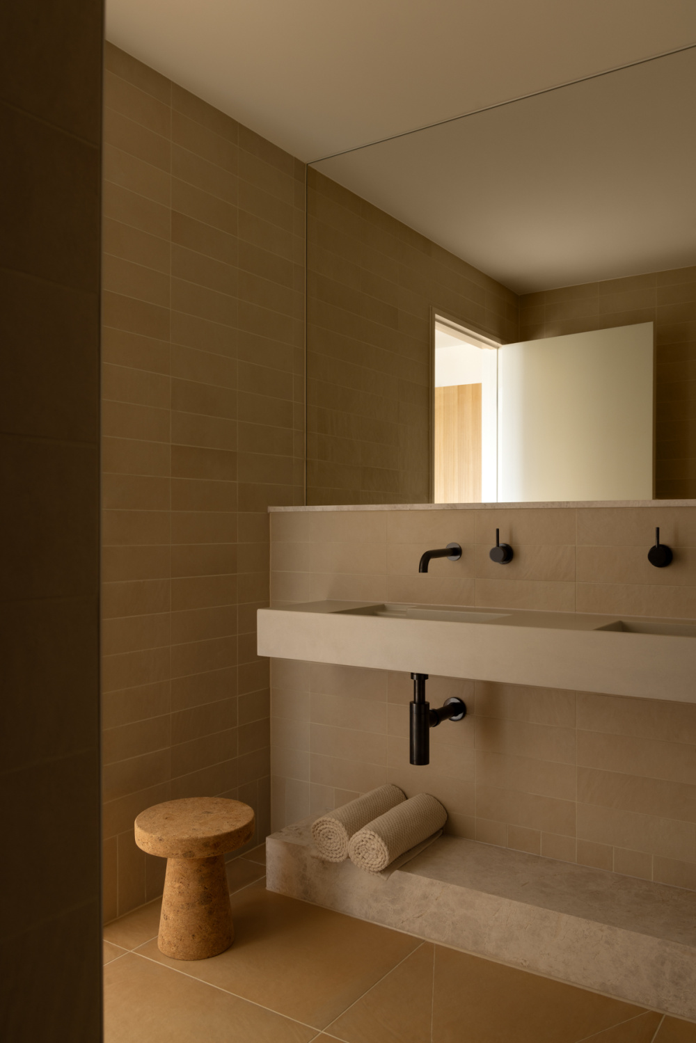 酒店的空间设计,完美诠释了“野性自然”与“高端奢华”的平衡——以粗犷的自然材质为底,用精致的工艺与舒适的配置营造奢华体验,让住客在与野生动物相伴的同时,尽享静谧与惬意。大堂作为空间核心,以黑皮桉树板材构建的“编织感”天花板奠定自然基调,地面采用质感温润的奶白色洞石,粗犷的石砌墙面与细腻的木质细节形成对比,既呼应了澳洲干旱地区的原始地貌,又避免了自然元素的生硬堆砌。成为视觉焦点的渐变混凝土吧台,由格拉姆工作室联合福姆思公司(Form-s)共同打造,现场浇筑、手工夯筑的工艺让表层呈现出层次丰富的桃色渐变,与当地马里林区的地貌色调相映成趣,粗犷的混凝土材质与精细的渐变效果,成为“野性与奢华”平衡的最佳注脚。客房区域则将“沉浸式体验”做到极致。弧形楼梯盘旋而上通向二层,两个翼楼中的客房静谧雅致,亚麻窗帘垂落间营造出私密氛围。客房布局暗藏巧思:一半面朝酒店人工水坑,住客可在房间内静候长颈鹿、印度黑羚等野生动物到访;另一半朝向野生动物园,推窗便是广袤的岩石平原与跳跃的袋鼠,让“与自然共生”的体验无需刻意追寻。房间内摆放的怀特夫妇家居品牌(Mr and Mrs White)美洲橡木沙发,温润质感与亚麻窗帘、木质家具形成统一,为野性的自然景观增添了家的温暖。由南澳吉尼森设计工作室(Genesin Studio)操刀的水疗中心,是“静谧奢华”的代表。空间延续了编织元素与自然材质的运用,柔和的灯光、温润的木质理疗床与石质SPA池,共同构筑起远离喧嚣的疗愈场域,让住客在舒缓身心的同时,仍能通过通透的界面感知户外的自然气息,实现“疗愈与自然的无缝衔接”。