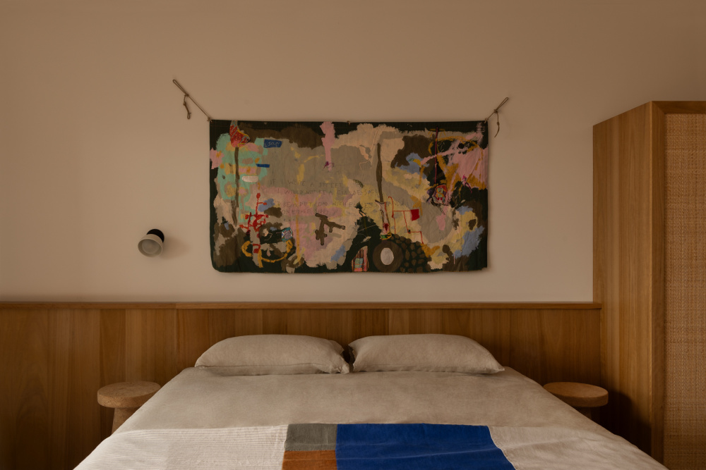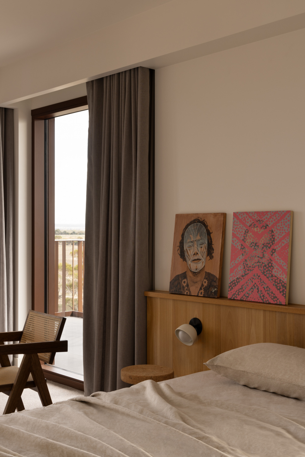 酒店设计的起点,是对澳洲与非洲“在地基因”的深度挖掘与联结。格拉姆工作室总监格雷厄姆・沙博诺(Graham Charbonneau)发现,南澳灌木丛林地与非洲稀树草原虽隔重洋,却在美学与文化层面有着惊人的共通之处——原始的自然肌理、生命力蓬勃的生态,以及代代相传的手工技艺,都成为跨洲灵感融合的纽带。而串联这一切的核心线索,便是“编织元素”。编织工艺既是酒店所在地恩加林杰里族珍视的艺术瑰宝,其纹样又与非洲历史悠久的篮筐编织工艺异曲同工,这种“跨文化共鸣”让编织元素成为天然的设计核心。酒店地处阿德莱德市以东70公里的恩加林杰里族传统领地,将当地编织技艺融入设计,既是对本土文化的尊重,也为“澳非融合”找到了最具温度的表达载体,让空间从诞生之初便承载着文化传承的使命。