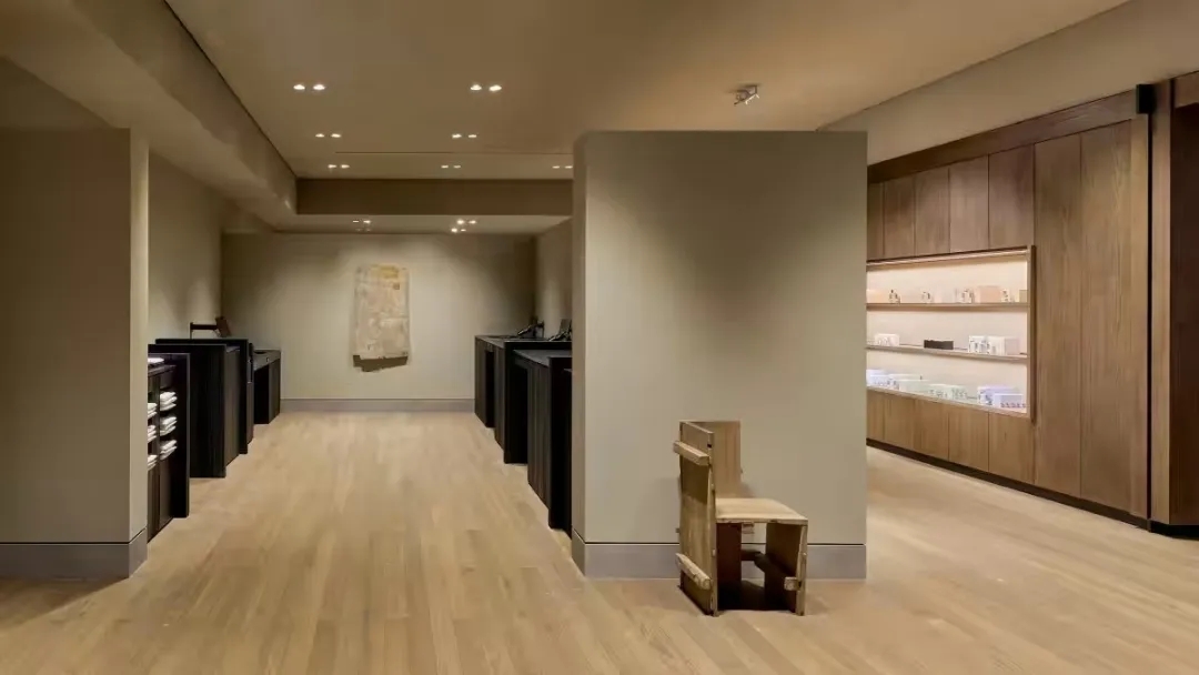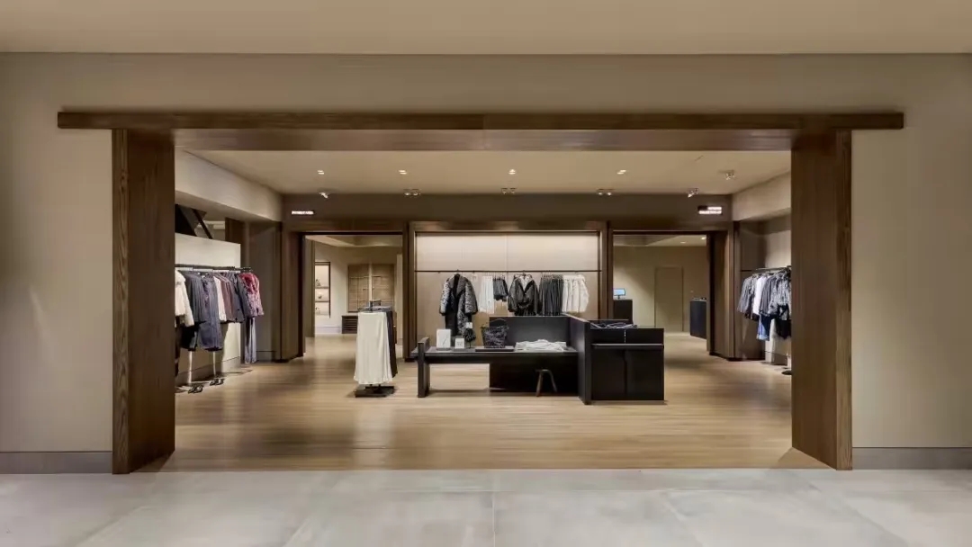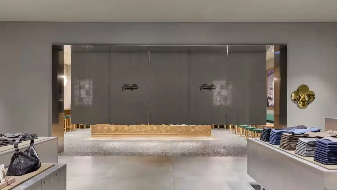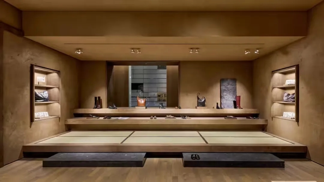 榻榻米的编织肌理被抽象运用于地面铺装与展示台边缘,其天然的温暖质感与 ZARA 的时尚单品形成 “传统工艺与现代设计” 的材质共鸣;土墙的粗糙肌理则以艺术化的方式呈现于墙面装饰,与金属、玻璃等现代材质形成 “粗与细”“冷与暖” 的对比,传递出 “历史与现代性完美共存” 的设计哲学。暖帘不再是单纯的文化符号,而是被赋予 “空间分区” 的功能。不同区域的暖帘采用不同纹样与色彩,既划分了女性系列、儿童系列、鞋包区等功能模块,又以日式美学的细腻感,让空间过渡自然流畅,避免了传统零售空间的生硬割裂。