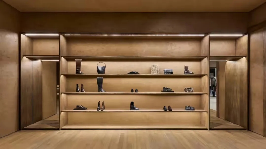 女性系列的空间以柔和的色调与曲线元素为主,传递优雅时尚感;儿童系列则融入更多趣味设计与鲜艳色彩,打造亲子互动的欢乐场域;“鞋 & 包区” 通过精致的陈列与灯光设计,凸显鞋包单品的高品质质感,每一个区域都有专属的 “体验记忆点”。空间动线设计既保障了 “逛店的流畅性”,又暗藏 “视觉惊喜”。例如,从女性系列区域向儿童系列过渡时,通过暖帘与材质的渐变,让风格转换自然;鞋包区的灯光聚焦与单品陈列,成为逛店途中的 “视觉高潮”,激发顾客的探索欲与购买欲。