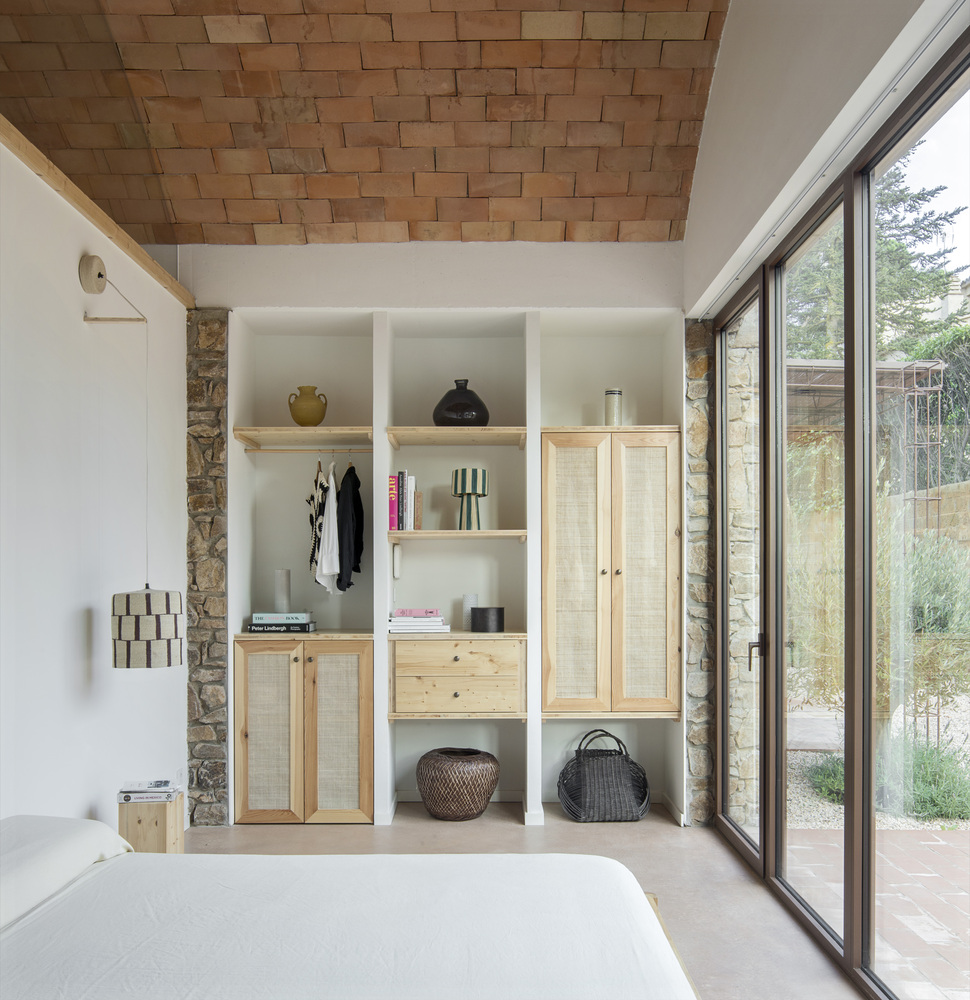 住宅的结构清晰简洁:四个拱顶覆盖主要空间,由厚壁箱体和平屋顶支撑,后者用于抵消拱顶的推力,并作为清洁、储物等服务功能区。拱顶宽 5 米、长 9 米,既遵循了卡莱利亚德帕拉弗鲁赫尔(Calella de Palafrugell)老渔民小屋的传统比例,又与地形相适应。服务箱体的比例为拱顶的一半,主要用于调节建筑的气候环境。