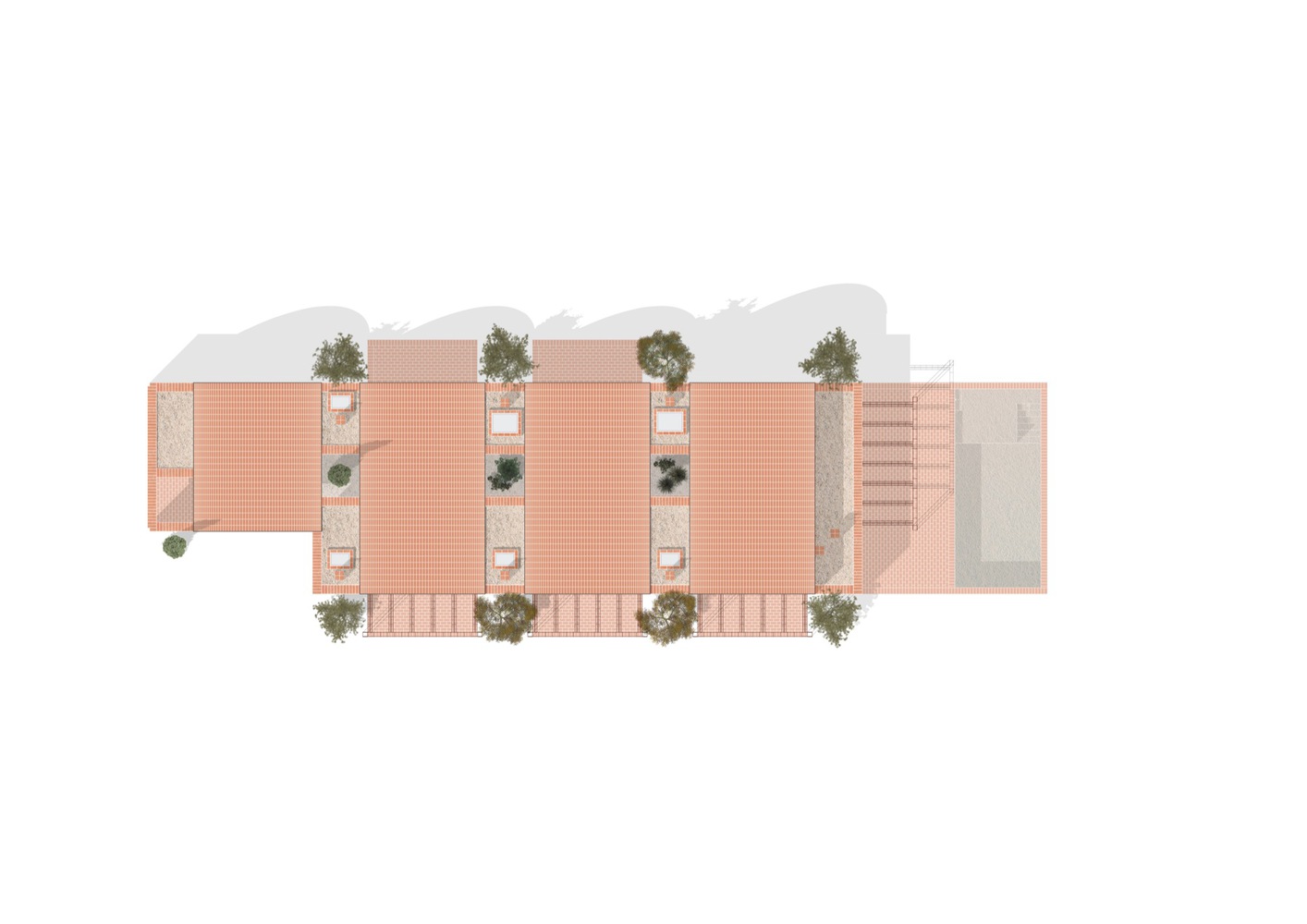 使用这座建筑是一场调动感官的体验。朝向外部的开放拱顶与包裹着本土石材的封闭箱体持续对话,在建筑中营造出压缩与释放、封闭与通透、外向与内向的节奏性对比。绿色庭院自然融入建筑生态系统,辅助自然气候调控并净化环境。建筑的几何形态、材料运用、厚重的围护结构与整体布局,共同勾勒出 “洞穴式” 居住的意象。