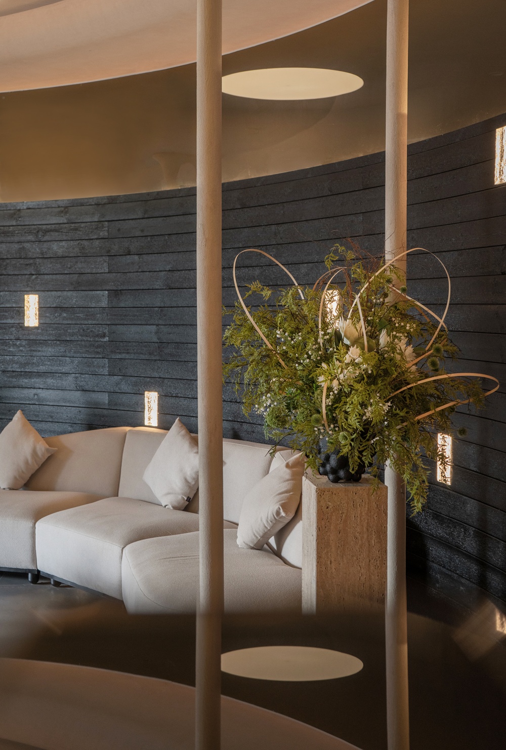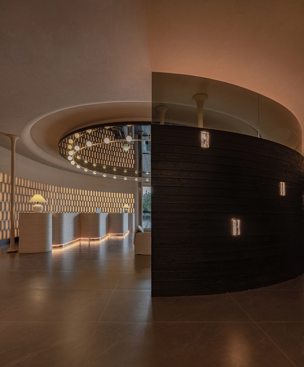 花沐澜水疗空间的 “疗愈感”,从踏入主入口的那一刻便已开启。原本空阔直接的展示大厅,被设计师用两片弧形墙重新定义 —— 它们如同太极图的阴阳边界,既连接起大厅与内部空间,又自然划分出功能区域,让动线告别 “直来直往的仓促”,多了 “迂回转折的诗意”。