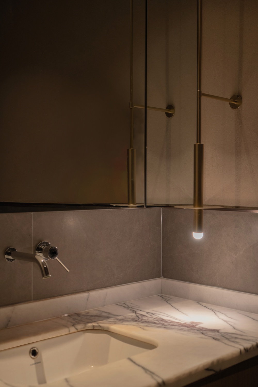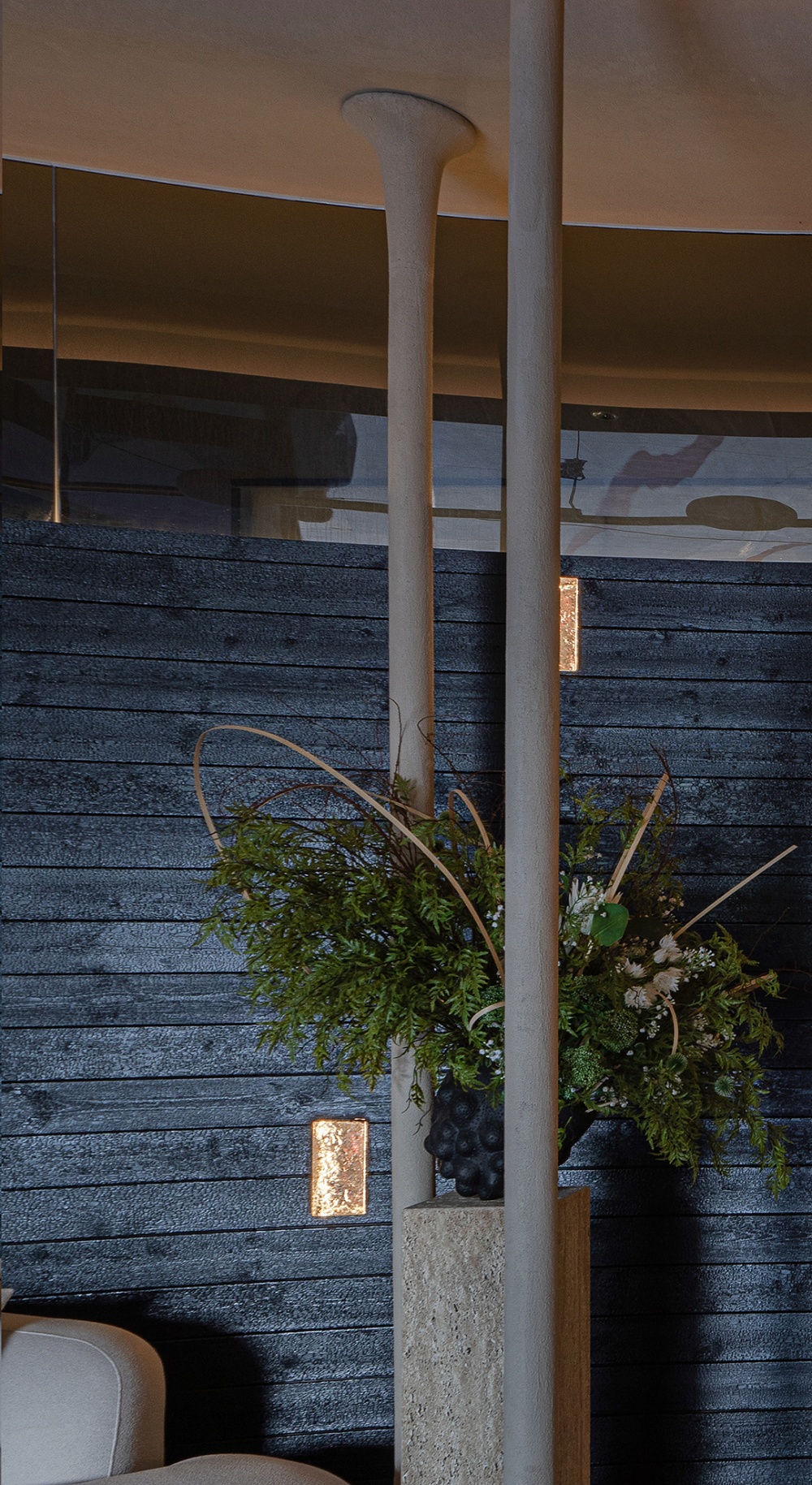 光线的 “柔”,体现在对氛围的营造上:自然光透过半透的隔断,被过滤成柔和的光斑,洒在碳木板与青苔墙面上,抚平等待的焦躁;室内光则经墙面、地面反射,温和地包裹整个空间,没有刺眼的直射光,只有 “像水一样漫开” 的暖意。最动人的是那些 “局部的光”—— 一束光专门照亮一汪清水,波光粼粼间,空间仿佛有了灵动的呼吸;另一束光勾勒出圆柱的筋骨,让原本厚重的柱子,变成了光影里的 “线条艺术”。