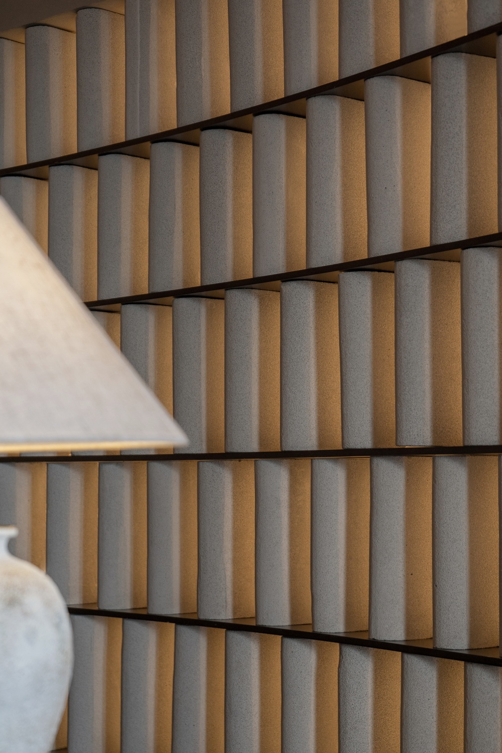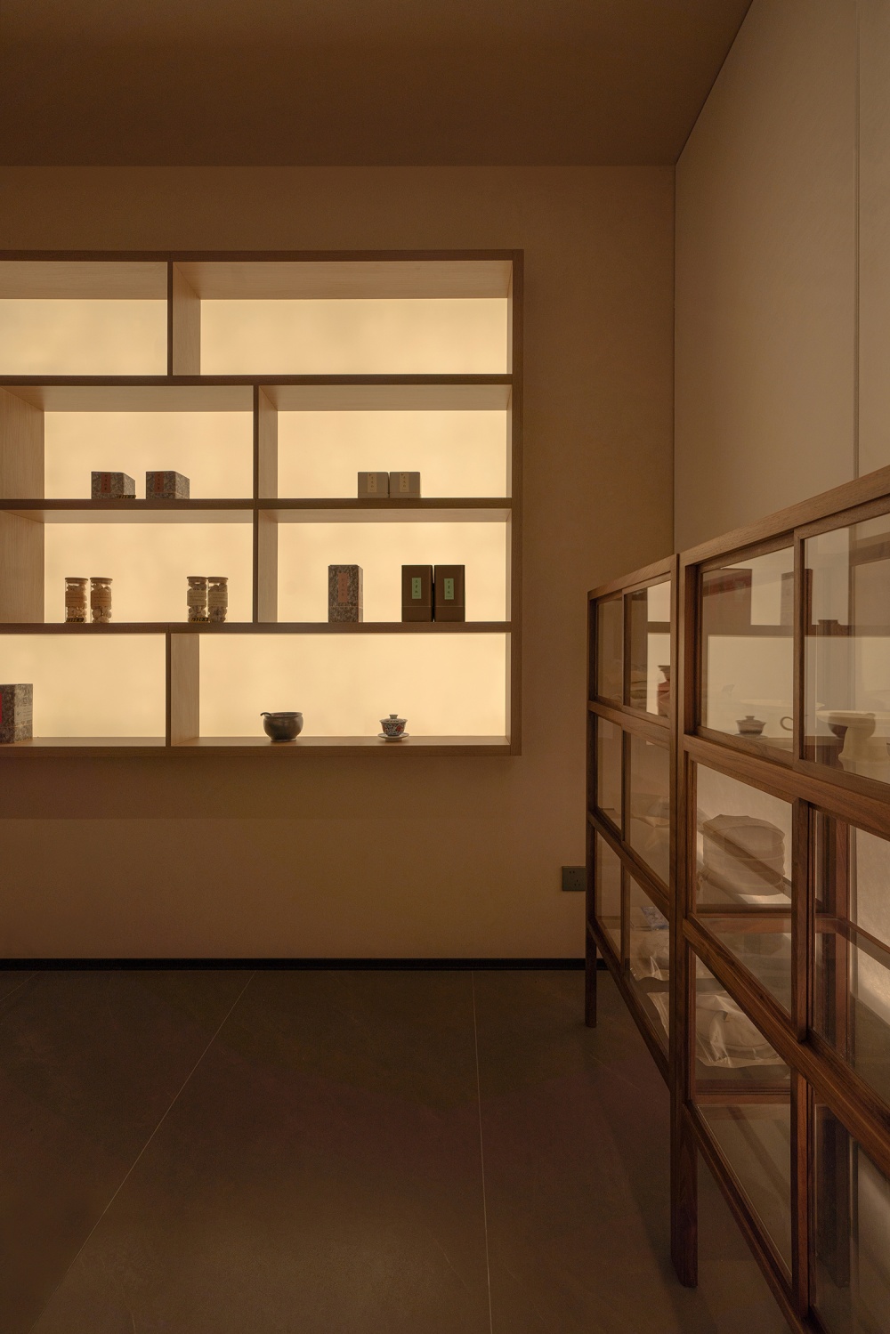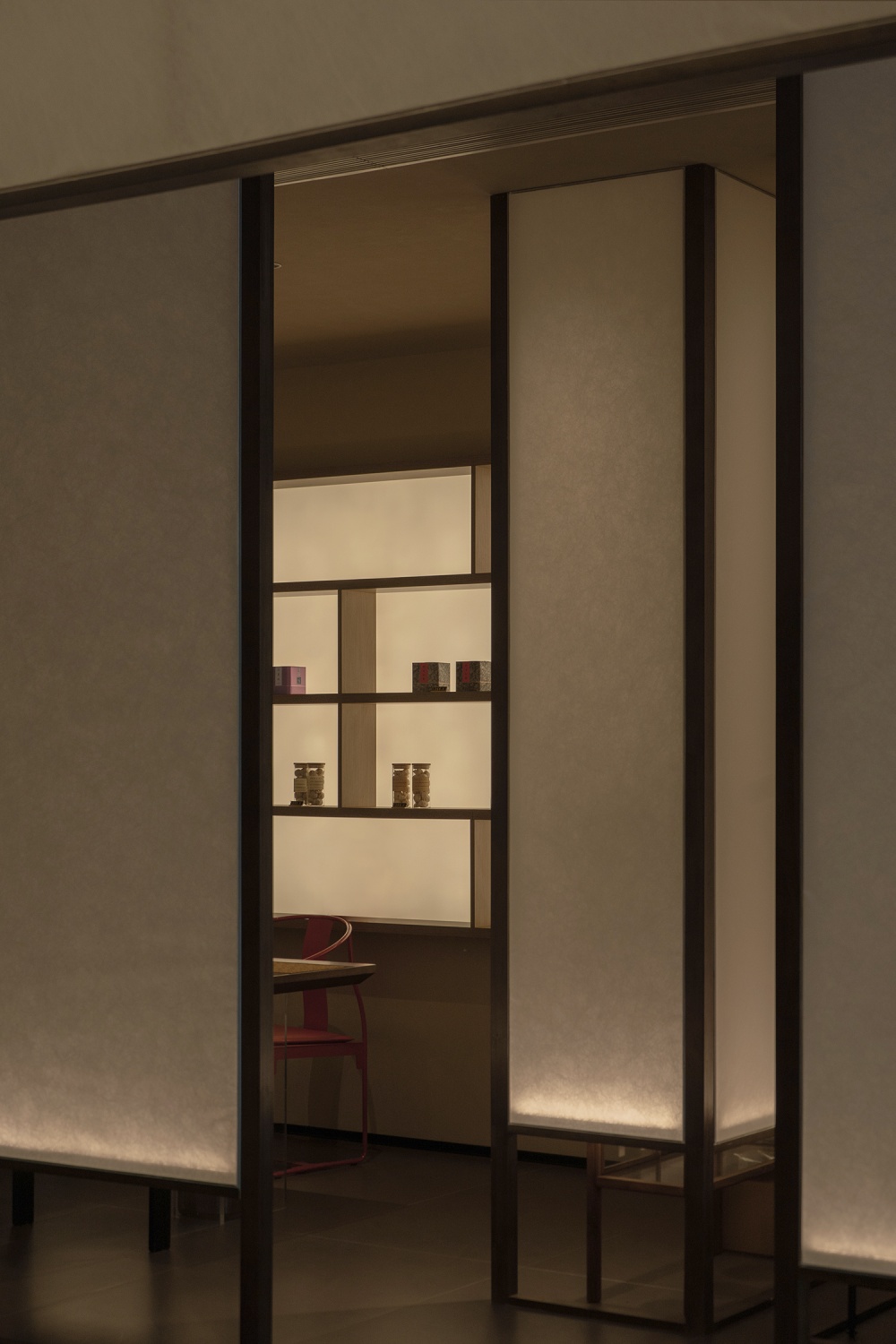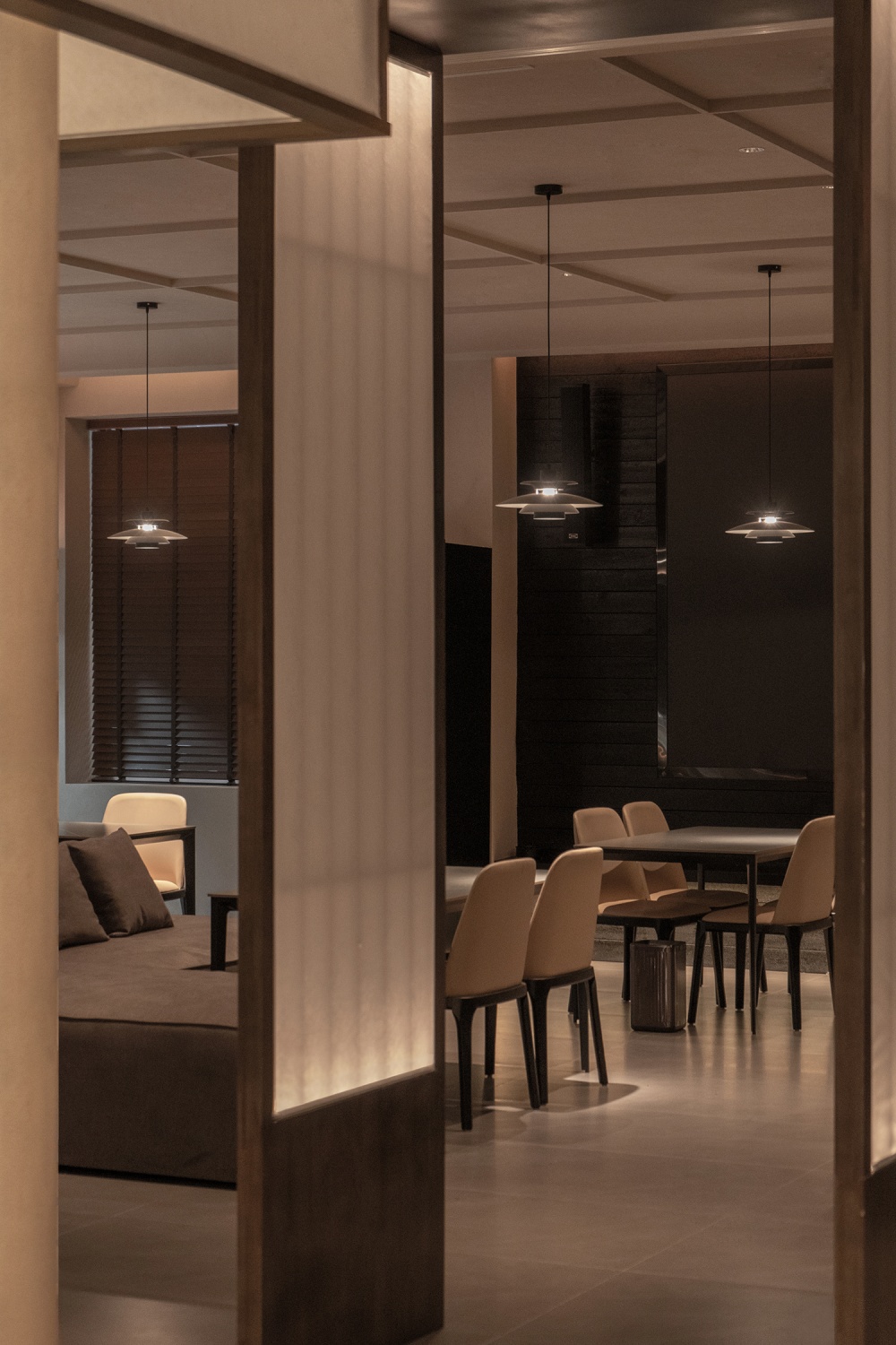而影的 “虚”,则让空间层次愈发深邃:纸质隔断投下的朦胧影子,落在茶室的地面上,随光线变化慢慢移动;格栅屏风的影子,在墙面形成有规律的纹理,像一幅动态的水墨画。光与影的互动,让静态的空间有了 “流动的韵律”—— 光为 “显”,勾勒出空间的轮廓;影为 “藏”,留下想象的留白,一显一藏间,东方美学的含蓄与空灵,被展现得淋漓尽致。