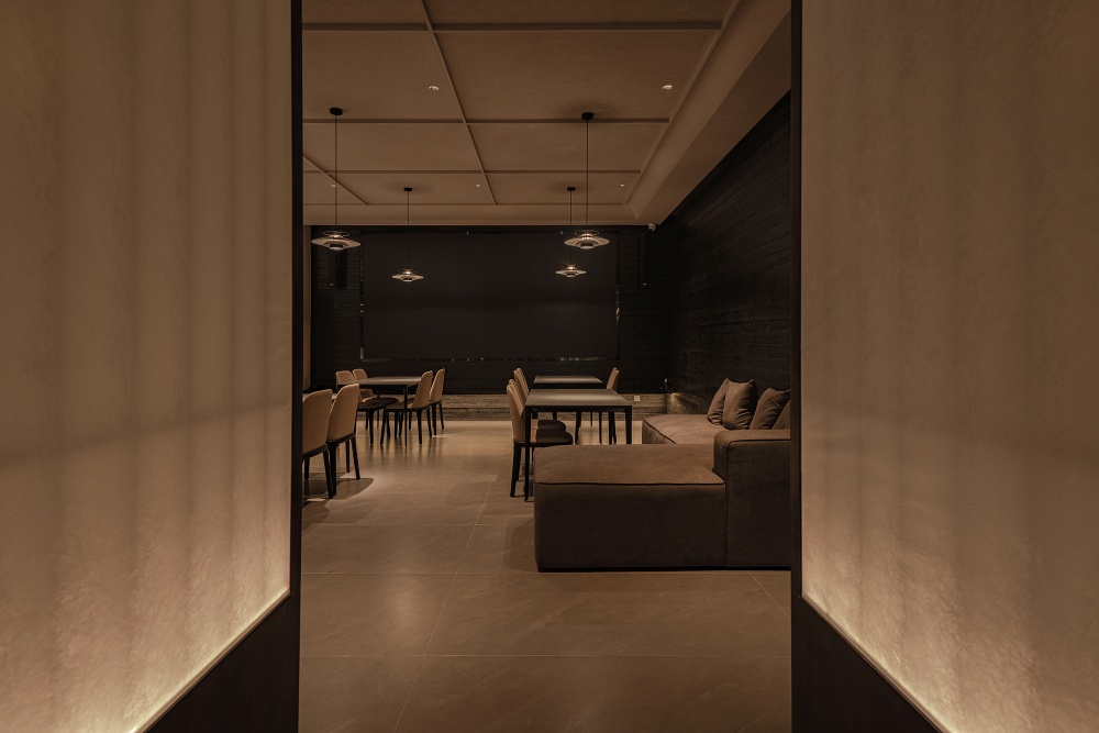 茶室摒弃了生硬的砖墙隔断,改用内透光的浅色屏风与朦胧纸质隔断 —— 既保证了私密性,又不会让空间显得逼仄,客人在茶室内品茶,视线能透过半透的隔断看到外面的光影,不会有 “封闭的压抑感”;休息区只用四根圆柱撑起一方天地,简单的沙发茶几,搭配碳木板与青苔墙面,柔和的天光洒进来,哪怕是等待的时间,也变成了 “享受宁静的时刻”;中轴门则延续了茶室隔断的材质,让空间从休息区到餐厅的过渡更显连贯,若隐若现的格栅,为餐厅注入经典的东方元素,而黑色墙面与自然涂料顶面,又让餐厅多了份 “沉浸式的静谧”,适合疗愈后补充能量。