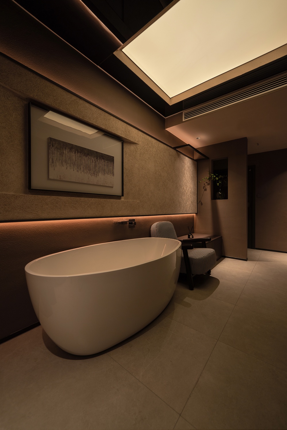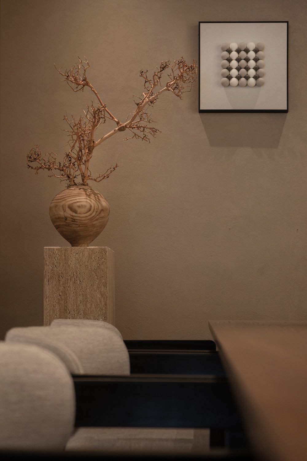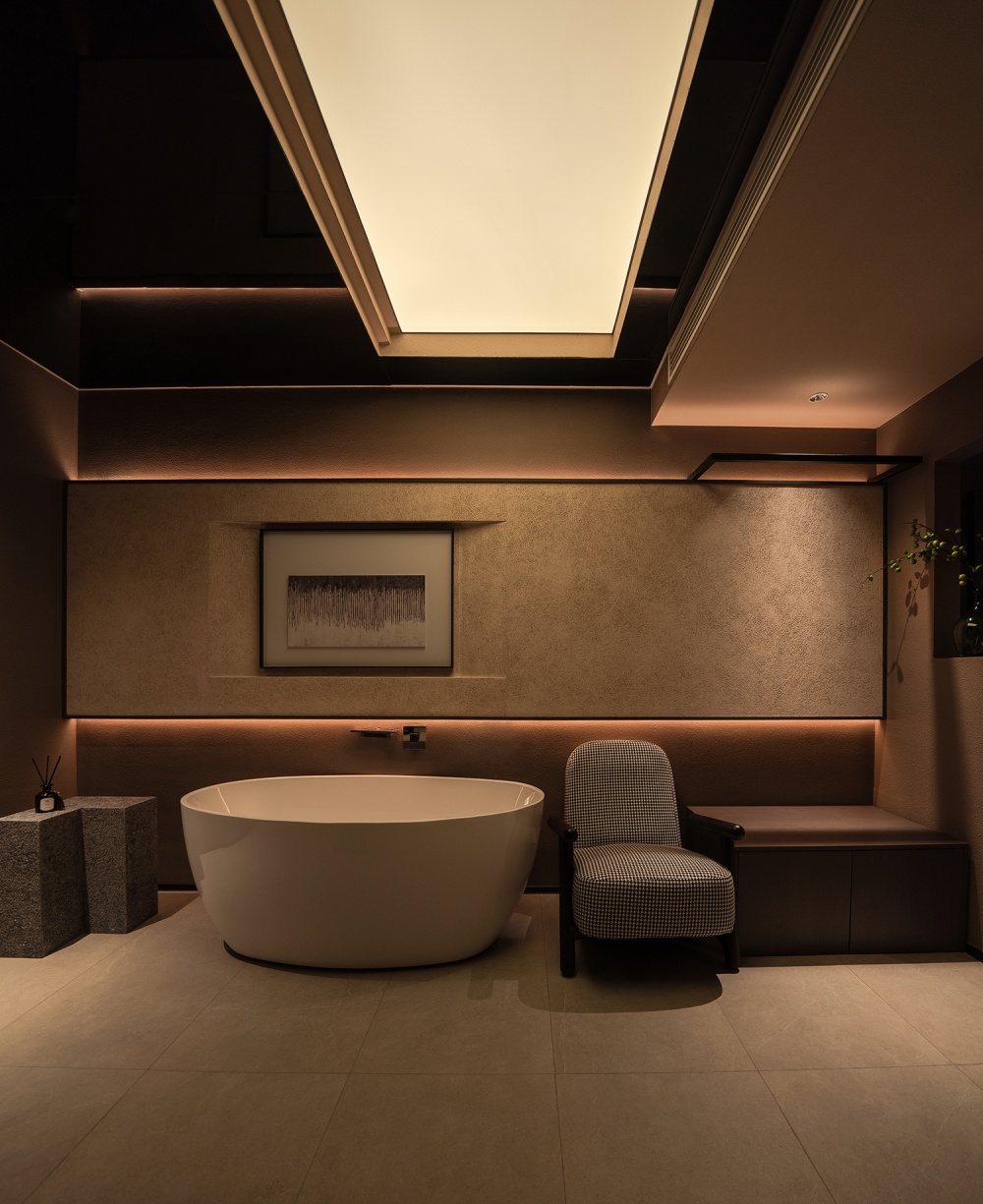 更妙的是碳木板打造的 “卷轴式动线”:连续狭长的黑色碳木板沿着墙面展开,只以低矮枯石和别致插花点缀,没有多余装饰,却像一幅留白的东方画卷。访客沿着这条动线前行,视线被压低,心神也随之收敛,等转过拐角进入休息区与茶室,空间骤然舒展 —— 从 “收” 到 “放” 的节奏变化,让 “进入疗愈状态” 成为一场自然的仪式,无需刻意调整,心已先一步放松。
