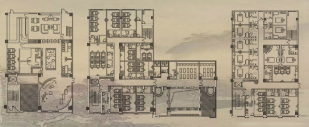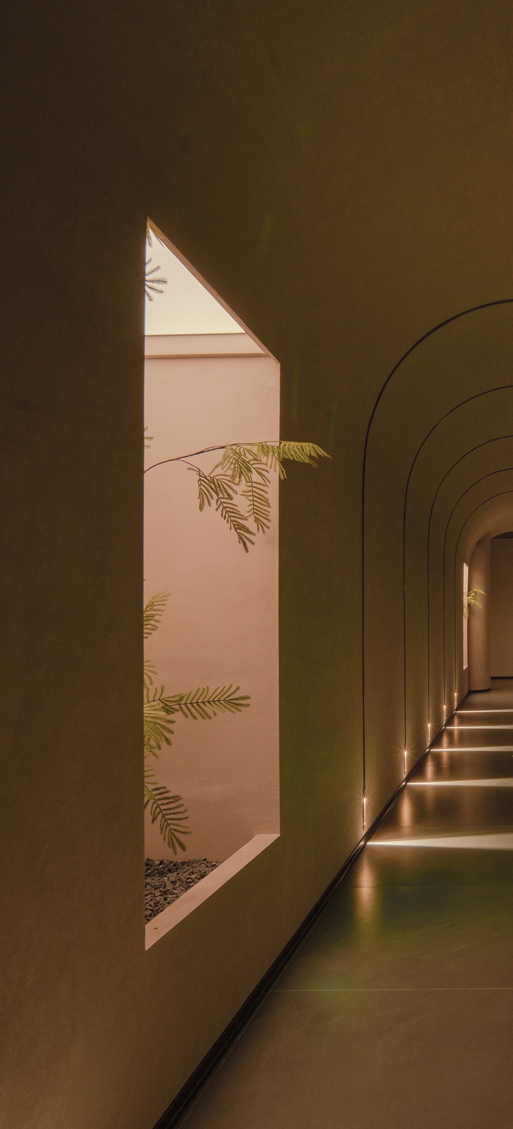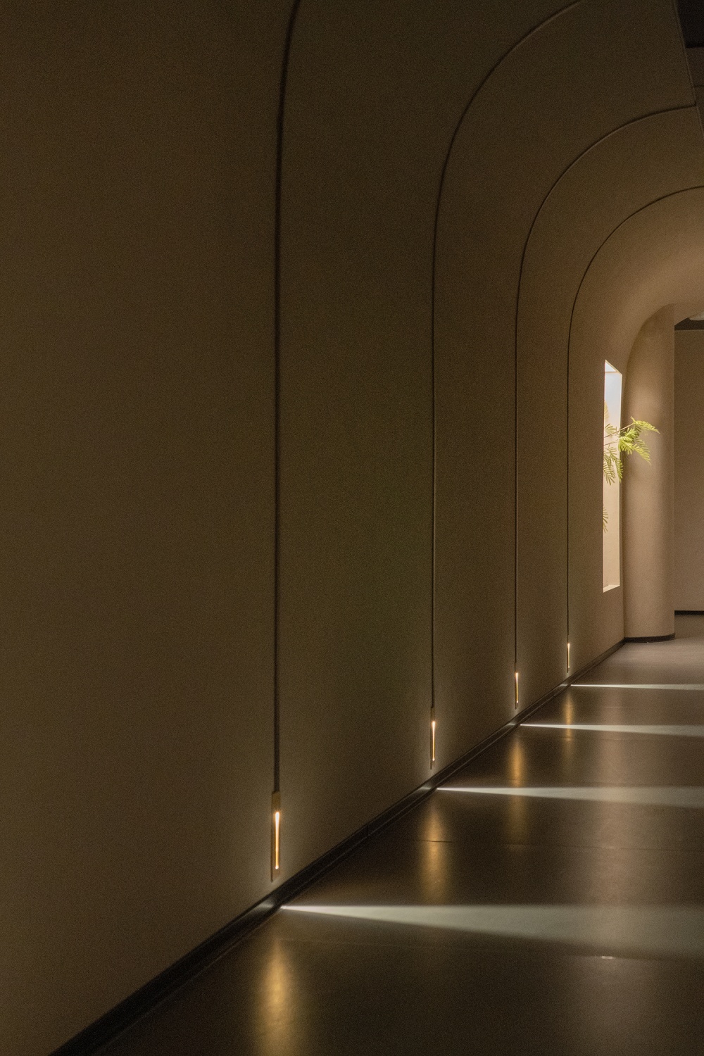 接待前台与沙发区恰好嵌在弧形墙的内凹处,中间留出通透通道,客人走进来,视线会先被前台背景 “波光粼粼的水面” 吸引 —— 那是光与构件共同营造的光影效果,像在空间里装了一汪柔水,瞬间抚平都市带来的浮躁。弧形墙外拱的一侧,与通往电梯厅的通道融合,设计师在此摆放枯石景观,原本普通的通道变成了 “有故事的过渡区”,走在这里,脚步会不自觉放慢,仿佛从花卉市场的热闹,慢慢走进了一处私密的东方庭院。