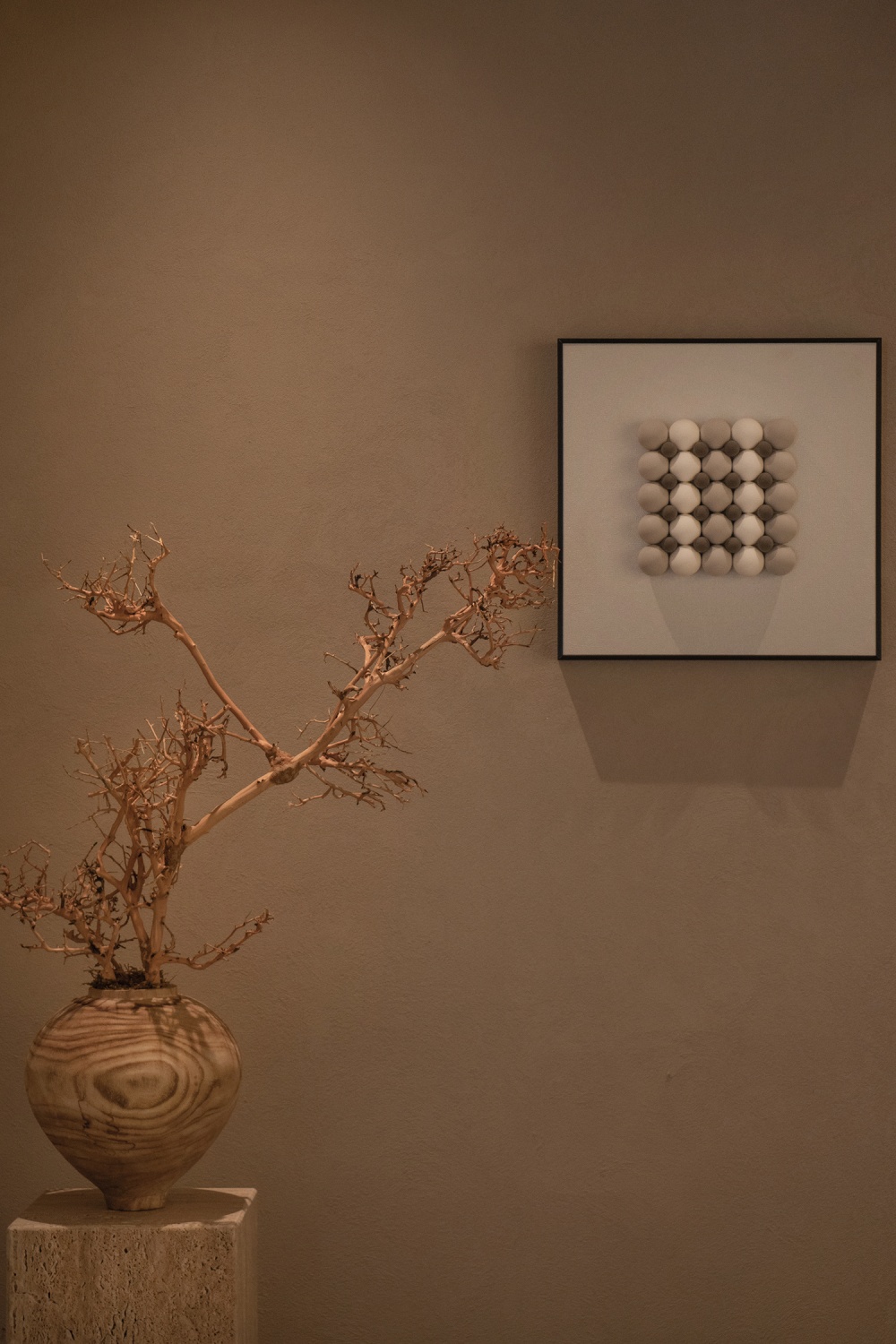 而那些 “点睛之笔” 的自然元素,更让空间有了 “禅意的灵魂”:形态各异的原石景观石,沉默中透着亘古的沉稳;姿态遒劲的枯枝,虽无花叶,却藏着枯荣轮回的生命哲思;每间茶室里的小干景,不用繁复打理,却让气息自由流动。这些元素不是 “装饰的堆砌”,而是东方美学的 “无声表达”—— 在极简的空间里,石、木、枯景以近乎禅意的姿态,诉说着时间与自然的故事,让空间意境从 “好看” 走向 “深远”。