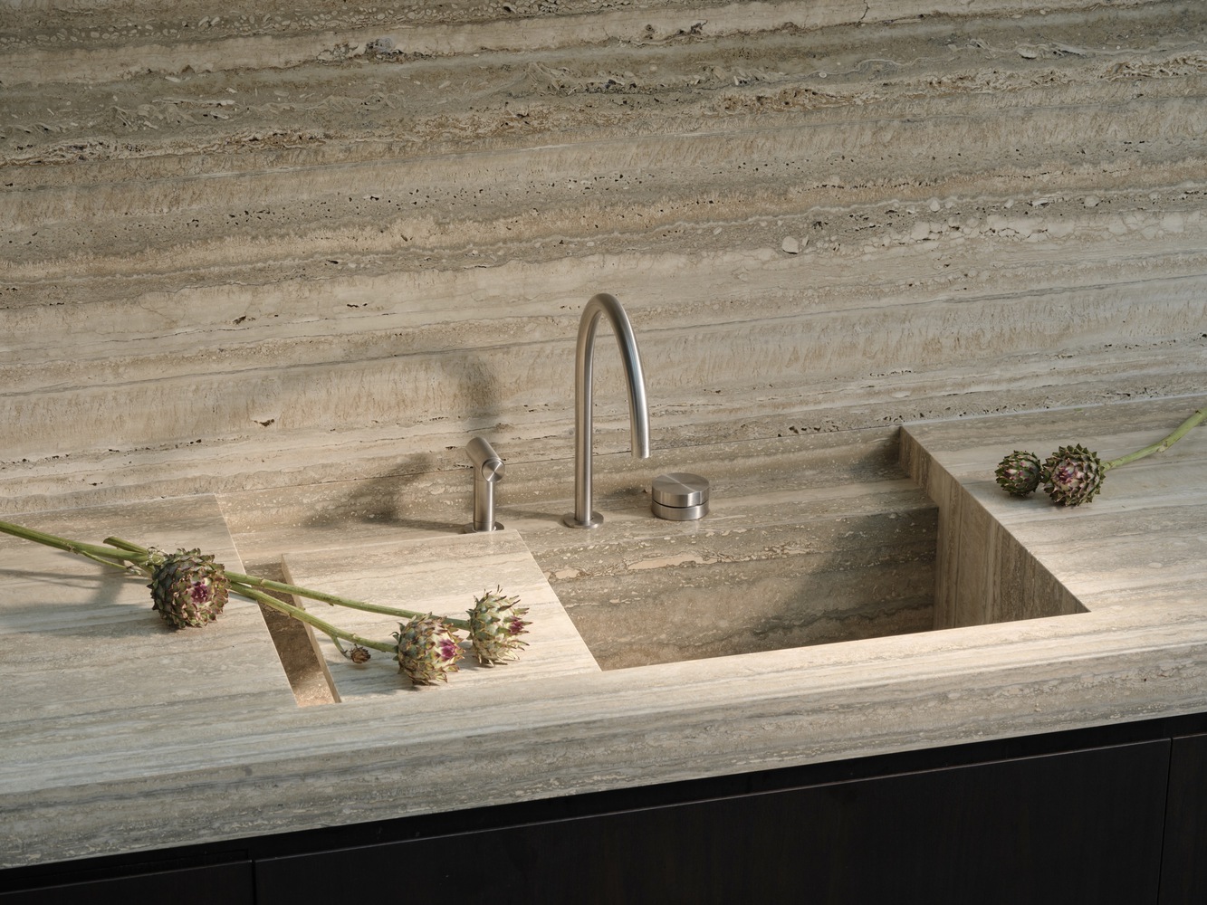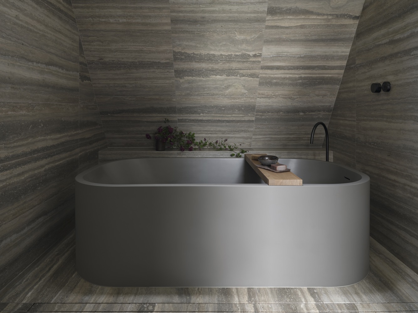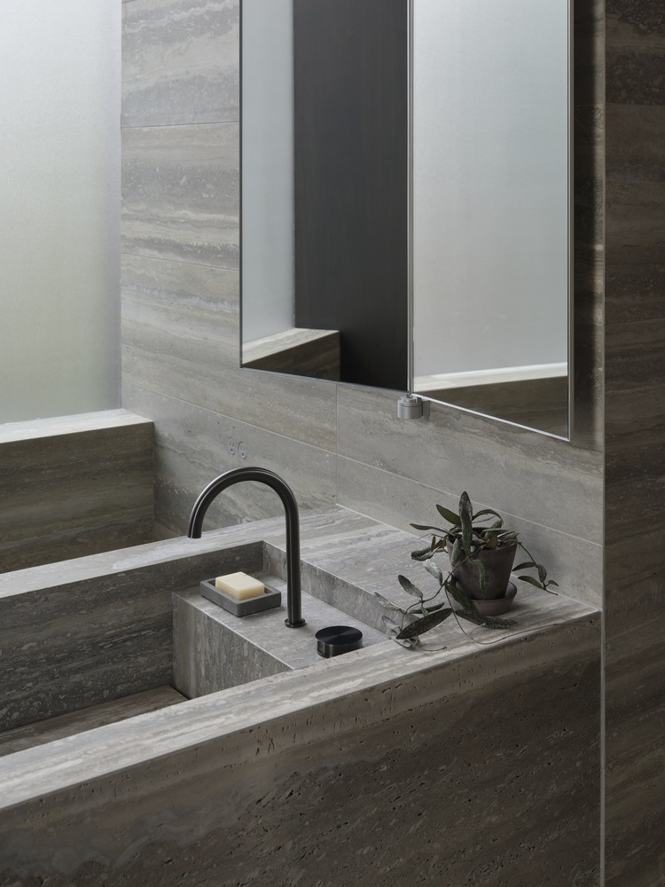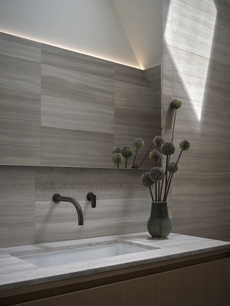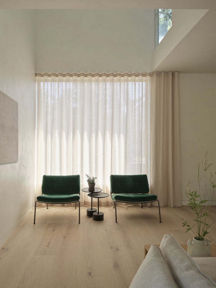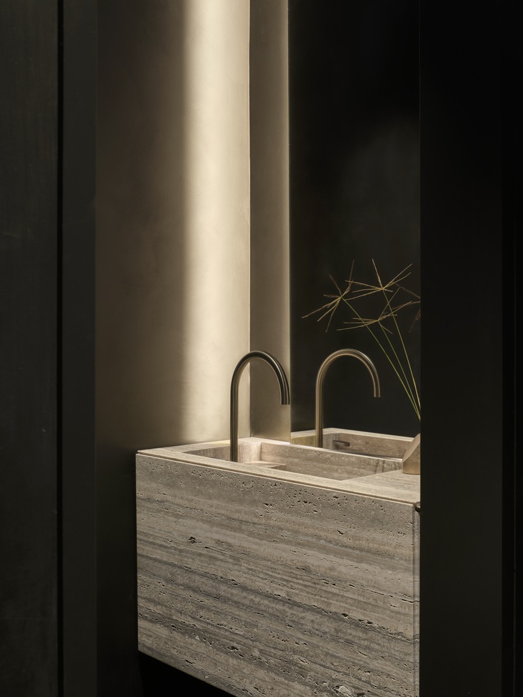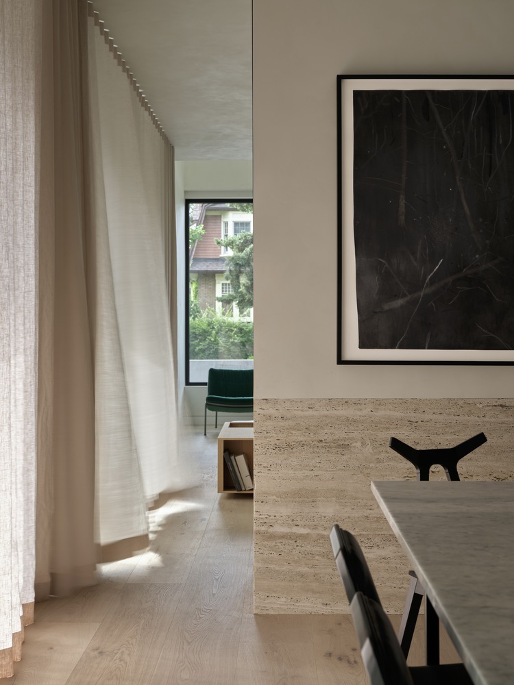 材料氛围融合了 “反派巢穴的深邃” 与 “轻盈避难所的通透”(这实际上是两位合伙人设计理念的结合)。内敛的材料 palette 包括深色染色平锯胡桃木、厚重的未填充石灰华、混凝土和深色质感的石灰洗墙,与双倍挑高的明亮柔和石灰洗墙、宽板结疤白橡木地板以及柔软的亚麻织物形成强烈对比。从压缩的洞穴般空间到通透敞亮的区域,居住者在移动中体验空间叙事的反转。