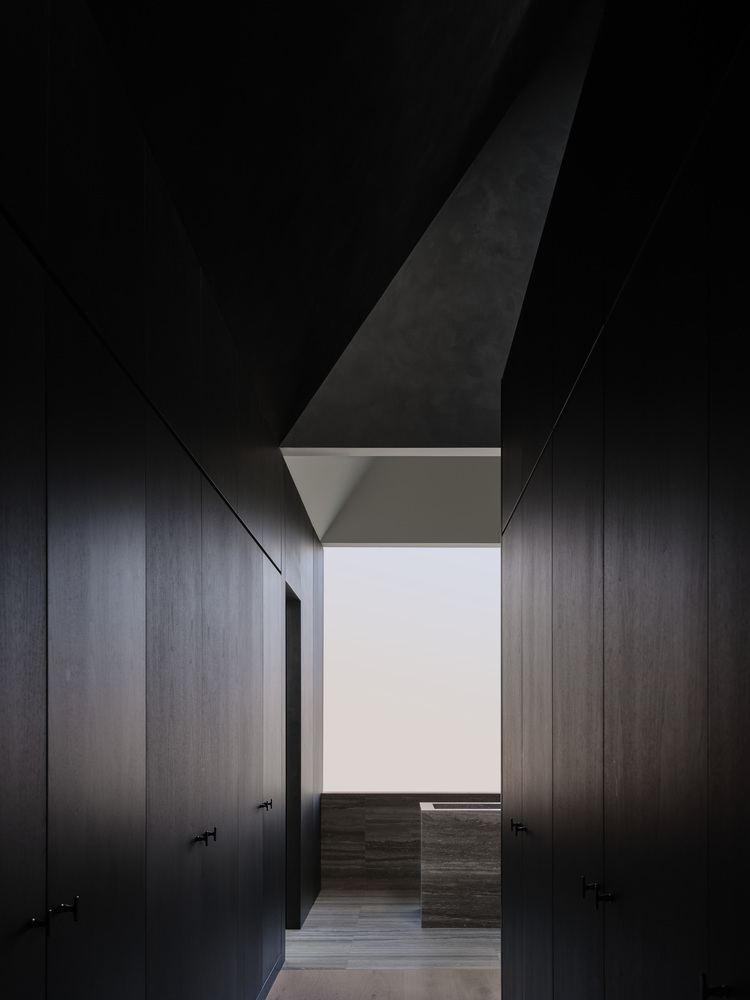住宅的简洁形态由三个深色的整体体量构成:低矮的深色砖砌基座、厚重的三角形石材屋顶,以及高耸的直线型天窗。沉重的屋顶不对称地悬浮在一层上方,悬挑出带顶的车棚和侧露台,在简单的体量之间营造出一种微妙的动态张力。两个天窗在尺寸和材料上相近,却呈现出截然相反的姿态:西侧天窗与地面相接,成为立面的基座;东侧天窗则以悬挑的方式 “悬浮” 在车棚上方,形成视觉上的悬念。