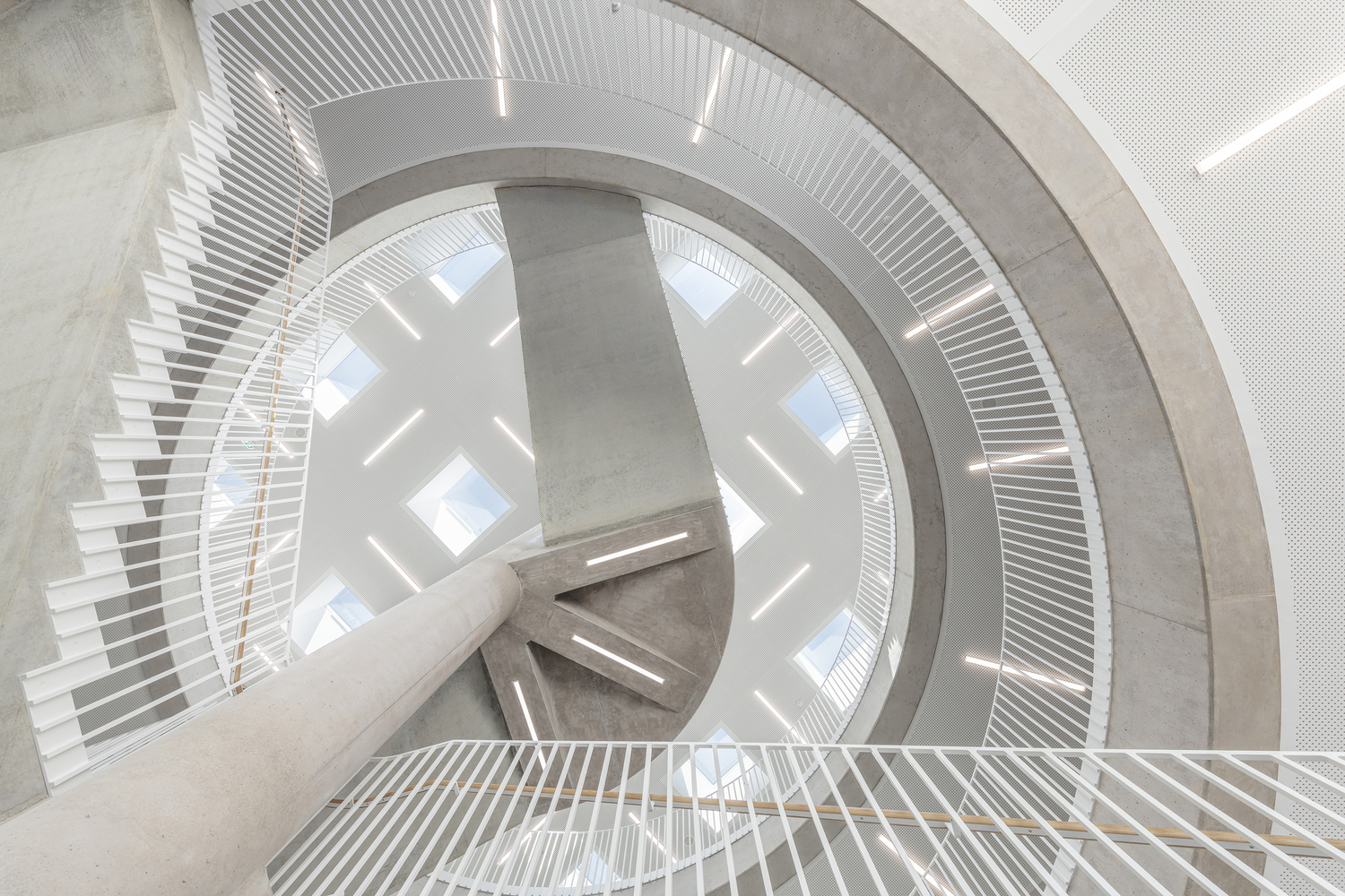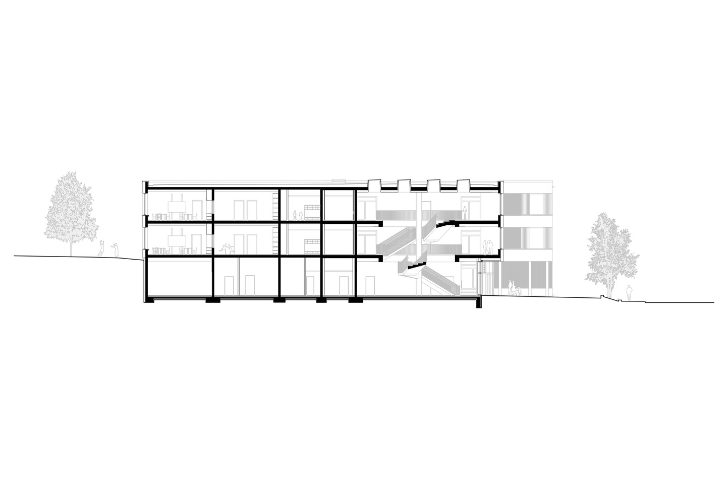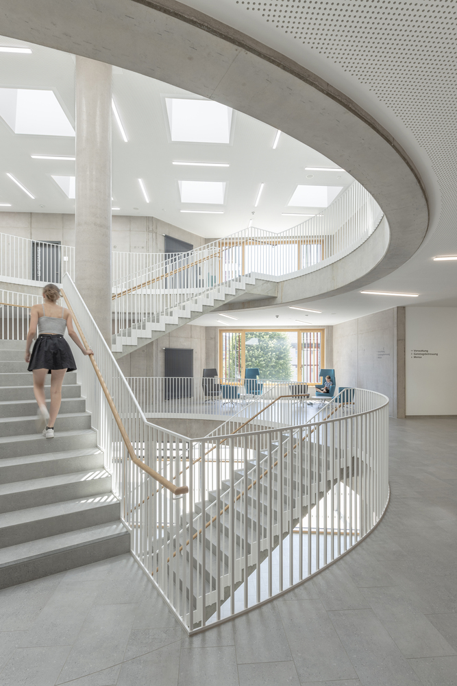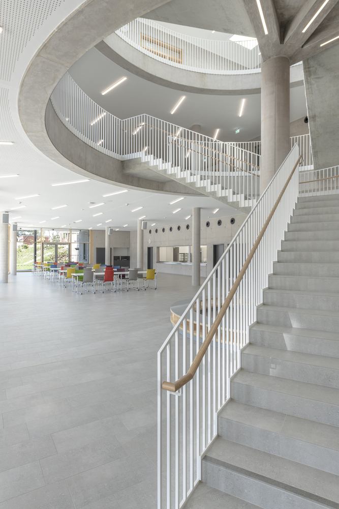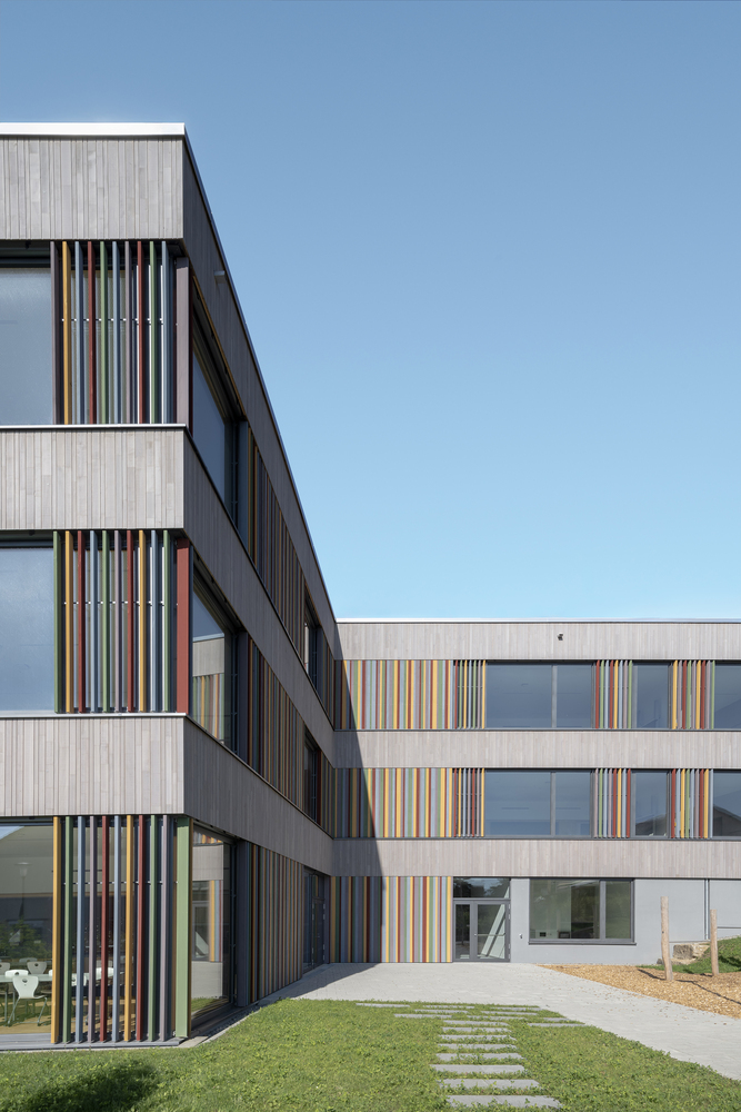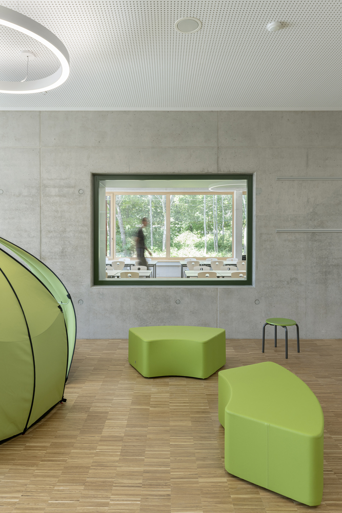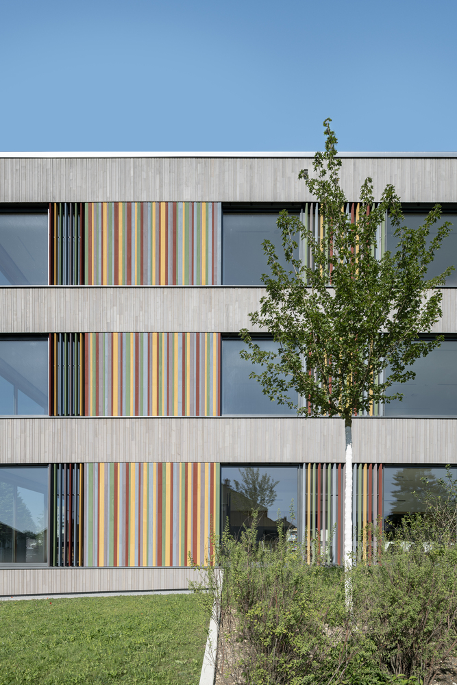 全日制课程的教室也位于底层,并有专门的室外区域。学校行政部门位于中层,由于地势倾斜,可以从上层操场直接进入,也是地面校园的中心。该建筑为实心建筑,外墙为预镀杉木幕墙,内为混凝土核心筒。可开启窗户前的彩色木板条起到防坠落的作用,并将低矮的护栏高度和窗带与外墙融为一体。绿色屋顶配备了一个发电量约为 95 kWp 的光伏系统。