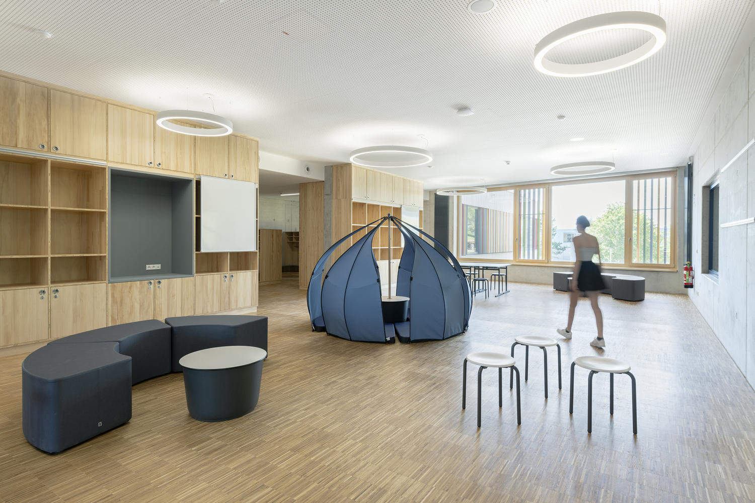第一阶段,在现有学校建筑的东南侧建造了一座独立建筑。该建筑是与学校密切合作设计的,以符合学校的教育需求和理念。教室每三间一组,每组有两间较小的区分教室,围绕着一个所谓的 “市场”。这是一个宽敞、开放的学习区域,可用于小组合作、娱乐、演讲或个人学习。教室通过玻璃门和室内窗户与中央空间相连。