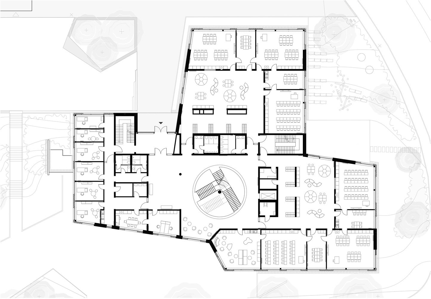 这些 “市场 ”以苜蓿叶的形式围绕中央大厅排列,形成了建筑的足迹。中心被设计成一个横跨所有楼层的中庭,并由天窗照亮。一个开放式楼梯将各楼层与底层的自助餐厅连接起来,自助餐厅也被设计成开放式区域,同时还可用作活动礼堂。建筑立面向南延伸至一个全新设计的前院,将校园外部与集体食堂连接起来。