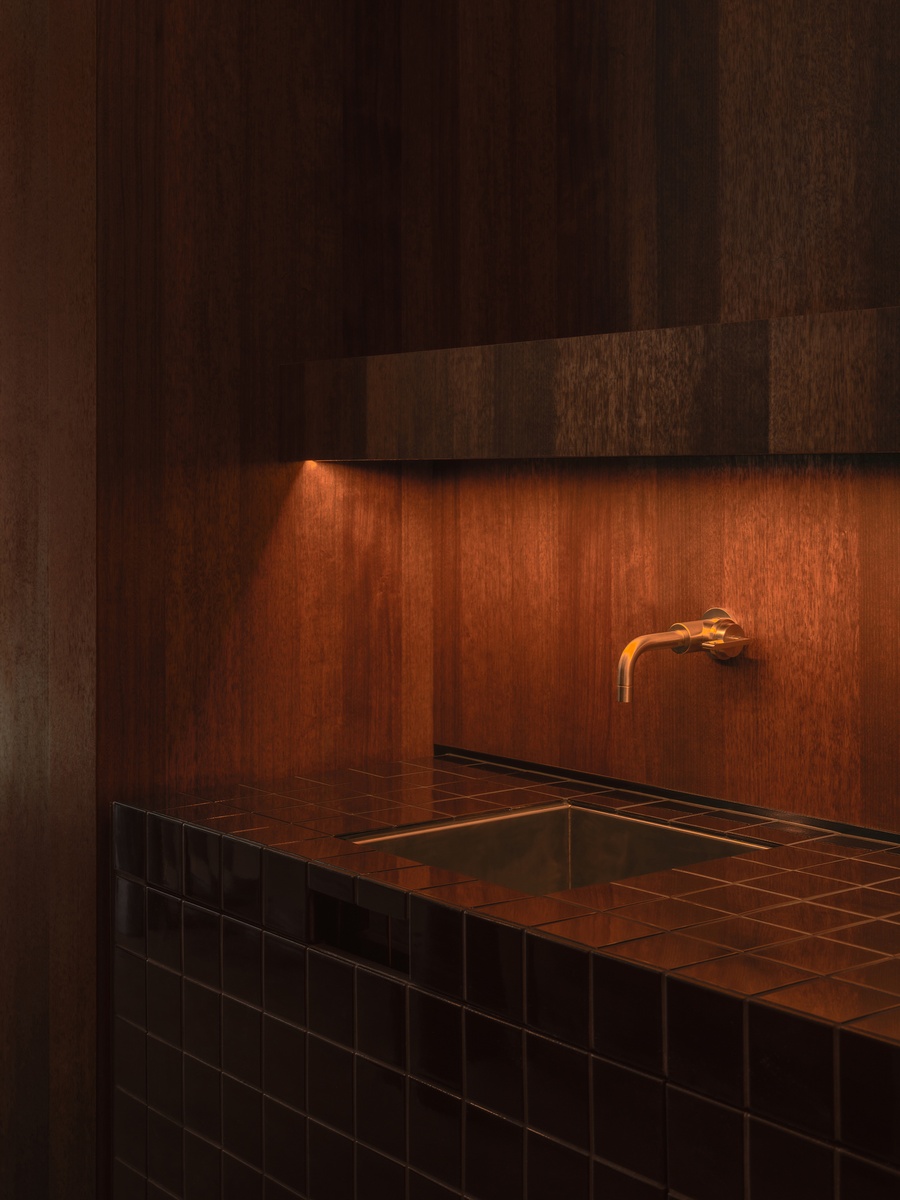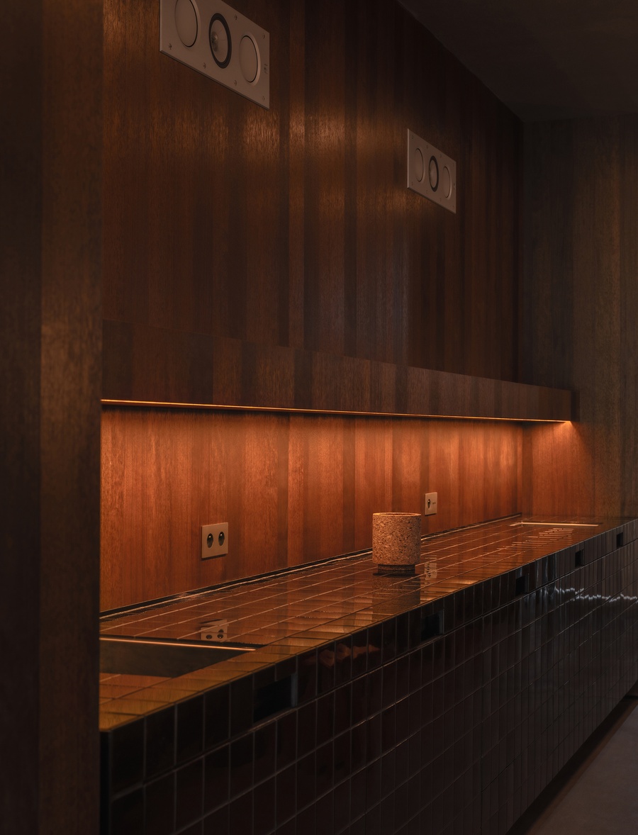 The Jane 的功能布局,在 “餐饮仪式感” 与 “就餐舒适度” 之间,实现了教科书级的平衡。就餐区的设计充满了 “场景的层次感”:长形的实木餐桌与黑色餐椅,营造出社交型的就餐氛围;半私密的卡座区,以布艺墙面与矮柜形成围合,满足食客对 “专属感” 的需求;料理台旁的吧台位,让食客能近距离观察烹饪过程,将 “美食体验” 延伸为 “感官的全维度参与”。这种布局既尊重了不同食客的社交偏好,又通过空间的序列感,强化了 “从入场到就餐” 的仪式感。辅助空间的设计则暗藏巧思:洗手间的深色瓷砖与铜质龙头,在灯光的映衬下如高级珠宝盒般精致;备餐区的金属与实木结合,将功能性与美观性融为一体。这些 “非就餐区” 的设计,并未因功能的辅助性而降低品质,反而以 “细节的一致性”,巩固了空间 “极致追求” 的整体调性。
