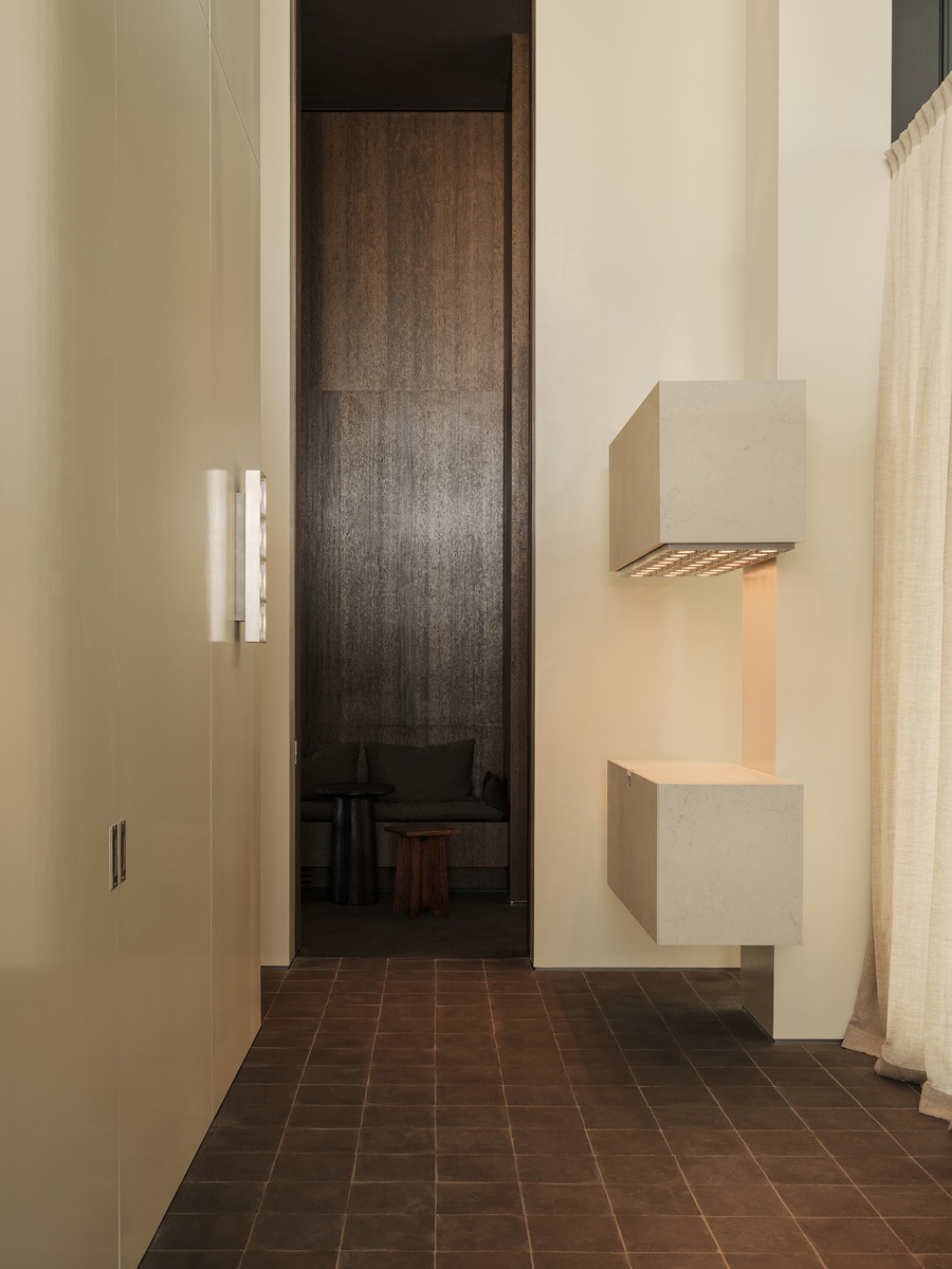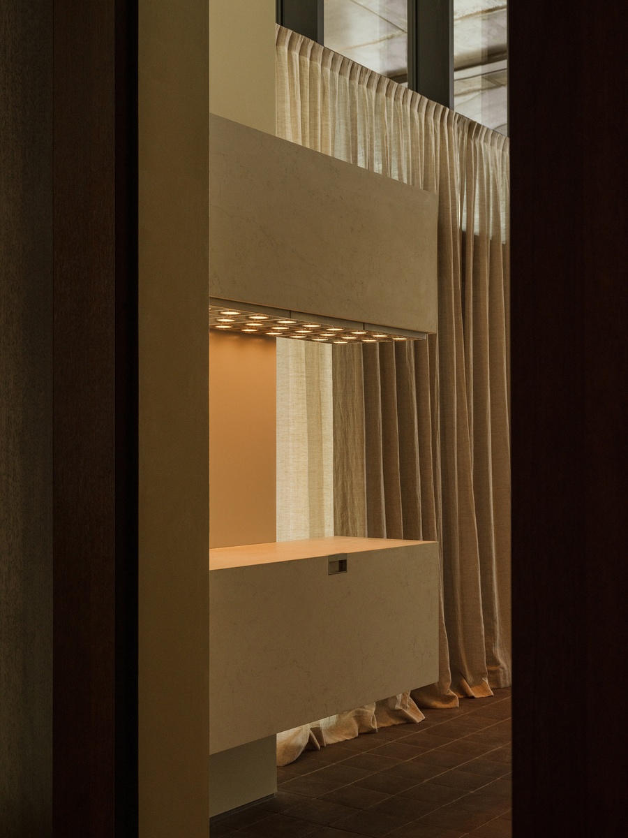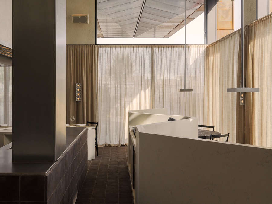 The Jane 的空间设计以 “大胆的野兽派框架” 为基底,建筑的几何感与粗犷肌理,传递出强烈的视觉张力。裸露的混凝土结构、厚重的金属构件,如雕塑般塑造出空间的力量感,这种 “粗粝感” 并非刻意的工业风复刻,而是为后续的 “柔美介入” 铺垫出戏剧化的反差语境。在野兽派的框架之下,设计师以 “诗意的柔美” 进行空间的温柔解构:米白色的布艺墙面如软质的画布,消解了混凝土的冰冷;垂坠的亚麻窗帘随光影浮动,为硬朗的空间注入流动的韵律;深棕色实木的细腻肌理,在金属与石材的包围中,成为触感与温度的锚点。这种 “刚与柔” 的碰撞,恰似美食创作中 “主料与辅料” 的平衡,让空间在视觉与触觉的维度,都充满了值得反复品味的层次。