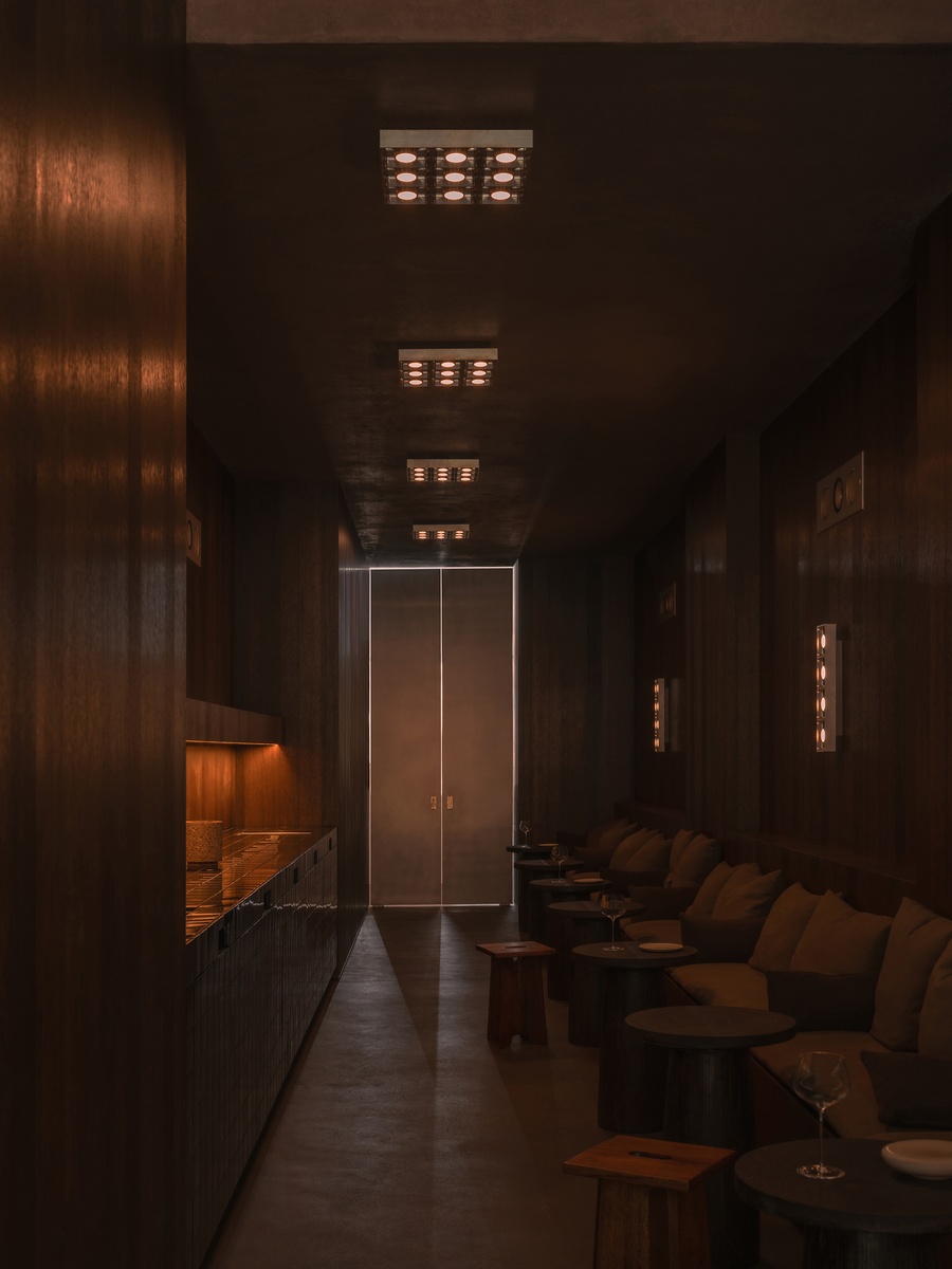 材质的选择与搭配,是 The Jane “极致追求” 的具象表达,它以 “粗粝与精巧的共生”,重新定义了高端餐饮空间的质感语言。粗犷材质的运用极具突破性:混凝土的原始孔洞、金属的氧化痕迹、深色瓷砖的颗粒感,这些带着 “不完美” 的肌理,打破了传统高端餐厅对 “精致材质” 的单一追求,反而以 “原始感” 传递出空间的真诚与力量。这种 “粗粝感” 并非粗放的敷衍,而是经过设计师对材质比例、拼接工艺的精准把控,最终呈现出 “克制的野性”。与之对话的精巧细节,则体现在对工艺的极致追求:实木家具的边缘经过手工打磨,触感温润如玉石;金属构件的接缝处严丝合缝,工艺精度堪比精密仪器;定制灯具的玻璃罩内,灯泡的排布与光影的折射角度,都经过反复调试。这种 “粗粝中的精巧”,恰如美食中的 “分子料理” 技法,让空间在 “原始与现代” 的维度,完成了一场关于 “质感” 的先锋实验。
